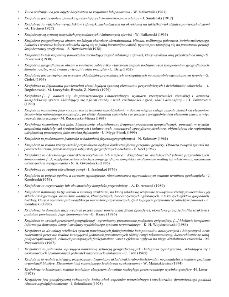 • To co widzimy i co jest objęte horyzontem to krajobraz lub panorama - W. Nalkowski (1901) • Krajobraz jest zespołem zjawisk reprezentujących środowisko przyrodnicze - J. Smoleński (1912) • Krajobraz to widzialny wyraz faktów i zjawisk, zachodzących na określonej na jakiejkolwiek działce powierzchni ziemi -A. Hettner(1927) • Krajobrazy są syntezą wszystkich przyrodniczych i kulturowych zjawisk - W. Nalkowski (1935) • Krajobraz geograficzny to obszar, na którym charakter ukształtowania, klimatu, roślinnego pokrowca, świnia zwierzęcego, ludności i wreszcie kultury człowieka łączą się w jedną harmonijną całość, typowo powtarzającą się na przestrzeni pewnej krajobrazowej strefy ziemi - S. Nowakowski(1938) • Krajobraz to taki na pewnej powierzchni zachodzący zespół substancji i zjawisk, który wyróŜnia ową przestrzeli od innej- S. Pawlowski(1938) • Krajobraz geograficzny to obszar o swoistym, sobie tylko właściwym zespole podstawowych komponentów geograficznych: klimatu, rzeźby, wód, świata zwierząt i roślin oraz gleb - L. Berg (1962) • Krajobraz jest zewnętrznym wyrazem składników przyrodniczych występujących na naturalnie ograniczonym terenie - G. Ciołek (1964) • Krajobraz to fizjonomia powierzchni ziemi będąca syntezą elementów przyrodniczych i działalności człowieka - i. Bogdanowski, M. Łuczyńska-Bruzda, Z. Nowak (1979) • Krajobraz [ . . .] odnosi się do przestrzennego i materialnego wymiaru rzeczywistości ziemskiej i oznacza kompleksowy system składający się z form rzeźby i wód, roślinności i gleb, skał i atmosfery - J.I. Zonneveld (1990) • Krajobraz rozumiemy jako naoczny wyraz istnienia współdziałania w danym miejscu całego zespołu zjawisk od elementów środowiska naturalnego poczynając, po efekty działania człowieka i to jeszcze z uwzględnieniem elementu czasu, a więc rozwoju historycznego - M. Ruszczycka-Mizera (1993) • Krajobraz rozumiany jest jako: historycznie ukształtowany fragment przestrzeni geograficznej, powstały w wyniku zespolenia oddziaływań środowiskowych i kulturowych, tworzących specyficzną strukturę, objawiającą się regionalną odrębnością postrzeganą jako swoista fizjonomia - U. Myga-Piątek (1999) • Krajobraz to podstawowa jednostka w badaniach fizycznogeograficznych - N. Soloncev (1961) • Krajobraz to realna rzeczywistość przyrodnicza będąca konkretną formą przejawu geosfery. Oznacza związek zjawisk na powierzchni ziemi, przedstawiający sobą istotę geograficznych obiektów - E. Neef (1967) • Krajobraz to określonego charakteru terytorium lub miejsce. Krajobraz to dialektycz'-2 ydność przyrodniczych komponentów [...], względnie jednorodne fizycznogeograficzne kompleksy analizowane według ich właściwości, niezaleŜnie od terytorium występowania - N. A. Gwozdiecki (1976) • Krajobraz to region określonej rangi -1. Isaćenko(1976) • Krajobraz to pojęcie ogólne, a zarazem typologiczne, równoznaczne z wprowadzonym ostatnio terminem geokompleks - J. Kondracki(1976) • Krajobraz to terytorialny lub akwatorialny kompleks przyrodniczy - A. D. Armand (1980) • Krajobraz naturalny to typ terenu o swoistej strukturze, na którą składa się wzajemne powiązanie rzeźby powierzchni i jej składu litologicznego, stosunków wodnych, klimatycznych, biocenotycznych i glebowych, a takŜe tych efektów gospodarki ludzkiej, których wyrazem jest modyfikacja warunków przyrodniczych, (jest to pojęcie przyrodnicze zobiektywizowane) - J. Kondracki (1980) • Krajobraz to dowolnie duŜy wycinek przestrzenny powierzchni Ziemi (geosfery), określany przez jednolitą strukturę i podobne powiązania jego komponentów -G. Haase (1986) • Krajobraz to wycinek przestrzeni geograficznej - ograniczony przestrzennie podsystem epigeosfery. [...] MoŜliwie kompletna informacja dotycząca istoty i struktury wydzielonego systemu terytorialnego - K. H. Wojciechowski (1986) • Krajobraz to dowolnej wielkości system powiązanych funkcjonalnie komponentów abiotycznych i biotycznych oraz tworzonych przez nie realnie istniejących jednostek przestrzennych róŜnej rangi taksonomicznej, hierarchicznie ze sobą podporządkowanych, równieŜ powiązanych funkcjonalnie, wraz z efektami wpływu na niego działalności człowieka - M. Przewoźniak (1987) • Krajobraz to jednostka opisująca konkretną sytuacją geograficzną jak i kategoria typologiczna, składająca się z elementarnych i jednorodnych jednostek nazywanych ekotopami - C. Troll (1965) • Krajobraz to realnie istniejący, przestrzenny, dynamiczny układ strukturalno-funkcjonalny na ponadekosystmalnym poziomie organizacji biosfery. Elementami tak rozumianego krajobrazu są ekosystemy - W. Matuszkiewicz (1974) • Krajobraz to konkretny, realnie istniejący ekosystem dowolnie rozległego przestrzennego wycinka geosfery -H. Leser (1978) • Krajobraz jest geosferyczną substancją, która obok aspektów materialnego i strukturalno-dynamicznego posiada równieŜ aspektfizjonomiczny - J. Schmilusen (1978) • Krajobraz to względnie zamknięty fragment przyrody, otoczony naturalnymi granicami i stanowiący całość dzięki zachodzącym w nim procesom i współzaleŜności budujących go geokompleksów - H. Barsch (1979) • Krajobraz to część epigeosfery (zewnętrznej sfery Ziemi) stanowiącą złoŜony przestrzennie geokompleks o swoistej strukturze i wewnętrznych powiązaniach - J. Kondracki, A. Richling (1983) • Krajobraz to skomplikowany, wielowymiarowy i wielo-cechowy system, składający się z geokomponentów i tworzonych przez nie krajobrazowych jednostek przestrzennych, za które tradycyjnie uwaŜa się geokomponenty lub coraz częściej - matryce, płaty, korytarze - R. T. Forman, M. Godron (1986) • Krajobraz to określony wycinek przestrzeni geograficznej, na którym panuje mozaika róŜnych ekosystemów i powierzchni zajętych przez urządzenia techniczne (zabudowę kubaturo