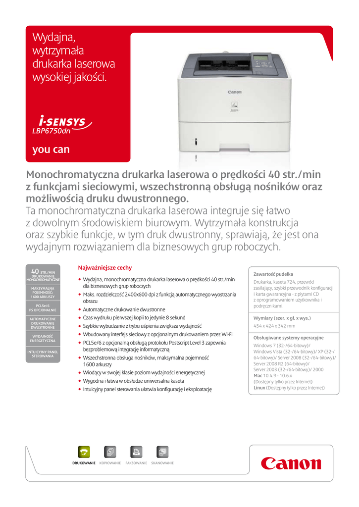 Wydajna, wytrzymała drukarka laserowa wysokiej jakości. you can Monochromatyczna drukarka laserowa o prędkości 40 str./min z funkcjami sieciowymi, wszechstronną obsługą nośników oraz możliwością druku dwustronnego. Ta monochromatyczna drukarka laserowa integruje się łatwo z dowolnym środowiskiem biurowym. Wytrzymała konstrukcja oraz szybkie funkcje, w tym druk dwustronny, sprawiają, że jest ona wydajnym rozwiązaniem dla biznesowych grup roboczych. 40 str./min drukowanie monochromatyczne Maksymalna pojemność: 1600 arkuszy PCL5e/6 PS opcjonalnie Automatyczne drukowanie dwustronne Wydajność energetyczna Intuicyjny panel sterowania Najważniejsze cechy monochromatyczna drukarka laserowa o prędkości 40 str./min • Wdlaydajna, biznesowych grup roboczych aks. rozdzielczość 2400x600 dpi z funkcją automatycznego wyostrzania • Mobrazu • Automatyczne drukowanie dwustronne • Czas wydruku pierwszej kopii to jedynie 8 sekund • Szybkie wybudzanie z trybu uśpienia zwiększa wydajność • Wbudowany interfejs sieciowy z opcjonalnym drukowaniem przez Wi-Fi CL5e/6 z opcjonalną obsługą protokołu Postscript Level 3 zapewnia • Pbezproblemową integrację informatyczną szechstronna obsługa nośników, maksymalna pojemność • W1600 arkuszy • Wiodący w swojej klasie poziom wydajności energetycznej • Wygodna i łatwa w obsłudze uniwersalna kaseta • Intuicyjny panel sterowania ułatwia konfigurację i eksploatację DRUKOWANIE KOPIOWANIE FAKSOWANIE SKANOWANIE Zawartość pudełka Drukarka, kaseta 724, przewód zasilający, szybki przewodnik konfiguracji i karta gwarancyjna - z płytami CD z oprogramowaniem użytkownika i podręcznikami. Wymiary (szer. x gł. x wys.) 454 x 424 x 342 mm Obsługiwane systemy operacyjne Windows 7 (32-/64-bitowy)/ Windows Vista (32-/64-bitowy)/ XP (32-/ 64-bitowy)/ Server 2008 (32-/64-bitowy)/ Server 2008 R2 (64-bitowy)/ Server 2003 (32-/64-bitowy)/ 2000 Mac 10.4.9 - 10.6.x (Dostępny tylko przez Internet) Linux (Dostępny tylko przez Internet) 1 1 5-wierszowy wyświetlacz LCD 2 2 Podajnik uniwersalny na 100 arkuszy Specyfikacja produktu Mechanizm drukarki Szybkość drukowania Metoda drukowania Jakość drukowania Rozdzielczość drukowania Czas rozgrzewania Czas druku pierwszej strony Cykl pracy Marginesy wydruku Obsługa nośników Podajnik papieru (standardowy) Podajnik papieru (opcjonalny) Odbiornik papieru Typy nośników Rozmiary nośników Gramatura nośników Charakterystyka ogólna Wymagania dotyczące zasilania Pobór mocy Poziom hałasu Wymiary (szer. x gł. x wys.) Masa Środowisko pracy Panel sterowania 3 Kaseta o pojemności 500 arkuszy 4 Opcjonalnie 2 x kaseta na 500 arkuszy 3 5 0 str./min w trybie monochromatycznym (A4) 4 Monochromatyczne drukowanie laserowe Maks. 2400 x 600 dpi z funkcją automatycznego wyostrzania obrazu Maks. 600 x 600 dpi do 14 sekund 8 sekund Maks. 100 000 stron miesięcznie 5 mm górny, dolny, lewy i prawy [koperta: 10 mm] aseta o pojemności 500 arkuszy K Podajnik uniwersalny na 100 arkuszy Kaseta o pojemności 500 arkuszy x 2 250 arkuszy wydrukiem do dołu, 50 arkuszy wydrukiem do góry Papier zwykły, o podwyższonej gramaturze, folia przezroczysta, etykiety, karty katalogowe, koperty Kaseta (standardowa i opcjonalna): A4, B5, A5, A6, LGL, LTR, Executive, 16K, 8,5" × 13", Formaty niestandardowe: szerokość 105–215,9 mm x wysokość 148–355,6 mm Podajnik uniwersalny: A4, B5, A5, A6, LGL, LTR, Executive, 16K, 8,5" × 13", Rozmiary niestandardowe: szerokość 76,2~215,9 mm x wysokość 127~355,6 mm Kaseta (standardowa i opcjonalna): od 60 do 120 g/m2 Podajnik uniwersalny: od 60 do 199 g/m2 20-240 V (±10%) 50/60 Hz (±2 Hz) 2 Maksymalnie: do ok. 1270 W Praca: ok. 630 W Tryb gotowości: ok. 13 W Tryby uśpienia: ok. 13 W (Tryb uśpienia 1), ok. 5,6 W (Tryb uśpienia 2), ok. 2 W (Tryb uśpienia 3) Typowy pobór energii elektrycznej (TEC): 2,0 kWh/tydzień Moc akustyczna1: Praca: do 7,3 B Tryb gotowości: poniżej poziomu słyszalności Ciśnienie akustyczne1: Praca: do 55 dB(A) Tryb gotowości: poniżej poziomu słyszalności 454 mm x 424 mm x 342 mm ok. 16,7 kg Temperatura od +10 do 30°C (od 50 do 86ºF). Wilgotność: od 20% do 80% wilgotności względnej [bez kondensacji] 5-wierszowy wyświetlacz LCD 9 wskaźników LED 10 przycisków obsługi 5 K aseta 724 (opcjonalnie dostępna jest kaseta wysokiej wydajności) 4 Kontroler Szybkość procesora Pamięć Języki obsługi drukarki Czcionki Interfejs i opcje połączeń Zgodność z systemami operacyjnymi Materiały eksploatacyjne Kasety uniwersalne Akcesoria / elementy dodatkowe Elementy 333 MHz 28 MB z możliwością rozbudowy do 384 MB 1 UFRII (Ultra Fast Rendering), PCL5e, PCL6, emulacja PostScript Level 3 (opcjonalnie)3 93 czcionki skalowalne, 10 czcionek bitmapowych, 80 czcionek PS (opcja) USB 2.0 High-Speed, 10BASE-T/100BASE-TX, bezprzewodowy serwer druku IEEE802.11b/g (opcjonalnie) Win 7 (32-/64-bitowy)/ Win Vista (32-/64-bitowy)/ XP (32-/64-bitowy)/ Server 2008 (32-/64-bitowy)/ Server 2008 R2 (64-bitowy)/ Server 2003 (32-/64-bitowy)/ 2000 Mac OS10.4.9 - 10.6.x2/Linux2 Standardowa: kaseta 724 (6000 stron4) Wysokiej wydajności: kaseta 724H (12 500 stron4) Podajnik papieru PF-45 (kaseta na 500 arkuszy) ER-64 (64 MB RAM), ER-128 (128 MB RAM), ER-256 (256 MB RAM) PS ROM-A45 (moduł ROM emulacji PostScript 3) PS/Barcode ROM-A45 (moduł ROM emulacji PostScript 3 i kodów paskowych) Karta interfejsu sieci bezprzewodowej NB-W2 (bezprzewodowy serwer druku IEEE802.11b/g) Niektóre obrazy są symulowane w celu uzyskania wyrazistego odwzorowania. Wszystkie dane oparto na standardowych metodach testowania stosowanych przez firmę Canon. Niniejsza ulotka i podane w niej dane techniczne zostały opracowane przed datą premiery produktu. Dane końcowe mogą ulec zmianie bez powiadomienia. ™ oraz ®: Wszystkie nazwy firm i/lub produktów są znakami towarowymi i/lub zastrzeżonymi znakami towarowymi odpowiednich producentów na terenie ich 