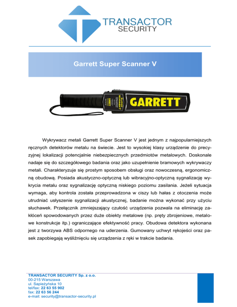 Garrett Super Scanner V Wykrywacz metali Garrett Super Scanner V jest jednym z najpopularniejszych ręcznych detektorów metalu na świecie. Jest to wysokiej klasy urządzenie do precyzyjnej lokalizacji potencjalnie niebezpiecznych przedmiotów metalowych. Doskonale nadaje się do szczegółowego badania oraz jako uzupełnienie bramowych wykrywaczy metali. Charakteryzuje się prostym sposobem obsługi oraz nowoczesną, ergonomiczną obudową. Posiada akustyczno-optyczną lub wibracyjno-optyczną sygnalizację wykrycia metalu oraz sygnalizację optyczną niskiego poziomu zasilania. Jeżeli sytuacja wymaga, aby kontrola została przeprowadzona w ciszy lub hałas z otoczenia może utrudniać usłyszenie sygnalizacji akustycznej, badanie można wykonać przy użyciu słuchawek. Przełącznik zmniejszający czułość urządzenia pozwala na eliminację zakłóceń spowodowanych przez duże obiekty metalowe (np. pręty zbrojeniowe, metalowe konstrukcje itp.) ograniczające efektywność pracy. Obudowa detektora wykonana jest z tworzywa ABS odpornego na uderzenia. Gumowany uchwyt rękojeści oraz pasek zapobiegają wyśliźnięciu się urządzenia z ręki w trakcie badania. TRANSACTOR SECURITY Sp. z o.o. 00-215 Warszawa ul. Sapieżyńska 10 tel/fax: 22 63 55 902 fax: 22 63 56 244 e-mail: [email protected] WŁAŚCIWOŚCI: - Wysoka czułość - Autokalibracja - brak konieczności strojenia - Obsługa jednym przełącznikiem - Możliwość wykrycia średniej wielkości pistoletu z odległości ok. 20cm, noża kieszonkowego z ok. 15 cm, ostrza brzytwy lub nożyka tapicerskiego z ok. 7 cm, drobnej biżuterii z ok. 2-3 cm - Duża powierzchnia sondy detekcyjnej umożliwiająca szybkie i dokładne przeszukiwanie - Możliwość cichego przeszukiwania (przy użyciu słuchawek) - Przycisk do eliminacji wpływu pobliskich konstrukcji metalowych takich jak zbrojenia w podłodze, metalowe ściany, pręty itp. - Sygnalizacja wykrycia metalu: sygnałem dźwiękowym i diodą LED lub wibracyjnie - Wymiana baterii bez użycia narzędzi - Sygnalizacja diodowa włączonego zasilania i słabych baterii - Ergonomiczna i estetyczna obudowa ABS odporna na uderzenia - Wzmocniona sonda detekcyjna - Wyrób zgodny z normami kompatybilności elektromagnetycznej ECM - Indywidualny numer seryjny SPECYFIKACJA: Częstotliwość robocza 53 kHZ Częstotliwość alarmu 2 kHz, przerywany Strojenie automatyczne Sygnalizacja wykrycia metalu optyczno - akustyczna lub optyczno - wibra- cyjna Sygnalizacja rozładowania baterii optyczna Warunki pracy -37 ~ +70 °C , < 95% rh bez kondensacji TRANSACTOR SECURITY Sp. z o.o. 00-215 Warszawa ul. Sapieżyńska 10 tel/fax: 22 63 55 902 fax: 22 63 56 244 e-mail: [email protected] Warunki przechowywania -10 ~ +60°C bez baterii, < 80% rh bez kondensacji Zasilanie 9 V bateria alkaliczna lub akumulator Ni-MH Klasyfikacja IP IP54 Kompatybilność elektromagnetyczna znak CE Wymiary Szerokość 83 mm Grubość 41 mm Długość 420 mm Waga (bez baterii) TRANSACTOR SECURITY Sp. z o.o. 00-215 Warszawa ul. Sapieżyńska 10 tel/fax: 22 63 55 902 fax: 22 63 56 244 e-mail: [email protected] 500 g.