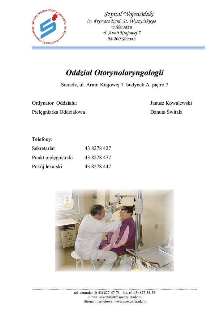 Szpital Wojewódzki im. Prymasa Kard. St. Wyszyńskiego w Sieradzu ul. Armii Krajowej 7 98-200 Sieradz Oddział Otorynolaryngologii Sieradz, ul. Armii Krajowej 7 budynek A piętro 7 Ordynator Oddziału: Janusz Kowalewski Pielęgniarka Oddziałowa : Danuta Świtała Telefony: Sekretariat 43 8278 427 Punkt pielęgniarski 43 8278 477 Pokój lekarski 43 8278 447 ............................................................................................................................................................................... tel. centrala: (0-43) 827-57-71 fax. (0-43) 827-54-52 e-mail: [email protected] Strona internetowa: www.spzozsieradz.pl