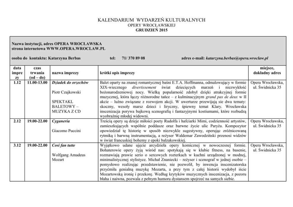 KALENDARIUM WYDARZEŃ KULTURALNYCH OPERY WROCŁAWSKIEJ GRUDZIEŃ 2015 Nazwa instytucji, adres OPERA WROCŁAWSKA strona internetowa WWW.OPERA.WROCLAW.PL osoba do kontaktu: Katarzyna Berbas data impre zy 1.12 czas trwania (od – do) 11.00-13.00 Dziadek do orzechów Balet oparty na znanej romantycznej baśni E.T.A. Hoffmanna, odmalowujący w formie XIX-wiecznego divertissement świat dziecięcych marzeń i niezwykłość bożonarodzeniowej nocy. Wielką popularność zdobył dzięki atrakcyjnej formie muzycznej, która łączy różnorodne tańce – z kulminacyjnym grand pas de deux w II akcie – luźno związane z rozwojem akcji. W uwerturze przewijają sie dwa tematy: skoczny, wesoły marsz dzieci i liryczny, śpiewny temat Klary. Wrocławska inscenizacja porywa bajkową scenografią i fantazyjnymi kostiumami, które rozbudzą wyobraźnię młodej widowni. Treścią opery są dzieje miłości poety Rudolfa i hafciarki Mimi, codzienność artystów, zamieszkujących wspólnie poddasze oraz barwne życie ulic Paryża. Kompozytor opowiedział tę historię w sposób niezwykle sugestywny, operując zróżnicowaną rytmiką i barwną instrumentacją, a reżyser Waldemar Zawodziński przenosi widzów w świat francuskiej bohemy z epoki balzakowskiej. Wyjątkowo udane ujęcie arcydzieła opery komicznej w nowoczesnej formie. Bohaterowie opery żyją wśród nas: spotykają się w klubie fitness, na basenie, rozmawiają prawie serio o sercowych rozterkach w kuchni urządzonej w modnej, minimalistycznej stylistyce. Michał Znaniecki – reżyser i scenograf w jednej osobie – pomysłowo realizując przedstawienie, nie pozwolił, by inwencja inscenizatorska przyćmiła genialną muzykę Mozarta, a przy tym z całej historii wydobył iście Mozartowską ironię i przekorę. Według krytyków muzycznych inscenizacja, z pozoru błaha i naiwna, pozwala z pełnym humoru dystansem spojrzeć na samych siebie. Cyganeria Giacomo Puccini 3.12 19.00-22.00 adres e-mail: [email protected] krótki opis imprezy SPEKTAKL BALETOWY – MUZYKA Z CD 19.00-22.00 71/ 370 89 08 nazwa imprezy Piotr Czajkowski 2.12 tel: Cosi fan tutte Wolfgang Amadeus Mozart miejsce, dokładny adres Opera Wrocławska, ul. Świdnicka 35 Opera Wrocławska, ul. Świdnicka 35 Opera Wrocławska, ul. Świdnicka 35 KALENDARIUM WYDARZEŃ KULTURALNYCH OPERY WROCŁAWSKIEJ GRUDZIEŃ 2015 4.12 19.00-22.00 Otello Giuseppe Verdi 5.12 11.00-13.00 18.00-20.00 Dziadek do orzechów Piotr Czajkowski SPEKTAKL BALETOWY – MUZYKA Z CD 6.12 11.00-13.00 17.00-19.00 Dziadek do orzechów Piotr Czajkowski SPEKTAKL BALETOWY – MUZYKA Z CD 8.12 11.00-13.00 Dziadek do orzechów Otello, słynny bohater tragedii Szekspira i jednocześnie tytuł jednej z najwspanialszych oper wszechczasów. Giuseppe Verdi, niekwestionowany król włoskiej opery XIX wieku, swojego Otella ukończył w 1886 r., dając światu prawdziwe arcydzieło, wykonane po raz pierwszy w następnym roku na scenie mediolańskiej La Scali. Niemały udział w sukcesie utworu miał również librecista Arrigo Boito, utalentowany poeta i kompozytor operowy. Otello to jeden z ostatnich triumfów włoskiego Mistrza, przynoszący zachwycającą syntezę jego stylu, zbliżającego się tutaj do niektórych założeń dramatu muzycznego Wagnera. Porywająca muzyka Verdiego, genialny pierwowzór literacki i świetne libretto pozwalają na nowo ujrzeć tragedię Desdemony i Otella, padających ofiarą intryg podstępnego Jagona. Tytułowa partia tenorowa uchodzi za najtrudniejszą w literaturze operowej, wymaga wielkiego, dramatycznego głosu, ogromne wymagania kompozytor postawił także przed dyrygentem, orkiestrą i pozostałymi śpiewakami. Szczyty późnoromantycznego teatru operowego. Balet oparty na znanej romantycznej baśni E.T.A. Hoffmanna, odmalowujący w formie XIX-wiecznego divertissement świat dziecięcych marzeń i niezwykłość bożonarodzeniowej nocy. Wielką popularność zdobył dzięki atrakcyjnej formie muzycznej, która łączy różnorodne tańce – z kulminacyjnym grand pas de deux w II akcie – luźno związane z rozwojem akcji. W uwerturze przewijają sie dwa tematy: skoczny, wesoły marsz dzieci i liryczny, śpiewny temat Klary. Wrocławska inscenizacja porywa bajkową scenografią i fantazyjnymi kostiumami, które rozbudzą wyobraźnię młodej widowni. Balet oparty na znanej romantycznej baśni E.T.A. Hoffmanna, odmalowujący w formie XIX-wiecznego divertissement świat dziecięcych marzeń i niezwykłość bożonarodzeniowej nocy. Wielką popularność zdobył dzięki atrakcyjnej formie muzycznej, która łączy różnorodne tańce – z kulminacyjnym grand pas de deux w II akcie – luźno związane z rozwojem akcji. W uwerturze przewijają sie dwa tematy: skoczny, wesoły marsz dzieci i liryczny, śpiewny temat Klary. Wrocławska inscenizacja porywa bajkową scenografią i fantazyjnymi kostiumami, które rozbudzą wyobraźnię młodej widowni. Balet oparty na znanej romantycznej baśni E.T.A. Hoffmanna, odmalowujący w formie XIX-wiecznego divertissement świat dziecięcych marzeń i niezwykłość Opera Wrocławska, ul. Świdnicka 35 Opera Wrocławska, ul. Świdnicka 35 Opera Wrocławska, ul. Świdnicka 35 Opera Wrocławska, ul. Świdnicka 35 KALENDARIUM WYDARZEŃ KULTURALNYCH OPERY WROCŁAWSKIEJ GRUDZIEŃ 2015 Piotr Czajkowski SPEKTAKL BALETOWY – MUZYKA Z CD 9.12 19.00-22.00 Eugeniusz Oniegin Piotr Czajkowski 10.12 19.00-21.20 Kwartet Ronald Harwood 19.12 19.00 Madame Butterfly Giacomo Puccini PREMIERA bożonarodzeniowej nocy. Wielką popularność zdobył dzięki atrakcyjnej formie muzycznej, która łączy różnorodne tańce – z kulminacyjnym grand pas de deux w II akcie – luźno związane z rozwojem akcji. W uwerturze przewijają sie dwa tematy: skoczny, wesoły marsz dzieci i liryczny, śpiewny temat Klary. Wrocławska inscenizacja porywa bajkową scenografią i fantazyjnymi kostiumami, które rozbudzą wyobraźnię młodej widowni. Eugeniusz Oniegin, sceny liry