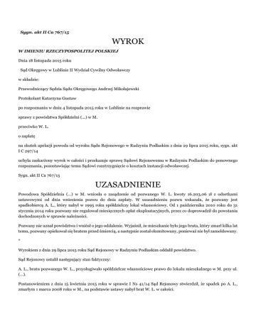 Sygn. akt II Ca 767/15 WYROK W IMIENIU RZECZYPOSPOLITEJ POLSKIEJ Dnia 18 listopada 2015 roku Sąd Okręgowy w Lublinie II Wydział Cywilny Odwoławczy w składzie: Przewodniczący Sędzia Sądu Okręgowego Andrzej Mikołajewski Protokolant Katarzyna Gustaw po rozpoznaniu w dniu 4 listopada 2015 roku w Lublinie na rozprawie sprawy z powództwa Spółdzielni (...) w M. przeciwko W. L. o zapłatę na skutek apelacji powoda od wyroku Sądu Rejonowego w Radzyniu Podlaskim z dnia 29 lipca 2015 roku, sygn. akt I C 297/14 uchyla zaskarżony wyrok w całości i przekazuje sprawę Sądowi Rejonowemu w Radzyniu Podlaskim do ponownego rozpoznania, pozostawiając temu Sądowi rozstrzygnięcie o kosztach instancji odwoławczej. Sygn. akt II Ca 767/15 UZASADNIENIE Powodowa Spółdzielnia (...) w M. wniosła o zasądzenie od pozwanego W. L. kwoty 16.203,06 zł z odsetkami ustawowymi od dnia wniesienia pozwu do dnia zapłaty. W uzasadnieniu pozwu wskazała, że pozwany jest spadkobiercą A. L., który nabył w 1995 roku spółdzielczy lokal własnościowy. Od 1 października 2010 roku do 31 stycznia 2014 roku pozwany nie regulował miesięcznych opłat eksploatacyjnych, przez co doprowadził do powstania dochodzonych w sprawie należności. Pozwany nie uznał powództwa i wniósł o jego oddalenie. Wyjaśnił, że mieszkanie było jego brata, który zmarł kilka lat temu, pozwany opiekował się bratem przed śmiercią, a następnie został eksmitowany, ponieważ nie był zameldowany. * Wyrokiem z dnia 29 lipca 2015 roku Sąd Rejonowy w Radzyniu Podlaskim oddalił powództwo. Sąd Rejonowy ustalił następujący stan faktyczny: A. L., bratu pozwanego W. L., przysługiwało spółdzielcze własnościowe prawo do lokalu mieszkalnego w M. przy ul. (...). Postanowieniem z dnia 15 kwietnia 2015 roku w sprawie I Ns 41/14 Sąd Rejonowy stwierdził, że spadek po A. L., zmarłym 1 marca 2008 roku w M., na podstawie ustawy nabył brat W. L. w całości. Sąd Rejonowy wskazał, że powyższy stan faktyczny jest bezsporny. W tak ustalonym stanie faktycznym Sąd Rejonowy oddalił powództwo jako nieudowodnione. Na podstawie art. 4 ust. 1 i 11 ustawy o spółdzielniach mieszkaniowych, członkowie spółdzielni, którym przysługują spółdzielcze prawa do lokali, są obowiązani uczestniczyć w pokrywaniu kosztów związanych z eksploatacją i utrzymaniem nieruchomości w częściach przypadających na ich lokale, eksploatacją i utrzymaniem nieruchomości stanowiących mienie spółdzielni przez uiszczanie opłat zgodnie z postanowieniami statutu; osoby niebędące członkami spółdzielni, którym przysługują spółdzielcze własnościowe prawa do lokali, są obowiązane uczestniczyć w pokrywaniu kosztów związanych z eksploatacją i utrzymaniem nieruchomości w częściach przypadających na ich lokale, eksploatacją i utrzymaniem nieruchomości stanowiących mienie spółdzielni przez uiszczanie opłat na takich samych zasadach, jak członkowie spółdzielni, z zastrzeżeniem art. 5 tej ustawy. Zgodnie z art. 6 k.c. ciężar udowodnienia faktu spoczywa na osobie, która z faktu tego wywodzi skutki prawne. Na podstawie art. 229 k.p.c. nie wymagają dowodu fakty przyznane w toku postępowania przez stronę przeciwną, jeżeli przyznanie nie budzi wątpliwości, a nadto w myśl art. 230 k.p.c., gdy strona nie wypowie się co do twierdzeń strony przeciwnej o faktach, sąd, mając na uwadze wyniki całej rozprawy, może fakty te uznać za przyznane. Pozwany nie uznał powództwa i przyznał jedynie, że jego bratu przysługiwało prawo do lokalu oraz że jest spadkobiercą brata. Nie przyznał natomiast istnienia i wysokości zadłużenia z tytułu „opłat eksploatacyjnych”, wobec czego powoda obciążał ciężar dowodu w tym zakresie. Na tę okoliczność powód przedstawił dowód w postaci „księgowego wyliczenia wysokości zaległości” (k. 13). Na wezwanie przestawił ponadto wydruki „kartoteki czynszowej” mieszkania przy ul. (...) (k. 30-40, 57-63), podpisane przez księgową A. K.. W sensie procesowym te dowody są dowodami z dokumentów prywatnych; dokument prywatny stanowi zaś dowód tego, że osoba, która go podpisała, złożyła oświadczenie zawarte w dokumencie (art. 245 k.p.c.), ale nie tego, co zostało w nich stwierdzone. To, że księgowa, będąca pracownikiem powoda, czy też świadcząca na jego rzecz usługi, złożyła oświadczenie, że zobowiązanie pozwanego wynosi 16.203,06 zł w okresie od 1 października 2010 roku do 31 stycznia 2014 roku (k. 13), względnie szereg oświadczeń z rozbiciem na wiele pozycji, określanych między innymi jako „obciążenie za”, „rozliczenie wody”, „rozliczenie niedoborów”, „koszty KM 32/11”, „odsetki za zwłokę”, „I Nc 894/10 koszty postępowania”, „klauzula wykonalności”, w postaci wydruków komputerowych z ręcznymi dopiskami, bliżej nieokreślonymi, nie może stanowić podstawy ustalenia przez Sąd w toku procesu, że zadłużenie takie istniało faktycznie i powinno być zasądzone na rzecz powoda. Nie wiadomo, na jakiej podstawie i w jakiej wysokości ustalane były obciążające ewentualnie pozwanego opłaty eksploatacyjne. Nie wiadomo, jak kwestię tę reguluje statut spółdzielni i czy były podejmowane jakiekolwiek uchwały w tym zakresie. Powód powinien wykazać precyzyjnie sposób obliczenia wszystkich składników opłat, wraz z podstawą takich obliczeń, czego nie uczynił, ograniczając się do przedstawienia niejasnych wydruków, nie wiadomo na jakiej podstawie opartych, z ręcznymi dopiskami. Wobec takiego, nader niejasnego i trudnego do zweryfikowania określenia przez powoda sposobu wyliczenia żądanej kwoty, nie można też przyjąć, że niewypowiedzenie się pozwanego w tym zakresie może zostać uznane za przyznanie przez pozwanego tej okoliczności. Sąd Rejonowy nie prowadził z urzędu postępowania dowodowego na tę okoliczność, mając na uwadze, iż w aktualnie obowiązują