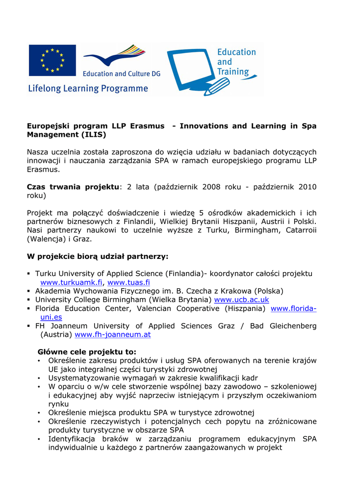Europejski program LLP Erasmus Management (ILIS) - Innovations and Learning in Spa Nasza uczelnia została zaproszona do wzięcia udziału w badaniach dotyczących innowacji i nauczania zarządzania SPA w ramach europejskiego programu LLP Erasmus. Czas trwania projektu: 2 lata (październik 2008 roku - październik 2010 roku) Projekt ma połączyć doświadczenie i wiedzę 5 ośrodków akademickich i ich partnerów biznesowych z Finlandii, Wielkiej Brytanii Hiszpanii, Austrii i Polski. Nasi partnerzy naukowi to uczelnie wyższe z Turku, Birmingham, Catarroii (Walencja) i Graz. W projekcie biorą udział partnerzy: Turku University of Applied Science (Finlandia)- koordynator całości projektu www.turkuamk.fi, www.tuas.fi Akademia Wychowania Fizycznego im. B. Czecha z Krakowa (Polska) University College Birmingham (Wielka Brytania) www.ucb.ac.uk Florida Education Center, Valencian Cooperative (Hiszpania) www.floridauni.es FH Joanneum University of Applied Sciences Graz / Bad Gleichenberg (Austria) www.fh-joanneum.at Główne cele projektu to: • Określenie zakresu produktów i usług SPA oferowanych na terenie krajów UE jako integralnej części turystyki zdrowotnej • Usystematyzowanie wymagań w zakresie kwalifikacji kadr • W oparciu o w/w cele stworzenie wspólnej bazy zawodowo – szkoleniowej i edukacyjnej aby wyjść naprzeciw istniejącym i przyszłym oczekiwaniom rynku • Określenie miejsca produktu SPA w turystyce zdrowotnej • Określenie rzeczywistych i potencjalnych cech popytu na zróżnicowane produkty turystyczne w obszarze SPA • Identyfikacja braków w zarządzaniu programem edukacyjnym SPA indywidualnie u każdego z partnerów zaangażowanych w projekt • • Stworzenie programu szkoleniowego (modułów edukacyjnych) dla przyszłych kadr SPA, uwzględniającego szeroki wachlarz zarówno wiedzy jak i umiejętności Pogłębianie wiedzy i rozpowszechnianie informacji na temat problematyki SPA (głównie w zakresie zarządzania) poprzez publikacje badań partnerów projektu oraz innych zaangażowanych instytucji. Rezultatem prac zespołów będzie raport zawierający najnowsze badania rynku SPA, które zostaną wykorzystane w stworzeniu modułów nauczania w systemie e-learning, w pracach naukowych, publikacjach, które znajdują się w obszarze zainteresowań zarówno środowisk akademickich jak i biznesowych. Pozwoli to na usprawnienia zarówno w zakresie szkolenia jak i zarządzania SPA, co zwiększy konkurencyjność na światowym rynku turystyki zdrowotnej europejskich uzdrowisk i innych ośrodkom SPA. Projekt obejmuje 6 pakietów zadań, z których każdy nadzoruje jeden z partnerów. Nasza uczelnia odpowiada za pakiet nr 6. 1. Zarządzanie całością prac w ramach projektu 2. Analiza koncepcji SPA i badania marketingowe w kierunku ustalenia stanu faktycznego i oczekiwań klientów 3. Zaprojektowanie i przetestowanie modułów edukacyjnych e-learning 4. Zarządzanie jakością kompletnego projektu 5. Rozpropagowanie wyników wśród partnerów i w branży SPA 6. Wykorzystanie rezultatów badań poprzez: publikacje w periodykach naukowych i prasie branżowej, organizacja konferencji i dystrybucja modułów edukacyjnych Zespół pracujący nad projektem: Prof. Tadeusz Kasperczyk – opiekun naukowy Mgr Mikołaj Bielański (Zakład Obsługi Ruchu Turystycznego) Mgr Iwona Jakosz (Zakład Obsługi Ruchu Turystycznego) Mgr Małgorzata Berwecka (Zakład Odnowy Psychosomatycznej) Mgr Agata Pluszyńska (Zakład Odnowy Psychosomatycznej) Magdalena Górnisiewicz (V rok TiR, sp.: Odnowa Psychosomatyczna) Pierwsze spotkanie partnerów w Finlandii (Turku) w dniach 1619.11.2008. W pierwszym spotkaniu partnerów, które odbyło się w Finlandii (Turku) w dniach 16-19.11.2008 wzięli udział pracownicy Instytutu Turystyki i Rekreacji (Zakładu Obsługi Ruchu Turystycznego): mgr I. Jakosz i mgr M. Bielański. Przedstawili oni stan badań dotyczących SPA, balneologii, uzdrowisk, usług, zarządzania i kształcenia kadr w tym obszarze oraz zaprezentowali także naszą uczelnię, kierunki kształcenia, partnerów biznesowych i pracowników zaangażowanych w prace nad projektem. Dokumentacja fotograficzna Prezentacja uczelni (mgr Iwona Jakosz) Prezentacja koncepcji badawczych dot. SPA (prowadzący prof. Kai Illing z Austrii) Prezentacja stanu badań w obszarze SPA (mgr Mikołaj Bielański) Turku – Rzeka Aura