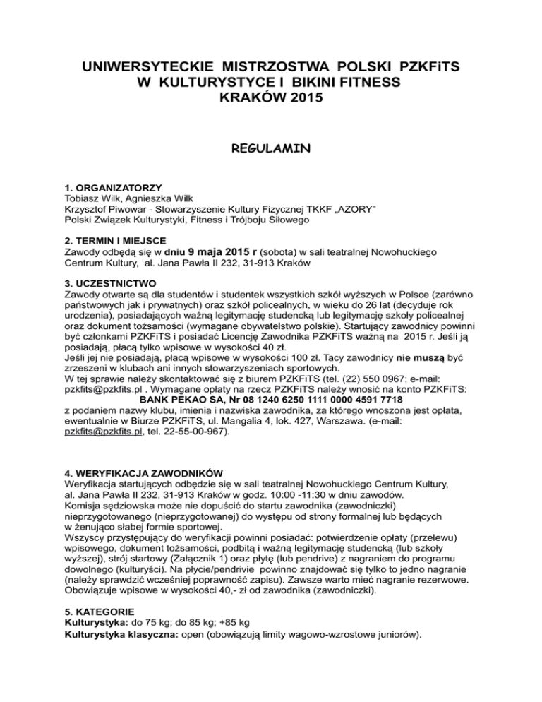 UNIWERSYTECKIE MISTRZOSTWA POLSKI PZKFiTS W KULTURYSTYCE I BIKINI FITNESS KRAKÓW 2015 REGULAMIN 1. ORGANIZATORZY Tobiasz Wilk, Agnieszka Wilk Krzysztof Piwowar - Stowarzyszenie Kultury Fizycznej TKKF „AZORY” Polski Związek Kulturystyki, Fitness i Trójboju Siłowego 2. TERMIN I MIEJSCE Zawody odbędą się w dniu 9 maja 2015 r (sobota) w sali teatralnej Nowohuckiego Centrum Kultury, al. Jana Pawła II 232, 31-913 Kraków 3. UCZESTNICTWO Zawody otwarte są dla studentów i studentek wszystkich szkół wyższych w Polsce (zarówno państwowych jak i prywatnych) oraz szkół policealnych, w wieku do 26 lat (decyduje rok urodzenia), posiadających ważną legitymację studencką lub legitymację szkoły policealnej oraz dokument tożsamości (wymagane obywatelstwo polskie). Startujący zawodnicy powinni być członkami PZKFiTS i posiadać Licencję Zawodnika PZKFiTS ważną na 2015 r. Jeśli ją posiadają, płacą tylko wpisowe w wysokości 40 zł. Jeśli jej nie posiadają, płacą wpisowe w wysokości 100 zł. Tacy zawodnicy nie muszą być zrzeszeni w klubach ani innych stowarzyszeniach sportowych. W tej sprawie należy skontaktować się z biurem PZKFiTS (tel. (22) 550 0967; e-mail: [email protected] . Wymagane opłaty na rzecz PZKFiTS należy wnosić na konto PZKFiTS: BANK PEKAO SA, Nr 08 1240 6250 1111 0000 4591 7718 z podaniem nazwy klubu, imienia i nazwiska zawodnika, za którego wnoszona jest opłata, ewentualnie w Biurze PZKFiTS, ul. Mangalia 4, lok. 427, Warszawa. (e-mail: [email protected], tel. 22-55-00-967). 4. WERYFIKACJA ZAWODNIKÓW Weryfikacja startujących odbędzie się w sali teatralnej Nowohuckiego Centrum Kultury, al. Jana Pawła II 232, 31-913 Kraków w godz. 10:00 -11:30 w dniu zawodów. Komisja sędziowska może nie dopuścić do startu zawodnika (zawodniczki) nieprzygotowanego (nieprzygotowanej) do występu od strony formalnej lub będących w żenująco słabej formie sportowej. Wszyscy przystępujący do weryfikacji powinni posiadać: potwierdzenie opłaty (przelewu) wpisowego, dokument tożsamości, podbitą i ważną legitymację studencką (lub szkoły wyższej), strój startowy (Załącznik 1) oraz płytę (lub pendrive) z nagraniem do programu dowolnego (kulturyści). Na płycie/pendrivie powinno znajdować się tylko to jedno nagranie (należy sprawdzić wcześniej poprawność zapisu). Zawsze warto mieć nagranie rezerwowe. Obowiązuje wpisowe w wysokości 40,- zł od zawodnika (zawodniczki). 5. KATEGORIE Kulturystyka: do 75 kg; do 85 kg; +85 kg Kulturystyka klasyczna: open (obowiązują limity wagowo-wzrostowe juniorów). Męska sylwetka: do 178 cm, powyżej 178 cm Bikini fitness kobiet: do 163 cm, powyżej 163 cm. Jeśli w którejś z kategorii wagowej/wzrostowej będzie mniej niż trzy zawodniczki lub trzech zawodników organizator ma prawo połączenia kategorii. 6. PROGRAM ZAWODÓW 9 maja 2015 r (sobota) godz. 12:00 Eliminacje i półfinały: - kulturystyka klasyczna: open - I runda (porównania). - męska sylwetka: kat. do 178 cm, powyżej 178 cm – I runda (porównania w zwrotach) - bikini fitness kobiet, kat. do 163 cm, powyżej 163 cm – I runda (porównania) - kulturystyka tradycyjna: kat. 75 kg, 85 kg i +85 kg - I runda (porównania) Finały (bezpośrednio po zakończeniu półfinałów): - kulturystyka klasyczna : open - II runda (pozy obowiązkowe i dogrywka) i III runda (program dowolny). - męska sylwetka: kat do 178 cm i powyżej 178 cm – II runda (prezentacja indywidualna + zwroty) - kulturystyka tradycyjna: kat. 75 kg - II runda (pozy obowiązkowe i dogrywka) i III runda (program dowolny). - kulturystyka tradycyjna: kat. 85 kg - II runda (pozy obowiązkowe i dogrywka) i III runda (program dowolny). - bikini fitness kobiet: kat. do 163 cm i powyżej 163 cm – II runda (T-walking + zwroty) - kulturystyka tradycyjna: kat. +85 kg - II runda (pozy obowiązkowe i dogrywka) i III runda (program dowolny). - kulturystyka tradycyjna i kulturystyka klasyczna: challenge round - runda pojedynkowa (wybrane pozy) pomiędzy zwycięzcami poszczególnych kategorii wagowych oraz zwycięzcą kulturystyki klasycznej). 7. ZGŁOSZENIA Zgłoszenia uczelniane (grupowe) lub imienne (indywidualne) przyjmowane będą do dnia 21 kwietna 2015 r drogą internetową na adres: [email protected] W zgłoszeniu należy podać: imię i nazwisko, datę urodzenia, nazwę wyższej uczelni (lub szkoły policealnej), numer albumu (indeksu), kategorię, w której planowany jest start. Zgłoszenie należy zatytułować: „Zgłoszenie UMP 2015”. 8 . NAGRODY - za miejsca 1 - 3: statuetki w różnych kolorach (stypendia wg regulaminu reprezentowanej uczelni). - za miejsca 1 - 6: dyplomy, nagrody rzeczowe - za miejsce 1 w kategorii challenge round: duża statuetka + sztabka złota (2 g) 9. KOMISJA SĘDZIOWSKA Komisję Sędziowską powołuje PZKFiTS. 10. POSTANOWIENIA KOŃCOWE Sprawy sporne wynikłe podczas zawodów i nie ujęte w niniejszym Regulaminie rozstrzyga Komisja Odwoławcza, złożona z najwyższego rangą przedstawiciela PZKFiTS, Sędziego Głównego i przedstawiciela Organizatora, po wpłaceniu wadium w wysokości 200,-zł na rzecz Organizatora. 11. INFORMACJE Tel: 517 47-38-47 e-mail: [email protected] Zatwierdzam mgr inż. Andrzej Michalak Wiceprezes PZKFiTS dn. 27.03.2015 r Organizator Tobiasz Wilk Załącznik 1: Obowiązujące limity wagowe w kulturystyce klasycznej na UMP 2014: Wzrost do 168 cm: Maks. waga ciała [kg] = wzrost [cm] – 100 Wzrost do 171 cm: Maks. waga ciała [kg] = (wzrost [cm] – 100) + 1 [kg] Wzrost do 175 cm: Maks. waga ciała [kg] = (wzrost [cm] – 100) + 2 [kg] Wzrost do 180 cm: Maks. waga ciała [kg] = (wzrost [cm] – 100) + 3 [kg] Wzrost do 190 cm: Maks. waga ciała [kg] = (wzrost [cm] – 100) + 4 [kg] Wzrost do 198 cm: Maks. waga ciała [kg] = (wzrost [cm] – 100) + 4,5 [kg] Wzrost powyżej 198 cm: Maks. waga ciała [kg] = (wzrost [cm] – 100) + 5 [kg] Challenge round – kolejność pojedynków zwycięzców poszczególnych k