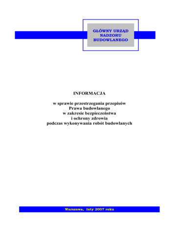 GŁÓWNY URZĄD NADZORU BUDOWLANEGO INFORMACJA w sprawie przestrzegania przepisów Prawa budowlanego w zakresie bezpieczeństwa i ochrony zdrowia podczas wykonywania robót budowlanych Warszawa, luty 2007 roku 2 I. Wstęp. Ustalenia Dyrektywy Rady 92/57/EWG z dnia 24 czerwca 1992 r. w sprawie wdrożenia minimalnych wymagań bezpieczeństwa i ochrony zdrowia na tymczasowych lub ruchomych budowach zostały uwzględnione w przepisach ustawy z dnia 7 lipca 1994 r. Prawo budowlane (t.j. Dz. U. z 2006 r. nr 156, poz. 118 z późn. zm.) poprzez: - wprowadzenie odpowiednich zapisów w ustawie Prawo budowlane (art. 20, 21, 22 i 41), obowiązujących od dnia 13 lutego 2002 roku, w oparciu o zapis artykułu 1 pkt. 8 ustawy z dnia 27 lipca 2001 roku o zmianie ustawy – Prawo budowlane (Dz. U. z 2001 nr 129 poz. 1439), - wydanie, w dniu 23 czerwca 2003 r., przez Ministra Infrastruktury rozporządzenia w sprawie informacji dotyczącej bezpieczeństwa i ochrony zdrowia oraz planu bezpieczeństwa i ochrony zdrowia (Dz. U. z 2003 r. nr 120 poz. 1126) - rozporządzenie weszło w życie z dniem 11 lipca 2003 r. Ponadto, na podstawie delegacji ustawy z dnia 26 czerwca 1974 r. Kodeks pracy, zostało wydane rozporządzenie Ministra Infrastruktury z dnia 6 lutego 2003 r. w sprawie bezpieczeństwa i higieny pracy podczas wykonywania robót budowlanych (Dz. U. Nr 47, poz. 401), które weszło w życie w dniu 19 września 2003 r. Przepisy te nałożyły na uczestników procesu budowlanego dodatkowe obowiązki: na projektanta - sporządzenie na etapie projektu informacji dotyczącej bezpieczeństwa i ochrony zdrowia ze względu na specyfikę projektowanego obiektu budowlanego, uwzględnianej w planie bezpieczeństwa i ochrony zdrowia, na kierownika budowy - sporządzenie lub zapewnienie sporządzenia, w oparciu o ww. informację, przed rozpoczęciem budowy, planu bezpieczeństwa i ochrony zdrowia, uwzględniającego specyfikę obiektu budowlanego i warunki prowadzenia robót budowlanych, w tym planowane jednoczesne prowadzenie robót budowlanych i produkcji przemysłowej, na inwestora - dołączenie oświadczenia kierownika budowy (robót), stwierdzające sporządzenie planu bezpieczeństwa i ochrony zdrowia, do zawiadomienia właściwego organu o zamierzonym terminie rozpoczęcia robót budowlanych. Podstawowy zakres robót budowlanych, który wymaga opracowania planu bioz obejmuje roboty budowlane, których charakter, organizacja oraz miejsce wykonywania stwarza wysokie ryzyko powstania zagrożenia bezpieczeństwa i zdrowia ludzi. W szczególności dotyczy to robót: - stwarzających zagrożenie przysypaniem ziemią lub upadku z wysokości, przy prowadzeniu których występują działania substancji chemicznych lub czynników biologicznych zagrażających bezpieczeństwu i zdrowiu ludzi, - stwarzających zagrożenie promieniowaniem jonizującym, prowadzonych w pobliżu linii wysokiego napięcia lub czynnych linii komunikacyjnych, - stwarzających ryzyko utonięcia pracowników, prowadzonych w studniach, pod ziemią i w tunelach, wykonywanych przez kierujących pojazdami zasilanymi z linii napowietrznych, wykonywanych w kesonach, z atmosferą wytwarzaną za sprężonego powietrza, wymagających użycia materiałów wybuchowych, prowadzonych przy montażu i demontażu ciężkich elementów prefabrykowanych. 3 Plan bioz sporządza się również, jeżeli przewidywane roboty budowlane mają trwać dłużej niż 30 dni roboczych i jednocześnie będzie przy nich zatrudnionych, co najmniej 20 pracowników lub pracochłonność planowanych robót będzie przekraczać 500 osobodni. Przestrzeganie powyższych przepisów jest kontrolowane przez organy działające na podstawie prawa budowlanego tj. przez: - organy administracji architektoniczno-budowlanej (wojewodowie i starostowie) - przed zatwierdzeniem projektu budowlanego i wydaniem pozwolenia na budowę, tj. podczas sprawdzania kompletności projektu budowlanego; brak kompletnego projektu budowlanego stanowi podstawę do odmowy jego zatwierdzenia i odmowy wydania przez organ pozwolenia na budowę, - terenowe organy nadzoru budowlanego (wojewódzcy i powiatowi inspektorzy nadzoru budowlanego) - przy przyjmowaniu zgłoszenia inwestora o zamiarze rozpoczęcia robót (najpóźniej na 7 dni przed rozpoczęciem), w zakresie przedstawienia oświadczenia kierownika budowy o zapewnieniu sporządzenia planu bezpieczeństwa i ochrony zdrowia (planu bioz). Problematyka zapewnienia opracowania, przed rozpoczęciem robót budowlanych, i przestrzegania ustaleń planu bezpieczeństwa i ochrony zdrowia podczas ich wykonywania została włączona w zakres kontroli budów i wykonywania innych robót budowlanych, przeprowadzanych przez organy nadzoru budowlanego. II. Kontrola przestrzegania przepisów w zakresie zapewnienia bezpieczeństwa i ochrony zdrowia podczas wykonywania robót budowlanych. Niezależnie od ustawowych zadań inspekcyjno-kontrolnych, realizowanych przez terenowe organy nadzoru budowlanego, Główny Urząd Nadzoru Budowlanego przeprowadził w latach 2004 -2005 kontrolę przestrzegania przepisów prawa budowlanego w zakresie zapewnienia bezpieczeństwa podczas wykonywania robót. Kontrolą objęto ogółem 161 budów na terenie kraju, z czego skontrolowano: - w obszarze budownictwa wodnego - 38 obiektów (budowa, odbudowa, przebudowa i remont obwałowania, budowa i odbudowa zbiorników wodnych, remont i przebudowa nabrzeża, budowa stopnia wodnego), - w obszarze budownictwa transportowego - 40 obiektów (budowy: mostów, wiaduktów, estakad, przepustów, przejścia podziemnego oraz jednego odcinka autostrady), - w obszarze budownictwa ogólnego - 83 obiekty (budowy: budynków handlowych, mieszkalnych, hal produkcyjnych i magazynowych, sieci: kanalizacyjnej, wodociągowej i gazowej). Kontrole zostały przeprowadzone w ramach wykonywania kontroli budów i wykonywania robót budowlanych. Podczas kontroli, zwrócono szczególną uwagę na: zapewnienie opracowania oraz te