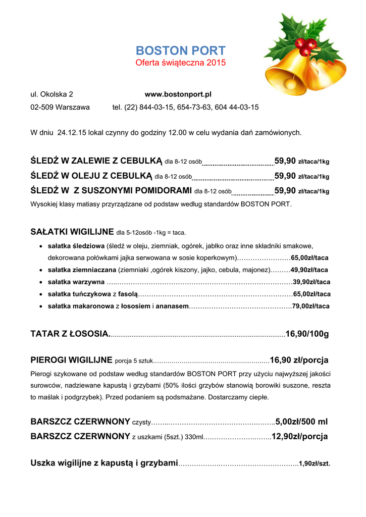 BOSTON PORT Oferta świąteczna 2015 ul. Okolska 2 02-509 Warszawa www.bostonport.pl tel. (22) 844-03-15, 654-73-63, 604 44-03-15 W dniu 24.12.15 lokal czynny do godziny 12.00 w celu wydania dań zamówionych. ŚLEDŹ W ZALEWIE Z CEBULKĄ dla 8-12 osób 59,90 zł/taca/1kg ŚLEDŹ W OLEJU Z CEBULKĄ dla 8-12 osób 59,90 zł/taca/1kg ŚLEDŹ W Z SUSZONYMI POMIDORAMI dla 8-12 osób 59,90 zł/taca/1kg Wysokiej klasy matiasy przyrządzane od podstaw według standardów BOSTON PORT. SAŁATKI WIGILIJNE dla 5-12osób -1kg = taca. sałatka śledziowa (śledź w oleju, ziemniak, ogórek, jabłko oraz inne składniki smakowe, dekorowana połówkami jajka serwowana w sosie koperkowym)……………………65,00zł/taca sałatka ziemniaczana (ziemniaki ,ogórek kiszony, jajko, cebula, majonez)………49,90zł/taca sałatka warzywna …..……………………………………………………………………39,90zł/taca sałatka tuńczykowa z fasolą……………………………………………………………65,00zł/taca sałatka makaronowa z łososiem i ananasem……………………………………….79,00zł/taca TATAR Z ŁOSOSIA..............................................................................................16,90/100g PIEROGI WIGILIJNE porcja 5 sztuk…………………………………………………16,90 zł/porcja Pierogi szykowane od podstaw według standardów BOSTON PORT przy użyciu najwyższej jakości surowców, nadziewane kapustą i grzybami (50% ilości grzybów stanowią borowiki suszone, reszta to maślak i podgrzybek). Przed podaniem są podsmażane. Dostarczamy ciepłe. BARSZCZ CZERWNONY czysty……..………………………………….……..5,00zł/500 ml BARSZCZ CZERWNONY z uszkami (5szt.) 330ml….……………….……..12,90zł/porcja Uszka wigilijne z kapustą i grzybami……………….……………………………..1,90zł/szt. Krokiety z kapustą i grzybami……………………………………………..…..8,90zł/szt. Paszteciki z kapustą i grzybami…………………………….…………………8,90zł/szt. ZUPY Zupa grzybowa wigilijna z borowików z łazankami…………………….…14,90zł/porcja Zupa rybna (NEW ENGLAND FISH CHOWDER)…………………………..12,90zł/porcja Zupa rakowa (na wywarze z miętusa z brokułem i pomidorami)………..15,90zł/porcja Zupa rybna z małżami……………………………………………………..15,90zł/porcja Zupa krewetkowa……………………………………………………….……15,90zł/porcja *w cenę zupy wliczone są dwa kawałki pieczywa czosnkowego z rusztu PRZEKĄSKI Porcja składa się z czterech dorodnych matiasów 250g o śledź na cztery sposoby………..……………………………………………………15,90zł/4 osoby o śledź w zalewie…………………….…………………………..………………………15,90zł/4 osoby o śledź w oleju………………………..……………………………………………….…15,90zł/4 osoby o śledź w śmietanie…………………………………………………………………......15,90zł/4 osoby o śledź łososiowy z serem pleśniowym …….……………………………………..15,90zł/4 osoby o Przeplataniec wigilijny (puree ziemniaczane, tarty buraczek ćwikłowy, śledź, jajko, ser)………………………………………………………………………………...24,90zł/500g/4 osoby o Połówki jaj na twardo: o w majonezie………………………………………………………………………………1,90zł/szt. o faszerowane………………………………………………………………………….…..2,50zł/szt. o z ikrą łososiową………………………………………………………………………....2,90zł/szt. *minimalne zamówienie 10szt. RYBY o Karp cały smażony z pieczarkami (waga żywego 1,50-1,70kg).....79,90 zł/4-5 osób o Karp cały surowy (sprawiony, przyprawiony do smażenia)………...59,90zł/4-5 osób o Karp filet smażony…………………………………………………………...28,90zł/200g o Inne pyszne ryby serwowane z rusztu w adekwatnych sosach (masa ryby w filecie na surowo 200g) Sola z patelni……………………………………………………….…………26,90zł Flądra z patelni…………………………………………………………........28,90zł Łosoś z rusztu……………………………………………………………......36,90zł Dorsz bałtycki z patelni……………………………………………………..29,90zł Dorsz atlantycki z rusztu……………………………………………………32,90zł Śledź z patelni………………………………………………………………...19,90zł Sandacz z rusztu……………………………………………………………..34,90zł Halibut z rusztu……………………………………………………………….36,90zł Gładzica z patelni…………………………………………………………….36,90zł Na specjalne życzenie klienta świeża tusza soli i turbota. o Ryby w galarecie Karp……………………………………………………………………..14,90zł/100g Łosoś……………………………………………………..…………….14,90zł/100g Sandacz…………………………...……………………………………15,90zł/100g o Ryba faszerowana w galarecie………………………………………..…...14,90zł/100g o Ryba po grecku: 100g ryby + warzywa Merluza………..…………………………………………….………………..12,90zł Mintaj...…………………………………………………………………….…12,90zł Miruna…………………………………………………………………….