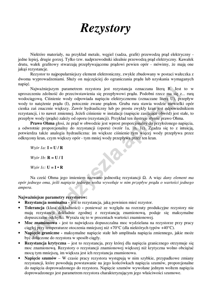 Rezystory .a pl us .p l Niektóre materiały, na przykład metale, węgiel (sadza, grafit) przewodzą prąd elektryczny jedne lepiej, drugie gorzej. Tylko tzw. nadprzewodniki idealnie przewodzą prąd elektryczny. Kawałek drutu, wałek grafitowy stwarzają przepływającemu prądowi pewien opór - mówimy, że mają one jakąś rezystancje. Rezystor to najpopularniejszy element elektroniczny, zwykle zbudowany w postaci wałeczka z dwoma wyprowadzeniami. Służy on najczęściej do ograniczania prądu lub uzyskania wymaganych napięć. Najważniejszym parametrem rezystora jest rezystancja oznaczana literą R. Jest to w uproszczeniu zdolność do przeciwstawienia się przepływowi prądu. Podobni rzecz ma się z... rurą wodociągową. Ciśnienie wody odpowiada napięciu elektrycznemu (oznaczane literą U), przepływ wody to natężenie prądu (I), potocznie zwane prądem. Gruba rura stawia wodzie niewielki opór cienka zaś znacznie większy. Zawór hydrauliczny lub po prostu zwykły kran jest odpowiednikiem rezystancji, i to nawet zmiennej. Jeżeli ciśnienie w instalacji (napięcie zasilające obwód) jest stałe, to przepływ wody (prądu) zależy od oporu (rezystancji). Przykład ten ilustruje słynne prawo Ohma. Prawo Ohma głosi, że prąd w obwodzie jest wprost proporcjonalny do przyłożonego napięcia, a odwrotnie proporcjonalny do rezystancji (oporu) (wzór 1a, 1b, 1c). Zgadza się to z intuicją, potwierdza także analogia hydrauliczna: im większe ciśnienie tym więcej wody przepływa przez odkręcony kran, czym większy opór - tym mniej wody przepływa przez ten kran. zl a Wzór 1a: I = U / R Wzór 1b: R = U / I ys Wzór 1c: U = I • R w .d z Na cześć Ohma jego imieniem nazwano jednostkę rezystancji Ω. A więc dany element ma opór jednego oma, jeśli napięcie jednego wolta wywołuje w nim przepływ prądu o wartości jednego ampera. w w Najważniejsze parametry rezystorów: • Rezystancja nominalna - jest to rezystancja, jaką powinien mieć rezystor. • Tolerancja (klasa dokładności) - ponieważ ze względu na rozrzuty produkcyjne rezystory nie mają rezystancji dokładnie zgodnej z rezystancją znamionową, podaje się maksymalne dopuszczalne odchyłki. Wyraża się to w procentach wartości znamionowej. • Moc znamionowa - jest to największa dopuszczalna moc wydzielana na rezystorze przy pracy ciągłej przy temperaturze otoczenia mniejszej niż +70°C (dla niektórych typów +40°C). • Napięcie graniczne - maksymalne napięcie stałe lub amplituda napięcia zmiennego, jakie może być dołączone do rezystora w sposób ciągły. • Rezystancja krytyczna – jest to rezystancja, przy której dla napięcia granicznego otrzymuje się moc znamionową. Rezystory o rezystancji znamionowej większej niż krytyczna wolno obciążać mocą tym mniejszą, im większa jest ich rezystancja znamionowa. • Napięcie szumów – W czasie pracy rezystora występują w nim szybkie, przypadkowe zmiany rezystancji, które powodują powstawanie na jego końcówkach napięcia szumów, proporcjonalne do napięcia doprowadzonego do rezystora. Napięcie szumów wywołane jednym woltem napięcia doprowadzonego jest parametrem rezystora charakteryzującym jego właściwości szumowe. -2• Temperaturowy współczynnik rezystancji - oznaczony w krajowych źródłach TWR, lub z angielskiego TCR, określa zmiany rezystancji pod wpływem temperatury. Czym mniejsza wartość TCR, tym bardziej stabilny rezystor. Wartość TCR podaje się w %/K lub ppm/K (1% = 104ppm). Niestabilność parametrów rezystora w zależności od warunków otoczenia. Jednym z głównych czynników warunkujących zachowanie parametrów rezystora jest temperatura. Oprócz rezystancji zmieniają się także inne parametry. Dopuszczalne obciążenie rezystorów jest stałe do pewnej granicy temperatury (zazwyczaj ok. 60˚C), po której przekroczeniu następuje jego spadek z 100 do 0% na długości ok. 40˚C. Na parametry mają także wpływ inne czynniki zewnętrzne zawarte w tabelce: Tabela 1. Zmiany rezystancji rezystora węglowego w zależności od czynników zewnętrznych. Na stałe? tak ± 4 – 6% ± 4 – 6% tak ± 2% + 6% -0,15% +2,5% +3,3% ± 2% + 10% -0,3% +4,5% +5,9% tak nie nie nie nie pl us Lutowanie (350˚C w odległości 3 mm Cykliczne obciążanie (500-krotne włączanie i wyłączanie napięcia w ciągu 1000 godzin) Wibracje (20 g) i wstrząsy (100 g) Wilgotność (wilgotność względna 95% w temp. 40˚C) Współczynnik napięciowy (zmiana o 10 V) Temperatura (25˚C do -15˚C) Temperatura (25˚C do 85˚C) Zmiana rezystancji R = 1k R = 10 M. ± 2% ± 2% .p l Czynnik w .d z ys zl a .a Produkcja. Obecnie produkowane są rezystory o wartości od 0,01 Ω do 1012 Ω (1 ΤΩ [teraom] czyli 1000 GΩ [gigaomów] ), mocy znamionowej od 1/8 wata do 250 W i dokładności od ±0,005% do ±20%. Połączenia rezystorów. Wyróżniamy dwa typy połączeń: równoległe i szeregowe. Szeregowe połączenie polega na złączeniu dwóch (lub więcej) R1 R2 oporników jeden za drugim (rys. 1a). W tym przypadku a) rezystancja, czyli opór sumują się (wzór 2a). Połączenie równoległe zaś polega - jak sama nazwa wskazuje - na R1 równoległym połączeniu oporników (rys. 1b). Opór w tedy R2 jest równy ilorazowi ich wartości rezystancji podzieloną b) przez sumę wartości rezystancji poszczególnych oporników (wzór 2b). Uwaga! Wzór 2 można zastosować dla dwóch Rysunek 1. Połączenia rezystorów: a) szeregowe; b) równoległe. lub więcej rezystorów, podczas gdy wzór 3 tylko dla dwóch rezystorów. w w Wzór 2a: R = R1 + R2 + ... Wzór 2b: R = 1 R1R2 lub: R = 1 1 R1 + R2 + + ... R1 R2 Oznaczenie rezystorów. W oznaczeniach rezystorów rozróżniamy trzy kody: cyfrowy, cyfrowo-literowy i barwny (paskowym). Kod cyfrowy polega na zapisywaniu wartości rezystancji, tolerancji, temperaturowym współczynniku rezystancji itp. za pomocą cyfr, np.: 210 Ω, 1 kΩ = 1000 Ω, 1,2 -3- pl us .p l MΩ 20%, 470