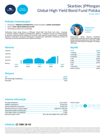 Skarbiec JPMorgan Global High Yield Bond Fund Polska 31.01.2017 Polityka inwestycyjna • • • inwestycje w obligacje przedsiębiorstw, przede wszystkim z rynków rozwiniętych płynny i silnie zdywersyfikowany portfel Katarzyna Rokicka minimalizacja ryzyka kursu walutowego Subfundusz lokuje swoje aktywa w JPMorgan Global High Yield Bond Fund, który inwestuje w starannie wybrane obligacje przedsiębiorstw, głównie z ratingiem niższym od inwestycyjnego. W obszarze zainteresowania znajdują się wszystkie rynki papierów korporacyjnych o odpowiedniej płynności. Subfundusz utrzymuje ekspozycję na pojedyńczych emitentów na poziomie poniżej 2% i zabezpiecza wartość jednostki przed ryzykiem kursowym. Historia GLOBAL HIGH YIELD130 PLNGLOBAL HIGH YIELD130 PLNGLOBAL HIGH YIELD130 PLNGLOBAL HIGH YIELD130 PLNGLOBAL HIGH YIELD 130 PLN 130 PLN 120 PLN 120 PLN 120 PLN 120 PLN 120 PLN 120 PLN 110 PLN PLN 110 PLN 110 PLN 110 PLN 110 PLN 100 PLN 100 PLN 100 PLN 110 90 PLN 90 PLN zarządzająca Absolwentka Szkoły Głównej Handlowej w Warszawie na kierunku Finanse i Rachunkowość. Karierę zawodową rozpoczęła w 2012 roku w BNP Paribas Securities Services. W Skarbiec TFI od lipca 2014 roku. Wyniki okres wynik 1 miesiąc 1,0% 3 miesiące 1,9% 6 miesięcy 4,6% 1 rok 0,3% 90 PLN 2013 100 PLN 3,7% 2014 90 PLN 100 PLN -4,4% 2015 90 PLN 100 PLN 13,5% 2016 90 PLN 16,4% 2 lata 8,9% 3 lata 12,8% 1,0% 5 lat 2017 w tym roku 1,0% od 02.12.2013 14,0% Aktywa typ udział JPM Global High Yield Bond C 95,6% Pozostałe 4,4% Istotne informacje Początek działalności 02.12.2013 Wielkość subfunduszu 16 mln PLN Wartość jednostki uczestnictwa 114,02 PLN Minimalna pierwsza / kolejna wpłata Maksymalna opłata manipulacyjna Limit opłaty stałej za zarządzanie Rachunek nabyć w PLN 1000 PLN / 100 PLN Poziom ryzyka 1 2 niższe ryzyko 3 4 5 6 7 wyższe ryzyko 2,50% 1,30% 96 1140 1010 0000 5476 1200 1003 Infolinia: 22 588 18 43 Dane na dzień 31.01.2017. Wykresy i wyniki stanowią opracowania własne SKARBIEC TFI SA. Subfundusz wydzielony w ramach Skarbiec - JPMorgan Asset Management Funds Polska Specjalistyczny Fundusz Inwestycyjny Otwarty. Wymagane prawem informacje dotyczące Subfunduszu, w tym o czynnikach ryzyka inwestycyjnego, znajdują się w prospekcie informacyjnym Skarbiec - JPMorgan Asset Management Funds Polska Specjalistyczny Fundusz Inwestycyjny Otwarty i kluczowych informacjach dla inwestora dostępnych w siedzibie SKARBIEC TFI SA, w serwisie skarbiec.pl i w sieci sprzedaży. Subfundusz nie gwarantuje realizacji określonego celu i wyniku inwestycyjnego, a uczestnik ponosi ryzyko utraty części wpłaconych środków. Prezentowane wyniki inwestycyjne nie stanowią gwarancji osiągnięcia podobnych wyników w przyszłości, są wynikiem inwestycyjnym osiągniętym w konkretnym okresie historycznym. Tabela opłat manipulacyjnych oraz informacje =o podatku bezpośrednio obciążającym dochód z inwestycji dostępne są pod numerem infolinii: (22) 588 18 43, w serwisie skarbiec.pl. Subfundusz lokuje aktywa głównie w lokaty inne niż papiery wartościowe lub instrumenty rynku pieniężnego. Wartość aktywów netto cechuje się dużą zmiennością ze względu na skład portfela inwestycyjnego lub na stosowane techniki zarządzania.