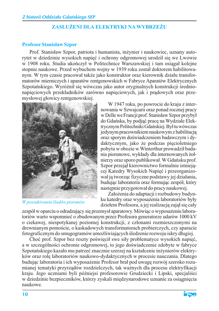 Z historii Oddziału Gdańskiego SEP ZASŁUŻENI DLA ELEKTRYKI NA WYBRZEŻU Profesor Stanisław Szpor Prof. Stanisław Szpor, patriota i humanista, inżynier i naukowiec, uznany autorytet w dziedzinie wysokich napięć i ochrony odgromowej urodził się we Lwowie w 1908 roku. Studia ukończył w Politechnice Warszawskiej i tam osiągał kolejne stopnie naukowe. Przed wybuchem wojny w 1939 roku został doktorem habilitowanym. W tym czasie pracował także jako konstruktor oraz kierownik działu transformatorów mierniczych i aparatów rentgenowskich w Fabryce Aparatów Elektrycznych Szpotańskiego. Wyróżnił się wówczas jako autor oryginalnych konstrukcji średnionapięciowych przekładników zarówno napięciowych, jak i prądowych oraz przemysłowej głowicy rentgenowskiej. W 1947 roku, po powrocie do kraju z internowania w Szwajcarii oraz ponad rocznej pracy w Delle we Francji prof. Stanisław Szpor przybył do Gdańska, by podjąć pracę na Wydziale Elektrycznym Politechniki Gdańskiej. Był tu wówczas jedynym pracownikiem naukowym z habilitacją oraz sporym doświadczeniem badawczym i dydaktycznym, jako że podczas pięcioletniego pobytu w obozie w Winterthur prowadził badania piorunowe, wykłady dla internowanych żołnierzy oraz sporo publikował. W Gdańsku prof. Szpor przejął kierownictwo formalnie istniejącej Katedry Wysokich Napięć i przeorganizował ją tworząc fizyczne podstawy jej działania, budując laboratoria oraz formując zespół, który następnie przygotował do pracy naukowej. Założenia do adaptacji i rozbudowy budynku katedry oraz wyposażenia laboratoriów były W poszukiwaniu śladów piorunów dziełem Profesora, a jej realizacją zajął się cały zespół w oparciu o odradzający się przemysł aparatowy. Mówiąc o wyposażeniu laboratoriów warto wspomnieć o zbudowanym przez Profesora generatorze udarów 1000 kV o ciekawej, niespotykanej poziomej konstrukcji, z członami rozmieszczonymi na drewnianym pomoście, o kaskadowych transformatorach probierczych, czy aparacie fotograficznym do smugogramów umożliwiających śledzenie rozwoju iskry długiej. Choć prof. Szpor bez reszty poświęcił swe siły problematyce wysokich napięć, a w szczególności ochronie odgromowej, to jego doświadczenie zdobyte w fabryce Szpotańskiego kazało mu patrzeć znacznie szerzej na kształcenie inżynierów elektryków oraz rolę laboratoriów naukowo-dydaktycznych w procesie nauczania. Dlatego budując laboratoria i ich wyposażenie Profesor brał pod uwagę rozwój szeroko rozumianej tematyki przyrządów rozdzielczych, tak ważnych dla procesu elektryfikacji kraju. Jego uczniami byli późniejsi profesorowie Grudziecki i Lipski, specjaliści w dziedzinie bezpieczników, którzy zyskali międzynarodowe uznanie za osiągnięcia naukowe. 10 Z historii Oddziału Gdańskiego SEP Profesor Szpor przygotowuje notatki Do najważniejszych osiągnięć prof. Stanisława Szpora można zaliczyć prace nad teoriami rozwoju iskry długiej i wyładowań indukowanych, badanie parametrów wyładowań atmosferycznych, w tym na wysokich kominach Śląska oraz w Tatrach, opracowanie nowych zasad ochrony odgromowej stacji elektroenergetycznych z wykorzystaniem dławików, czy opracowanie i rozpropagowanie tzw. wiejskich piorunochronów lekkich, które uratowały wiele drewnianych zabudowań polskiej wsi. Osiągnięcia naukowe prof. Szpora, szczególnie w dziedzinie ochrony odgromowej, jego bezkompromisowość, nadzwyczajna uczciwość i wrażliwość na niesprawiedliwość budziły powszechny szacunek. Jego uczniowie zawsze wysoko cenili niezależność swego Mistrza, prawość i otwarte wyrażanie sprzeciwu wobec nieuczciwości i łamaniu prawa. Prof. Szpor całym sercem oddał się przekazywaniu wiedzy studentom, wiedząc, że bez wysokokwalifikowanej kadry niemożliwy będzie rozwój kraju. Olbrzymią wagę przywiązywał do kontaktów z przemysłem. Wspierał SEP i propagował jego działalność wśród studentów, rozumiał bowiem rolę Stowarzyszenia w kształtowaniu postaw i doskonaleniu wiedzy inżynierskiej. Prof. Szpor zmarł w 1981 roku, kilka lat po odejściu na emeryturę. W 2007 roku Zarząd Oddziału Gdańskiego SEP wspólnie z Wydziałem Elektrotechniki i Automatyki Politechniki Gdańskiej ustanowili Medal Imienia Profesora Stanisława Szpora, którym honoruje się elektryków, nie tylko Wybrzeża, wyróżniających się działalnością na rzecz kształtowania postaw i wiedzy inżynierów oraz rozwoju przemysłu elektroenergetycznego. Medal im. Prof. Stanisława Szpora Nr 156 11 Z historii Oddziału Gdańskiego SEP Alfons Hoffmann Alfons Hoffmann urodził się 12 listopada 1885 r. w Grudziądzu. W latach 1905–1911 studiował w Königliche Technische Hochschule zu Danzig, następnie zdobywał praktykę w przemyśle niemieckim, m.in. w zakładach Garbe Lahmeyer i Siemens Schuckert oraz w elektrowni Koronowo. Po odzyskaniu niepodległości jako pierwszy w kraju zbudował w 1923 r. elektrownię wodną w Gródku. Również jako pierwszy zbudował linię przesyłową, napowietrzną Gródek-Toruń, na niestosowane dotąd napięcie 60 kV. To napięcie później się rozpowszechniło w budowanych w kraju pozostałych liniach przesyłowych. Pobudował następnie elektrownie w Żurze i Gdyni, przedłużył linie 60 kV do Gdyni, a dalej linią 15 kV zasilał Władysławowo i Juratę. Połączył się z pracującymi już elektrowniami w Grudziądzu i Toruniu, tworząc tym samym pierwszy w kraju jednolity, wojewódzki system elektroenergetyczny. Nie tylko budował, ale także znakomicie kierował utworzoną w 1924 r. Pomorską Elektrownią Krajową Gródek S.A., której kapitał zakładowy wynosił 6 mln zł. Alfons Hoffmann, rozstając się w 1938 roku z PEK Gródek, po 18-letniej pracy, pozostawił spółkę z kapitałem 38 mln zł. W latach 1932–33 zbudował w Gródku nowoczesną Fabrykę Grzejników Elektrycznych. Przy budowaniu tej fabryki oparł się na dostaw