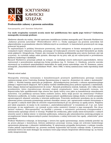 Profesorskie zabawy z prawem autorskim Rzeczpospolita, prof. Stanisław Sołtysiński Czy mało oryginalny rysunek ucznia może być publikowany bez zgody jego twórcy? Unikatową monografię recenzuje profesor. Niedawno ukazała się ważna, chociaż opatrzona żartobliwym tytułem monografia prof. Ryszarda Markiewicza „Zabawyz prawem autorskim” (WoltersKluwer 2015 r.). Osoby zajmujące się prawem autorskim lub odpowiedzialne za gromadzenie zbiorów bibliotecznych na uczelniach i w kancelariach prawniczych nie mogą przeoczyć tej pozycji. To najważniejsza w polskiej literaturze prawniczej, choć nietypowa w formie monografia o granicach rozmaitych typów własności autorskiej, poczynając od tradycyjnych utworów (np.dzieł literackich) po dzieła sztuk pięknych i fotograficzne. Pomysł, aby rozważać tę złożoną problematykę przy użyciu ilustracji, jest tak oczywisty, że czytelnik zadaje sobie pytanie, dlaczego do tej pory nikt jej nie wykorzystał w prowadzeniu dyskursu naukowego i dydaktyki. Ryszard Markiewicz przyznaje jednak na wstępie, że naśladuje swych nielicznych poprzedników, którzy zastosowali z powodzeniem analogiczną formę przekazu (np. R. Gorman i J. Ginsburg, autorów szeroko używanych na uczelniach amerykańskich materiałów do nauki prawa autorskiego, oraz M. Kummera, autora monografii „Dasurheberrechtlich schützbare Werk”, Bern 1968, w której zamieszczono wiele reprodukcji dzieł sztuki. Wiatrak wśrod zadań Monografię otwierają rozważania o konsekwencjach prawnych opublikowania pewnego rysunku zamieszczonego przez Centralną Komisję Egzaminacyjną w raporcie „Komentarz do zadań z matematyki” (2006 r.). Wysoka komisja opatrzyła go podpisem: „Rysunekpowyższy pochodzi z arkusza egzaminacyjnego jednego z tegorocznych zdających. Był to jedyny rezultat intelektualnej pracy podczas egzaminu z matematyki, który zdający dostarczył egzaminatorowi do oceny”. Rysunek przedstawia wiatrak, budynek, wóz i kilka innych przedmiotów, które charakteryzuje skromny stopień oryginalności. Autor monografii rozważa, czy dopuszczalne było opublikowanie tego utworu bez zgody twórcy oraz jakie są konsekwencje niewskazania autorstwa. Czy publikacja narusza dobra osobiste autora, który mógł poczuć się ośmieszony? Profesor Markiewicz podkreśla, że trudno uzasadnić dopuszczalność opublikowania takiego dzieła w świetle przepisów ograniczających własność autorską w interesie publicznym. Przeciwko możliwości powołania się na szeroko ujmowane prawo cytowania przemawiają zarówno charakter utworu, jak i ograniczenie wolności korzystania w ten sposób z cudzych dzieł tylko do utworów rozpowszechnionych po raz pierwszy za zgodą autora. Wątpliwy jest także argument, że mamy tu do czynienia z „materiałemurzędowym” w rozumieniu art. 4 pr. aut. Autor przyznaje, że ma wątpliwości, czy rysunek ucznia wolno zamieścić również w jego monografii. Nie chcąc narazić wydawcy „Rzeczpospolitej” na konflikt z prawem, z ostrożności procesowej zrezygnowałem z umieszczenia opisanego utworu w recenzji. Przykład ten uwidacznia, jakie ryzyka niesie korzystanie z cudzych utworów nawet w dobrej wierze i w interesie publicznym, zwłaszcza gdy ustawodawstwa zawierają przepisy ze szczegółowymi listami dopuszczalnych postaci korzystania z cudzej twórczości bez zgody „właściciela” praw autorskich. Profesor Markiewicz wskazuje, że korzystając z utworu bez zgody uprawnionego, można niekiedy powołać się na prawa płynące z konstytucji, którym judykatura przyznaje wyższą rangę niż ochronie konkretnego uprawnienia płynącego z własności intelektualnej. W opisywanym przypadku korzystanie z cudzego rysunku trudno jednak usprawiedliwiać np. prawem swobody wypowiedzi lub krytyki cudzego dzieła. Z pewnością natomiast twórca nie może domagać się usunięcia wzoru jego tatuażu bezprawnie odtworzonego np. na twarzy osoby nieuprawnionej. Jezus polecił po angielsku Kolejne rozważania dotyczą pojęć utworu i przedmiotu prawa autorskiego. Problem ilustrują obrazki przedstawiające abstrakcje stworzone przez naturę (np.malowidło na szybie stworzone przez mróz i kolorową abstrakcję „autorstwa”używającej pędzla małpy). Autor opisuje publikację „Kurscudów”, spisaną przez prof. Helen Schyckman, która twierdziła, że stanowi ona zapis poleceń wydanych jej przez Jezusa w języku angielskim. Jej spadkobiercy wystąpili o naruszenie praw autorskich po przetłumaczeniu na język niemiecki książki, wydanej najpierw w wersji angielskiej. W 2014 r. Oberlandsgericht Frankfurt wydał orzeczenie, że wyłącznym autorem książki była osoba, która sporządziła jej zapis. Wcześniej problem osoby uprawnionej do autorstwa tego utworu, który ukazał się niedawno również w polskim przekładzie, trafił na wokandę sądu amerykańskiego. Markiewicz relacjonuje także inne ciekawe precedensy sądowe dotyczące sporów związanych z definicją utworu, który według naszego prawa stanowi przedmiot prawa autorskiego „niezależnieod wartości, przeznaczenia i sposobu wyrażenia” (art.1 pr. aut.). Mimo równie pojemnej definicji utworu sąd niemiecki odmówił uznania za „żyjącąrzeźbę” dwóch znanych artystek. Markiewicz aprobuje tę wykładnię, lecz zaznacza, że nie pozbawia to ochrony wizerunku artystek, charakteryzacji i kostiumów oraz fotografii dokumentujących ich działalność. To pożyteczna zabawa W żadnej dziedzinie prawa granice między domeną publiczną a domeną własności, czyli sferą praw wyłącznych, nie są tak płynne (niedookreślone) jak w prawie autorskim i w innych obszarach własności intelektualnej. Książka prof. Markiewicza zawiera bogatą dokumentację tego problemu nie tylko na przykładzie polskiego, lecz również zagranicznego orzecznictwa. Zastosowana w monografii metoda dydaktyki obrazkowej okazuje się bardzo przydatna, a często wręc