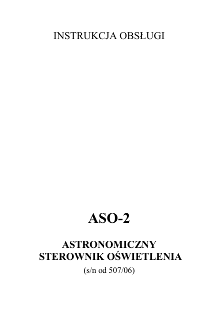 INSTRUKCJA OBSŁUGI ASO-2 ASTRONOMICZNY STEROWNIK OŚWIETLENIA (s/n od 507/06) -1- Spis treści 1. 1.1. 2. 3. 3.1. 3.2. 3.3. 3.4. 3.5. 3.6. 3.7. 3.8. 3.9. 3.10. Charakterystyka ogólna ........... Zastosowanie .......................... Dane techniczne ...................... Opis działania i programowanie ... Czas ......................................... Rok .......................................... Miesiąc ..................................... Dzień ....................................... Poprawka do czasu załączenia .... Poprawka do czasy wyłączenia ... Przerwa nocna ....................... Taryfa ..................................... Napięcie baterii ....................... Wersja programu (wybór tablicy ASTRO) ....................................... 3.11. Godz. wł./wył. (On/Off) ............. 4. Wskazówki montaŜowe ................ 4.1. MontaŜ elektryczny ................... 4.2. MontaŜ mechaniczny ................. 5. Opis symboli ............................... 2 2 3 3 4 5 6 6 7 7 8 9 9 10 10 11 11 13 14 -2- 1. Charakterystyka ogólna Nowoczesny mikroprocesorowy zegar sterujący z kwarcowym oscylatorem, przystosowany do montaŜu na szynie DIN35. Pracuje w czasie letnim i zimowym z automatycznym przełączaniem. Posiada dwa kanały do sterowania stycznikami. Kanał A posiada sterowanie ASTRO i moŜliwość wybrania przerwy nocnej. Kanał T ma sterowanie drugą taryfą licznika albo sterowanie ASTRO bez przerwy nocnej. * zegar czasu rzeczywistego (godziny, minuty, rok, miesiąc, dzień) * tablica wschodów i zachodów (wpisany cały rok do pamięci stałej) * czas letni i zimowy (w pełni automatyczny) * dwa kanały wyjściowe (wyzwalane w zerze) * podtrzymanie bateryjne (zegar i pamięć) * programowanie z własnej klawiatury * pełna sygnalizacja stanu i wyjść * wyświetlacz LED (widoczny i kontrastowy) * sterowanie ręczne * zabezpieczenie przed przepięciami 1.1. Zastosowanie Przeznaczony do sterownia oświetleniem ulicznym wg czasu astronomicznego z przerwą nocną lub bez, równieŜ sterowania licznikiem dwutaryfowym albo -3- drugim ciągiem oświetlenia bez przerwy nocnej. Przystosowany do nowoczesnych tablic z aparaturą na szynę DIN35. 2. Dane techniczne Zasilanie: (220..230)V, 50Hz, 1,5VA Wyjścia: (220..230)VAC, optotriak włączany w zerze sieci, limit prądu (600)mA Wyświetlanie: 4 cyfry LED 9,2mm 4 diody LED (stan 2 wyjść, czas letni/zimowy, kropka sekundowa) Programowanie: z własnej klawiatury (4 klawisze) Zegar: dokładność +/- 5min/rok czas pracy z baterii ok. 2 mies. Wymiary:(szer.dł.wys.) 36x90x73 mm szyna DIN 35 (2 moduły) Warunki pracy: temperatura (-20 do 40)oC Stopień ochrony: CięŜar: IP = 30 ok. 200g 3. Opis działania i programowanie Zegar pracuje w trybie automatycznej zmiany czasu letni/zimowy. Zmiana czasu następuje w nocy w -4- ostatnią niedzielę października i w ostatnią niedzielę marca między 2:00 a 3:00. Podstawowym stanem pracy zegara jest stan wyświetlania czasu. Realizuje wówczas funkcje programowe i umoŜliwia ręczne sterowanie wyjść. Do tego stanu realizowany jest zawsze powrót w przypadku wszystkich niedokończonych operacji edycji, takŜe z kaŜdej pozycji MeNu. Powrót odbywa się automatycznie po upływie ok. 25s. Konfiguracja i programowanie odbywa się przy pomocy cyklicznego MeNu (klawisz MN). KaŜdorazowe przyciśnięcie tego klawisza przesuwa nas cyklicznie o jedną pozycję w MeNu od stanu CZAS poprzez ROK, MIESIĄC, DZIEŃ, POPRAWKA ZAŁ, POPRAWKA WYŁ, PRZERWA NOCNA, TARYFA, NAPIĘCIE BATERII, WERSJA PROGRAMU, GODZ.WŁ./GODZ.WYŁ. ponownie CZAS itd. 3.1. Czas Na wyświetlaczu pokazywany jest bieŜący czas, kropki wyświetlacza mają następujące znaczenie: Pierwsza z lewej (+1h) świeci -wskazywany czas letni nie świeci -wskazywany czas zimowy -5- Druga z lewej (s) kropka sekundowa 0,5s/0,5s Trzecia z lewej (A) świeci -włączone wyjście A nie świeci -wyłączone wyjście A Czwarta z lewej (T) świeci -włączone wyjście T nie świeci -wyłączone wyjście T Działanie klawiszy S-/A zmienia stan wyjścia A S+/T zmienia stan wyjścia T ED rozpoczyna edycję czasu, mruga wyświetlacz godzin (zmiana klawiszem S-/A lub S+/T). Powtórne przyciśnięcie ED zatwierdza godziny a mruga wyświetlacz minut (zmiana jak poprzednio), ponowne przyciśnięcie ED zatwierdza minuty, wyświetlacz nie mruga. MN przesuwa MeNu o jedną pozycję, zegar wyświetla ROK. 3.2. Rok Na wyświetlaczu pokazywany jest bieŜący rok. Działanie klawiszy ED rozpoczyna edycję roku, mrugają dwie ostatnie cyfry roku (zmiana klawiszem S-/A lub S+/T). -6- Powtórne przyciśnięcie ED zatwierdza zmianę, wyświetlacz przestaje mrugać. MN przesuwa MeNu o jedną pozycję, zegar wyświetla MIESIĄC. 3.3. Miesiąc Na wyświetlaczu pokazywany jest bieŜący miesiąc a na pierwszej pozycji wyświetlacza symbol oznaczający literę M. Działanie klawiszy ED rozpoczyna edycję miesiąca, mrugają dwie cyfry przeznaczone do zmiany (zmiana klawiszem S-/A lub S+/T). Powtórne przyciśnięcie ED zatwierdza zmianę, wyświetlacz przestaje mrugać. MN przesuwa MeNu o jedną pozycję, zegar wyświetla DZIEŃ. 3.4. Dzień Na wyświetlaczu pokazywany jest bieŜący dzień a na pierwszej pozycji wyświetlacza symbol oznaczający literę d. Działanie klawiszy ED rozpoczyna edycję dnia, mrugają dwie cyfry przeznaczone do zmiany (zmiana klawiszem S-/A lub S+/T). Powtórne przyciśnięcie ED zatwierdza zmianę, wyświetlacz przestaje mrugać. -7- MN przesuwa MeNu o jedną pozycję, zegar wyświetla POPRAWKĘ ZAŁ. 3.5. Poprawka zał. Na wyświetlaczu pokazana jest aktualna poprawka a na pierwszej pozycji wyświetlacza symbol poprawki zał. (górne kółeczko ósemki). Poprawka dotyczy zachodu słońca a więc czasu włączenia kanału ASTRO. Jest programowana przez uŜytkownika, pozwala na stałe przesunięcie (przyspieszenie lub opóźnienie) momentu włączenia kanału ASTRO o wartość z zakresu (-99 do +99)min. Działanie klawiszy ED ro