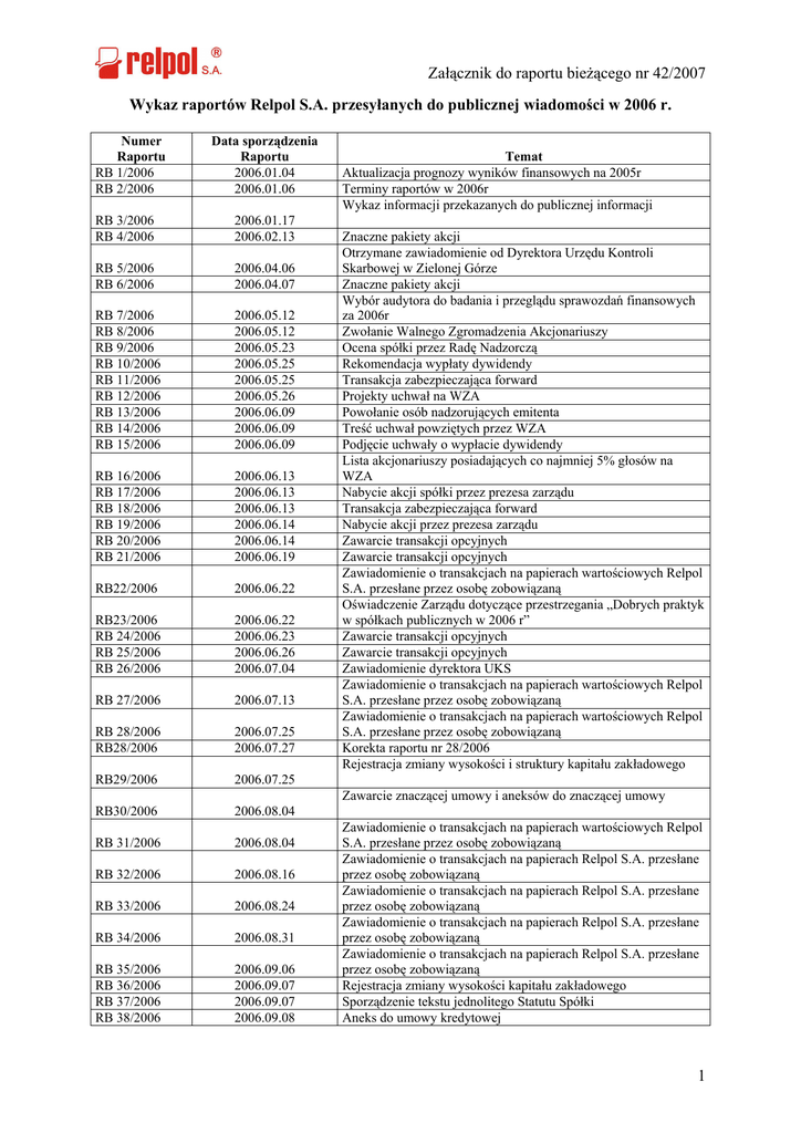 Załącznik do raportu bieżącego nr 42/2007 Wykaz raportów Relpol S.A. przesyłanych do publicznej wiadomości w 2006 r. Numer Raportu RB 1/2006 RB 2/2006 Data sporządzenia Raportu 2006.01.04 2006.01.06 RB 3/2006 RB 4/2006 2006.01.17 2006.02.13 RB 5/2006 RB 6/2006 2006.04.06 2006.04.07 RB 7/2006 RB 8/2006 RB 9/2006 RB 10/2006 RB 11/2006 RB 12/2006 RB 13/2006 RB 14/2006 RB 15/2006 2006.05.12 2006.05.12 2006.05.23 2006.05.25 2006.05.25 2006.05.26 2006.06.09 2006.06.09 2006.06.09 RB 16/2006 RB 17/2006 RB 18/2006 RB 19/2006 RB 20/2006 RB 21/2006 2006.06.13 2006.06.13 2006.06.13 2006.06.14 2006.06.14 2006.06.19 RB22/2006 2006.06.22 RB23/2006 RB 24/2006 RB 25/2006 RB 26/2006 2006.06.22 2006.06.23 2006.06.26 2006.07.04 RB 27/2006 2006.07.13 RB 28/2006 RB28/2006 2006.07.25 2006.07.27 RB29/2006 2006.07.25 RB30/2006 2006.08.04 RB 31/2006 2006.08.04 RB 32/2006 2006.08.16 RB 33/2006 2006.08.24 RB 34/2006 2006.08.31 RB 35/2006 RB 36/2006 RB 37/2006 RB 38/2006 2006.09.06 2006.09.07 2006.09.07 2006.09.08 Temat Aktualizacja prognozy wyników finansowych na 2005r Terminy raportów w 2006r Wykaz informacji przekazanych do publicznej informacji Znaczne pakiety akcji Otrzymane zawiadomienie od Dyrektora Urzędu Kontroli Skarbowej w Zielonej Górze Znaczne pakiety akcji Wybór audytora do badania i przeglądu sprawozdań finansowych za 2006r Zwołanie Walnego Zgromadzenia Akcjonariuszy Ocena spółki przez Radę Nadzorczą Rekomendacja wypłaty dywidendy Transakcja zabezpieczająca forward Projekty uchwał na WZA Powołanie osób nadzorujących emitenta Treść uchwał powziętych przez WZA Podjęcie uchwały o wypłacie dywidendy Lista akcjonariuszy posiadających co najmniej 5% głosów na WZA Nabycie akcji spółki przez prezesa zarządu Transakcja zabezpieczająca forward Nabycie akcji przez prezesa zarządu Zawarcie transakcji opcyjnych Zawarcie transakcji opcyjnych Zawiadomienie o transakcjach na papierach wartościowych Relpol S.A. przesłane przez osobę zobowiązaną Oświadczenie Zarządu dotyczące przestrzegania „Dobrych praktyk w spółkach publicznych w 2006 r” Zawarcie transakcji opcyjnych Zawarcie transakcji opcyjnych Zawiadomienie dyrektora UKS Zawiadomienie o transakcjach na papierach wartościowych Relpol S.A. przesłane przez osobę zobowiązaną Zawiadomienie o transakcjach na papierach wartościowych Relpol S.A. przesłane przez osobę zobowiązaną Korekta raportu nr 28/2006 Rejestracja zmiany wysokości i struktury kapitału zakładowego Zawarcie znaczącej umowy i aneksów do znaczącej umowy Zawiadomienie o transakcjach na papierach wartościowych Relpol S.A. przesłane przez osobę zobowiązaną Zawiadomienie o transakcjach na papierach Relpol S.A. przesłane przez osobę zobowiązaną Zawiadomienie o transakcjach na papierach Relpol S.A. przesłane przez osobę zobowiązaną Zawiadomienie o transakcjach na papierach Relpol S.A. przesłane przez osobę zobowiązaną Zawiadomienie o transakcjach na papierach Relpol S.A. przesłane przez osobę zobowiązaną Rejestracja zmiany wysokości kapitału zakładowego Sporządzenie tekstu jednolitego Statutu Spółki Aneks do umowy kredytowej 1 Załącznik do raportu bieżącego nr 42/2007 RB 39/2006 RB 40/2006 2006.10.03 2006.10.03 RB 41/2006 RB 42/2006 2006.10.06 2006.10.11 RB 43/2006 2006.10.25 RB 44/2006 2006.10.31 RB 45/2006 RB 46/2006 RB 47/2006 2006.11.07 2006.11.07 2006.11.07 RB 48/2006 2006.11.16 RB 49/2006 RB 50/2006 RB 51/2006 2006.11.24 2006.12.05 2006.12.06 RB 52/2006 RB 53/2006 RB 54/2006 RB 55/2006 RB 56/2006 2006.12.07 2006.12.11 2006.12.15 2006.12.15 2006.12.22 Zawiadomienie dyrektora UKS Znaczne pakiety akcji Uzupełnienie do rozszerzonego skonsolidowanego raportu za I półrocze 2006r Przyjęcie akcji serii D do KDPW Otrzymanie Decyzji Dyrektora Urzędu Kontroli Skarbowej Dopuszczenie akcji serii D do obrotu na rynku oficjalnych notowań giełdowych Zawiadomienie o transakcjach na papierach Relpol S.A. przesłane przez osobę zobowiązaną Rejestracja i asymilacja akcji serii D w KDPW Zawarcie znaczącej umowy Zawiadomienie o transakcjach na papierach spółki przesłane przez osobę zobowiązaną Zawiadomienie o transakcjach na papierach spółki przesłane przez osobę zobowiązaną Znaczne pakiety akcji Znaczne pakiety akcji Zawiadomienie o transakcji na papierach Spółki przesłane przez osobę zobowiązaną Zawiadomienie o transakcjach na papierach Spółki Aneks do znaczącej umowy Zawiadomienie o transakcjach na papierach Spółki Znaczne pakiety akcji Raporty kwartalne, półroczne i roczne 2006 r Nr Raportu Data sporządzenia Raportu QSr 4/2005 S.A.-R 2005 S.A.-RS 2005 2006.02.28 2006.04.27 2006.05.24 QSr 1/2006 2006.05.11 QSr 2/2006 2006.08.10 PSr 2006 2006.09.28 QSr 3/2006 2006.11.14 Treść Raport skonsolidowany za 4 kwartał 2005 oraz skrócony raport jednostkowy za 4 kwartał 2005 Raport roczny jednostkowy za 2005 rok Raport roczny skonsolidowany za 2005 rok Raport skonsolidowany za 1 kwartał 2006 oraz skrócony raport jednostkowy za 1 kwartał 2006 Raport skonsolidowany za 2 kwartał 2006 oraz skrócony raport jednostkowy za 2 kwartał 2006 Skonsolidowany raport półroczny za I p. 2006 oraz skrócony jednostkowy raport półroczny za I p. 2006 Raport skonsolidowany za 3 kwartał 2006 oraz skrócony raport jednostkowy za 3 kwartał 2006 Raporty bieżące i okresowe przekazane do publicznej wiadomości w 2006 roku, znajdują się w siedzibie Spółki w Żarach przy ul. 11 Listopada 37. Poza tym raporty bieżące i okresowe za ostatnie lata dostępne są na stronie internetowej spółki pod adresem www.relpol.com.pl 2