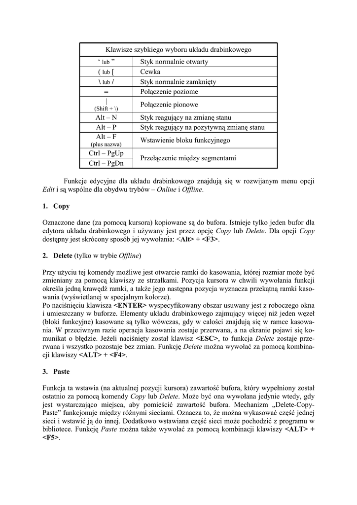 Klawisze szybkiego wyboru układu drabinkowego ‘ lub ” ( lub [ \ lub / = | (Shift + \) Alt – N Alt – P Alt – F (plus nazwa) Ctrl – PgUp Ctrl – PgDn Styk normalnie otwarty Cewka Styk normalnie zamknięty Połączenie poziome Połączenie pionowe Styk reagujący na zmianę stanu Styk reagujący na pozytywną zmianę stanu Wstawienie bloku funkcyjnego Przełączenie między segmentami Funkcje edycyjne dla układu drabinkowego znajdują się w rozwijanym menu opcji Edit i są wspólne dla obydwu trybów – Online i Offline. 1. Copy Oznaczone dane (za pomocą kursora) kopiowane są do bufora. Istnieje tylko jeden bufor dla edytora układu drabinkowego i używany jest przez opcję Copy lub Delete. Dla opcji Copy dostępny jest skrócony sposób jej wywołania: <Alt> + <F3>. 2. Delete (tylko w trybie Offline) Przy użyciu tej komendy możliwe jest otwarcie ramki do kasowania, której rozmiar może być zmieniany za pomocą klawiszy ze strzałkami. Pozycja kursora w chwili wywołania funkcji określa jedną krawędź ramki, a także jego następna pozycja wyznacza przekątną ramki kasowania (wyświetlanej w specjalnym kolorze). Po naciśnięciu klawisza <ENTER> wyspecyfikowany obszar usuwany jest z roboczego okna i umieszczany w buforze. Elementy układu drabinkowego zajmujący więcej niż jeden węzeł (bloki funkcyjne) kasowane są tylko wówczas, gdy w całości znajdują się w ramce kasowania. W przeciwnym razie operacja kasowania zostaje przerwana, a na ekranie pojawi się komunikat o błędzie. Jeżeli naciśnięty został klawisz <ESC>, to funkcja Delete zostaje przerwana i wszystko pozostaje bez zmian. Funkcję Delete można wywołać za pomocą kombinacji klawiszy <ALT> + <F4>. 3. Paste Funkcja ta wstawia (na aktualnej pozycji kursora) zawartość bufora, który wypełniony został ostatnio za pomocą komendy Copy lub Delete. Może być ona wywołana jedynie wtedy, gdy jest wystarczająco miejsca, aby pomieścić zawartość bufora. Mechanizm „Delete-CopyPaste” funkcjonuje między różnymi sieciami. Oznacza to, że można wykasować część jednej sieci i wstawić ją do innej. Dodatkowo wstawiana część sieci może pochodzić z programu w bibliotece. Funkcję Paste można także wywołać za pomocą kombinacji klawiszy <ALT> + <F5>. 4. Offset (tylko w trybie Offline) Używając tej funkcji można przesunąć operandy w poniższych sieciach pod inny adres. Na wstępie należy określić zakres odwołań, które powinny zostać przesunięte oraz wartość offsetu dla tej operacji. Jeżeli transformacja jest odpowiednia (zgodna z aktualną konfiguracją), należy określić węzły układu drabinkowego, w którym ma zajść operacja. Obszar ten określany jest kursorem przez górny lewy oraz dolny prawy brzeg układu drabinkowego. Liczba dokonanych zmian podawana jest po wykonaniu funkcji Offset. Funkcję można dodatkowo wywołać za pomocą kombinacji klawiszy <ALT> + <F6>. Uwaga! Aby dokonać operacji Offset na funkcjach używających odwołań typu 0xxxx, wartość offsetu musi być wielokrotnością 16 +1, np. 17, 33, 1793, 2801. Jeżeli skonfigurowane odwołania są odpowiednie, należy wówczas zaznaczyć układ logiczny, w którym powinna wystąpić modyfikacja. Dokonuje się tego za pomocą kursora, co na tym poziomie oznacza przesuwanie kursora po układzie logicznym powodując jego zaznaczenie. Sieć pierwsza i sieć ostatnia zaznaczane są przy użyciu klawiszy <PgUp> i <PgDn>. Zaznaczona sieć zostaje podświetlona, a operacja finalizowana jest klawiszem <ENTER>. Liczba dokonanych zmian podawana jest po zakończeniu operacji Offset. Funkcja ta może być wywołana za pomocą kombinacji klawiszy <ALT> + <F6>. 5. Open Row W danej pozycji kursora otwierany jest nowy, pusty wiersz. Polecenie wykonywane jest tylko wtedy, gdy jest wystarczająco dużo wolnego miejsca (tj. ostatni wiersz jest pusty). Pozostała część sieci przesuwana jest w dół. Bloki funkcyjne oraz obiekty o wysokości większej niż jeden węzeł nie są przez tą funkcję rozdzielane. 6. Open Column Jeżeli prawa kolumna jest wolna, to pozostała część sieci przesuwana jest w prawo, a na aktualnej pozycji kursora tworzona jest pusta kolumna. 7. Close Row Jeżeli wiersz, w którym znajduje się kursor jest pusty, wówczas wszystkie elementy znajdujące się poniżej przesuwane są o jeden wiersz do góry, a na dole powstaje pusty wiersz. 8. Close Column Jeżeli kolumna, w której znajduje się kursor jest pusta, to wszystkie elementy znajdujące się z prawej strony kursora przesuwane są o jedną kolumnę w lewo, a z prawej strony pozostaje pusta kolumna. Menu Go/Srch dostarcza pewnego sposobu poruszania się po różnych sieciach używając do tego celu opcjonalnych technik przeszukiwania i działa w obydwu trybach – Online i Offline. Opcje oraz klawisze uruchamiające je wyświetlane są w rozwiniętym menu. 1. Go to Network Komenda ta udostępnia sposób przedostania się do sieci, która nie jest bezpośrednim sąsiadem sieci aktualnej. Dokonuje się tego przez podanie numeru sieci. Odnaleziona sieć wyświetlana jest w oknie roboczym. Specjalne klawisze <PgUp> i <PgDn> przenoszą użytkownika do sieci poprzedniej lub następnej (o ile taka istnieje) w roboczym oknie edytora układu drabinkowego. Klawisze <Ctrl> + <PgUp> lub <Ctrl> + <PgDn> pozwalają na przekraczanie granic segmentów. Funkcję Go to Network można wywołać za pomocą kombinacji klawiszy <ALT> + <G>. 2. Search Znajdująca się w rozwijanym menu komenda pozwala na wprowadzenie wzoru do poszukiwania (może nim być stała, odwołanie lub symbol). Poszukiwanie rozpoczyna się od sieci nr 1 i postępuje aż do ostatniej sieci układu logicznego. Jeżeli proces został zakończony pozytywnie, kursor umieszczony będzie na odpowiednim elemencie. Jeżeli wzór został znaleziony w innej sieci, ta właśnie sieć zostaje wyświetlona na ekranie. Jeżeli poszukiwanym elementem jest symbol, jak np. otwarty styk, na