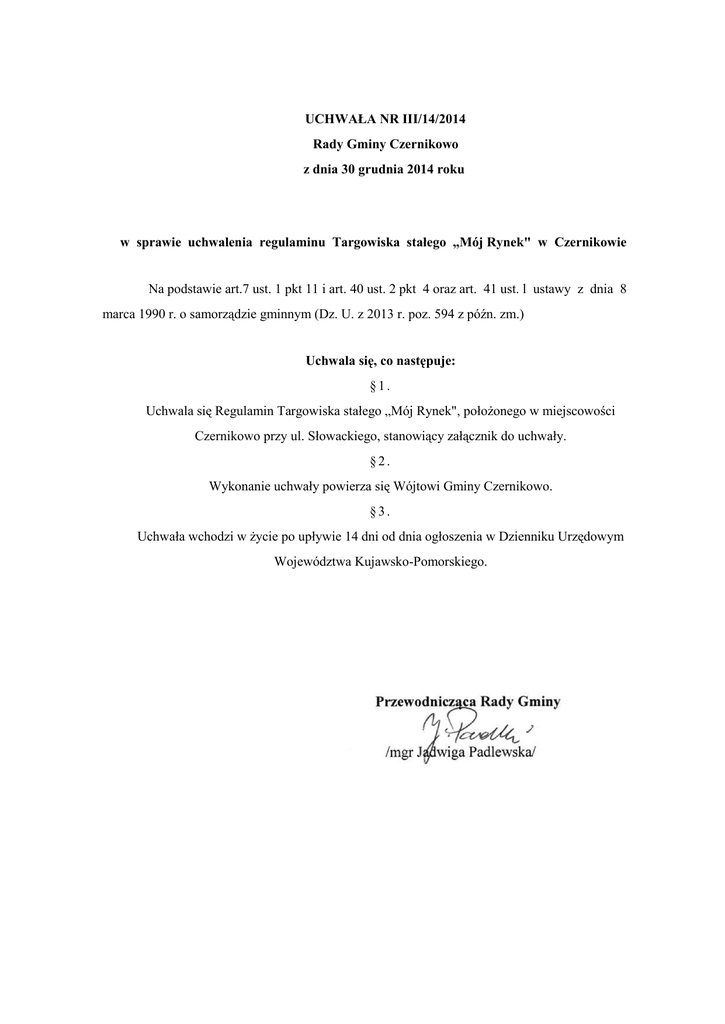 UCHWAŁA NR III/14/2014 Rady Gminy Czernikowo z dnia 30 grudnia 2014 roku w sprawie uchwalenia regulaminu Targowiska stałego „Mój Rynek" w Czernikowie Na podstawie art.7 ust. 1 pkt 11 i art. 40 ust. 2 pkt 4 oraz art. 41 ust. l ustawy z dnia 8 marca 1990 r. o samorządzie gminnym (Dz. U. z 2013 r. poz. 594 z późn. zm.) Uchwala się, co następuje: §1. Uchwala się Regulamin Targowiska stałego „Mój Rynek", położonego w miejscowości Czernikowo przy ul. Słowackiego, stanowiący załącznik do uchwały. §2. Wykonanie uchwały powierza się Wójtowi Gminy Czernikowo. §3. Uchwała wchodzi w życie po upływie 14 dni od dnia ogłoszenia w Dzienniku Urzędowym Województwa Kujawsko-Pomorskiego. Uzasadnienie do Uchwały Nr 111/14/2014 Rady Gminy Czernikowo z dnia 30 grudnia 2014 roku Przedmiotowa uchwała związana jest z realizacją przez Gminę Czernikowo zadania inwestycyjnego polegającego na budowie targowiska stałego „ Mój Rynek" wraz z niezbędną infrastrukturą w miejscowości Czernikowo. Na realizację zadania pozyskano dofinansowania w ramach działania 321 "Podstawowe usługi dla gospodarki i ludności wiejskiej" objętego Programem Rozwoju Obszarów Wiejskich na lata 2007-2013. W tym celu konieczne jest stworzenie jasnych i jednolitych zasad korzystania z mającego powstać w ramach programu „Mój Rynek" targowiska. Wobec powyższego podjęcie przedmiotowej uchwały uważa się za zasadne. Załącznik Nr 1 do Uchwały Nr 111/14/2014 Rady Gminy Czernikowo z dnia 30 grudnia 2014 roku REGULAMIN TARGOWISKA STAŁEGO „MÓJ RYNEK" położonego w Czernikowie przy ul. Słowackiego 1. 2. 3. 4. 5. 6. 7. 8. 9. §1. Prowadzenie targowiska stałego przy ul. Słowackiego jest zadaniem własnym Gminy Czernikowo, służącym zaspokajaniu potrzeb zbiorowych mieszkańców. Targowisko jest prowadzone i zarządzane przez Gminę Czernikowo. Gmina Czernikowo może zawierać umowy cywilno - prawne dotyczące rezerwacji stanowisk do sprzedaży z osobami prowadzącymi handel na targowisku. Od osób prowadzących handel na targowisku pobiera się opłatę targową dzienną, zgodnie z Uchwałą Rady Gminy Czernikowo. Opłata targowa pobierana jest przez inkasenta, upoważnionego przez Radę Gminy Czernikowo. Dowodem uiszczenia opłaty jest bloczek opłaty targowej. Do obowiązków administratora targowiska należy w szczególności: 1. utrzymanie targowiska i terenów go otaczających w należytym stanie sanitarno- porządkowym poprzez zapewnienie systematycznego sprzątania i wywozu śmieci, 2. egzekwowanie przestrzegania przez sprzedających i kupujących zasad korzystania z targowisk oraz obowiązujących przepisów sanitarnych, 3. przestrzeganie oraz realizacja warunków zasad korzystania z targowiska, 4. zorganizowanie odpowiedniego dostępu do informacji dla sprzedających i kupujących, 5. pobieranie przez inkasenta dziennej opłaty targowej. Administrator targowiska zobowiązany jest do umieszczenia w miejscu ogólnie dostępnym tablicy ogłoszeń zawierającej w szczególności: 1. obowiązujące uchwały Rady Gminy Czernikowo w sprawie opłat targowych i zasad korzystania z targowisk, 2. obowiązujące w handlu artykułami spożywczymi oraz gastronomii podstawowe przepisy sanitarne i weterynaryjne oraz inne obowiązujące przepisy związane z działalnością prowadzoną na targowisku. Targowisko czynne jest od poniedziałku do piątku od godz. 6:00 do godz. 18:00, w soboty od godz. 6:00 do godz. 14:30. Nadzór nad prowadzeniem targowiska sprawuje Wójt Gminy Czernikowo. §2. 1. Na targowisku sprzedaż mogą prowadzić osoby fizyczne, prawne oraz jednostki organizacyjne nieposiadające osobowości prawnej mogące uczestniczyć w obrocie handlowym, 2. Targowisko jest podzielone na sekcje, w których sprzedawane są towary danego rodzaju, 3. Wydzielone są stanowiska dla prowadzących sprzedaż produktów rolno - spożywczych oraz pozostałych produktów, 4. Stanowiska do sprzedaży produktów rolno - spożywczych zajmują minimum połowę powierzchni handlowej targowiska, 5. W przypadku braku zainteresowania sprzedażą towarów rolno-spożywczych w danym dniu targowym, dopuszcza się możliwość zagospodarowania niewykorzystanych stanowisk poprzez sprzedaż pozostałych towarów, 6. Targowisko oznaczone jest tablicą o treści „Mój Rynek ", 7. Regulamin obowiązuje wszystkie korzystające z targowiska podmioty. 1. 2. 3. 4. 5. 6. 7. 8. §3. Na targowisku mogą być sprzedawane wszystkie dopuszczone do obrotu towary z wyjątkiem tych, których sprzedaż jest zabroniona na podstawie przepisów szczególnych. Na targowisku nie mogą być sprzedawane: 1. napoje alkoholowe; 2. nafta, benzyna, spirytus skażony, trucizny, środki lecznice z wyjątkiem ziół; 3. kamienie szlachetne i inne tego typu przedmioty; 4. zagraniczne banknoty i monety oraz papiery wartościowe; 5. broń, amunicją materiały pirotechniczne i wybuchowe oraz wszelkiego rodzaju przedmioty ekwipunku wojskowego; 6. dietetyczne środki spożywcze; 7. mleko niepasteryzowane; 8. dziczyzna; 9. pieczywo i wyroby ciastkarskie nieopakowane; 10.grzyby i przetwory grzybowe z wyjątkiem hodowlanych; 11.środki ochrony roślin; 12.metale szlachetne oraz wykonywane z nich przedmioty. Ryby i przetwory rybne mogą być sprzedawane przy użyciu specjalistycznych środków transportowych służących do obwoźnej sprzedaży tych artykułów, zapewniających odpowiednie warunki sanitarne. Sprzedaż mięsa, jego przetworów, drobiu, tłuszczu zwierzęcego i roślin może być prowadzona wyłącznie w miejscach wyznaczonych w uzgodnieniu z właściwym inspektorem sanitarnym. Produkty wytworzone w gospodarstwach rolnych, ogrodniczych, sadowniczych i hodowlanych mogą być sprzedawane przez ich producentów w stanie nieprzetworzonym. Sprzedaż na targowisku może być prowadzona ze straganów, stolików, pawilonów, z koszy, z ręki, itp. Sprzedający może zajmować tylko stanowisko lub stanowiska, za które uiścił opłatę targ