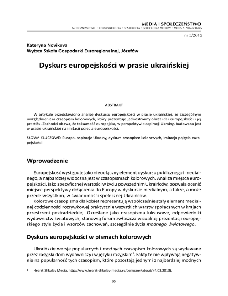 MEDIOZNAWSTWO . KOMUNIKOLOGIA . MEDIA I SPOŁECZEŃSTWO SEMIOLOGIA . SOCJOLOGIA MEDIÓW . MEDIA A PEDAGOGIKA nr 5/2015 Kateryna Novikova Wyższa Szkoła Gospodarki Euroregionalnej, Józefów Dyskurs europejskości w prasie ukraińskiej ABSTRAKT W artykule przedstawiono analizę dyskursu europejskości w prasie ukraińskiej, ze szczególnym uwzględnieniem czasopism kolorowych, który prezentuje jednostronny obraz idei europejskości i jej prestiżu. Zachodzi obawa, że tożsamość europejska, w perspektywie aspiracji Ukrainy, budowana jest w prasie ukraińskiej na imitacji pojęcia europejskości. SŁOWA KLUCZOWE: Europa, aspiracje Ukrainy, dyskurs czasopism kolorowych, imitacja pojęcia europejskości Wprowadzenie Europejskość występuje jako nieodłączny element dyskursu publicznego i medialnego, a najbardziej widoczna jest w czasopismach kolorowych. Analiza miejsca europejskości, jako specyficznej wartości w życiu powszednim Ukraińców, pozwala ocenić miejsce perspektywy dołączenia do Europy w dyskursie medialnym, a także, a może przede wszystkim, w świadomości społecznej Ukraińców. Kolorowe czasopisma dla kobiet reprezentują współcześnie stały element medialnej codzienności rozrywkowej praktycznie wszystkich warstw społecznych w krajach przestrzeni postradzieckiej. Określane jako czasopisma luksusowe, odpowiedniki wydawnictw światowych, stanowią forum zwłaszcza wizualnej prezentacji europejskiego stylu życia i wzorców zachowań, szczególnie życia modnego, światowego. Dyskurs europejskości w pismach kolorowych Ukraińskie wersje popularnych i modnych czasopism kolorowych są wydawane 1 przez rosyjski dom wydawniczy i w języku rosyjskim . Fakty te nie wpływają negatywnie na popularność tych czasopism, które pozostają jednymi z najbardziej modnych 1 Hearst Shkulev Media, http://www.hearst-shkulev-media.ru/company/about/ (4.03.2013). 95 Kateryna Novikova czasopism luksusowych na ukraińskim rynku medialnym. Ukraińska wersja „Marie Claire” jest wydawana od 2008 roku, natomiast „Elle” od roku 2001. Zatem oba czasopisma funkcjonują na ukraińskim rynku od dłuższego czasu, co więcej, „Elle” od 2 dwóch lat ma największy nakład wśród czasopism modowych . Rocznik i numer każdego z czasopism był wybrany do badań losowo (2009, 2012). Fakt, że wyżej wymienione pisma funkcjonujące na ukraińskim rynku wydawniczym wydawane są w języku rosyjskim, jest niezwykle ważnym aspektem analizy dyskursu europejskości. Zjawisko wpisuje się w powracającą okresowo wpływową tendencję prowincjonalizacji języka ukraińskiego jako języka głównie kultury ludowej, literatury klasycznej oraz chwiejnej państwowości niepodległej Ukrainy. Ukraińska prasa rozrywkowa występuje, dzięki językowi rosyjskiemu, jako nieodłączna część specyficznej postradzieckiej przestrzeni popkulturowej, co przejawia się zarówno w tym, że siedziby redakcji znajdują się najczęściej w Moskwie, jak i w odwoływaniu się do wspólnych wartości post-Homo sovieticus, do wspólnego bogatego dziedzictwa radzieckiej kultury popularnej (literatura, kino, prasa, celebryci). W tej sytuacji niełatwo byłoby, na przykład, znaleźć różnice między postrzeganiem Europy i europejskości w Rosji, Ukrainie i na Białorusi w prasie rozrywkowej, gdyż najprawdopodobniej różnią się one tylko doborem innych, lokalnych gwiazd, celebrytów i działaczy, których siedzibą są odpowiednio Moskwa, Kijów czy Mińsk. Czasopisma kolorowe zajmują wyjątkowe miejsce w życiu codziennym, powszednim odbiorców. Zgodnie ze Słownikiem współczesnego języka polskiego „powszedni” oznacza „związany z codziennością, zwyczajnością, pozbawiony uroku niezwykłości, 3 świąteczności, niecodzienności, zwyczajny, zwykły, codzienny” . Jednak wizerunek świata w tych czasopismach odbiega zasadniczo od codzienności ukraińskiego odbiorcy. Istotnym elementem dyskursu europejskości w czasopismach kolorowych jest używanie licznych wyrazów zapożyczonych. Słowa te nie są objaśniane, lecz są używane w sposób, który zakłada, że czytelnik je zna, zrozumie kontekst ezoteryczny oraz cel, w jakim takie, a nie inne słowo zostało użyte. Dzięki temu ma on nabrać pewności siebie, i pewności co do swojej wiedzy o świecie, i można rzec, udowodnić 4 swoją „światowość” i „europejskość” . Niewątpliwie można się zgodzić, że codzienność europejska składa się nie tylko z obrazów, którymi mogą się pochwalić i wyróżnić czasopisma kolorowe, lecz również 5 z elementów „niewidzialnych”, zapachów, dźwięków i innych wrażeń . Jednak tak abstrakcyjne pojęcia, jak „europejskość” oraz „wizerunek bycia Europejczykiem” 2 O czasopiśmie ELLE, list redaktora, http://elle.com.ua/static/o_jurnale (4.03.2013). B. Dunaj, Słownik współczesnego języka polskiego, Warszawa 1996, s. 833. 4 Na przykład brasserie, fusion lub street style, „Elle”, 2012, nr 10. Niekiedy wydaje się, że łatwiej redaktorom użyć jakiegoś obcego terminu, niż długiego tłumaczenia na język czasopisma (na przykład szereg wyrazów z dodatkami friendly, beauty, must). 5 I. Borkowska, H. Jakubowska, M. Podgórski, Metodologia dla socjologii codzienności, [w:] Społeczeństwo i codzienność. W stronę nowej socjologii, S. Rudnicki, J. Stypińska, K. Wojnicka (red.), Warszawa 2009, s. 67-68. 3 96 Dyskurs europejskości w prasie ukraińskiej najpełniej wyrażają się w zdjęciach, w medialnym dyskursie wizualnym, a jeszcze bardziej w podpisach do tych zdjęć, zwłaszcza w odniesieniu do nowinek i modnych tendencji ilustrowanych tymi zdjęciami. Niekiedy jest proponowana nawet „ścieżka dźwiękowa”, która powinna stworzyć odpowiedni nastrój do czytania i oglądania. Jest to lista utworów, które czytelnik będzie umiał znaleźć w Internecie, na YouTube, 6 czy jednym z serwisów peer-to-peer do ściągnięcia za darmo . Normalna