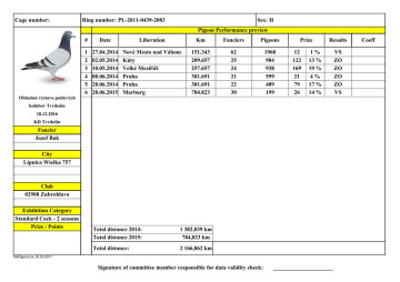 Cage number: Ring number: PL-2011-0439-2083 Sex: H Pigeon Performance preview Oblastná výstava poštových # Date Liberation Km Fanciers Pigeons 1 2 3 4 5 6 27.04.2014 02.05.2014 10.05.2014 08.06.2014 28.06.2014 28.06.2015 Nové Mesto nad Váhom Kúty Velké Meziříčí Praha Praha Marburg 151.343 209.657 257.657 381.691 381.691 784.823 62 25 24 21 22 30 1968 984 938 599 489 199 Prize 12 122 169 21 79 26 Results 1% 13 % 19 % 4% 17 % 14 % holubov Tvrdošín 18.12.2016 KD Tvrdošín Fancier Jozef Bak City Lipnica Wielka 757 Club 02908 Zubrohlava Exhibition Category Standard Cock - 2 seasons Prize / Points Total distance 2014: Total distance 2015: 1 382,039 km 784,823 km Total distance: 2 166,862 km MyPigeons.eu 02.03.2017 Signature of committee member responsible for data validity check: _____________________ VS ZO ZO ZO ZO VS Coeff