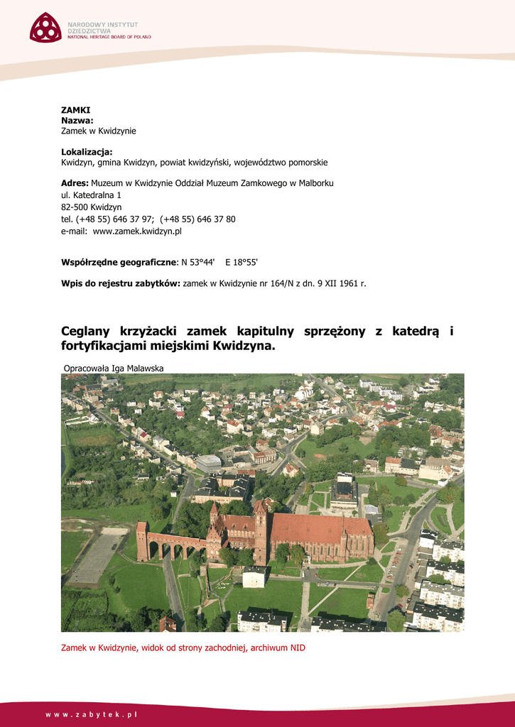 ZAMKI Nazwa: Zamek w Kwidzynie Lokalizacja: Kwidzyn, gmina Kwidzyn, powiat kwidzyński, województwo pomorskie Adres: Muzeum w Kwidzynie Oddział Muzeum Zamkowego w Malborku ul. Katedralna 1 82-500 Kwidzyn tel. (+48 55) 646 37 97; (+48 55) 646 37 80 e-mail: www.zamek.kwidzyn.pl Współrzędne geograficzne: N 53°44' E 18°55' Wpis do rejestru zabytków: zamek w Kwidzynie nr 164/N z dn. 9 XII 1961 r. Ceglany krzyżacki zamek kapitulny sprzężony z katedrą i fortyfikacjami miejskimi Kwidzyna. Opracowała Iga Malawska Zamek w Kwidzynie, widok od strony zachodniej, archiwum NID W Kwidzynie przez blisko dwa stulecia istniały dwa zamki: rezydencja biskupa, Altschlösschen (obecnie nieistniejąca) oraz zamek kapitulny, Marienwerder sprzężony z katedrą. W pierwszych wiekach naszej ery tereny wokół obecnego Kwidzyna leżały na szlaku bursztynowym. Intensywny handel spowodował powstanie prężnego ośrodka osadniczego. Od drugiej połowy X do XII wieku tereny te znalazły się na pograniczu pruskim i tworzonego przez pierwszych Piastów państwa polskiego. Średniowieczny gród, a później lokowane miasto, pojawia się w źródłach jako Quidino. Nazwa ma pochodzenie pruskie i oznacza imię władającego tymi ziemiami (Quede). W roku 1233 na tereny wokół dzisiejszego Kwidzyna przybyli krzyżacy i założyli na wyspie pomiędzy Wisłą a Starym Nogatem umocnienia nazywane Wyspą Panny Marii (Sankt Marienwerer (niem.) lub Insula Sanctae Mariae (łac.). Krzyżacki gród stał się bazą w wyprawach przeciwko Prusom. Na północ od grodu lokowano wkrótce, być może w 1235 r. miasto na prawie chełmińskim. To pierwsze miasto, jeszcze drewniane, uległo zniszczeniu w latach 1242-1243 w czasie powstania Prusów przeciw krzyżakom. Na miejscu spalonego grodu w latach 1243-50 zbudowano nowy, murowany zamek. Była to stosunkowo niewielka budowla, wzniesiona na planie czworoboku z ustawionymi prostopadle dwoma piętrowymi skrzydłami wyposażonymi w trzy przysadziste wieże. To kamienno-ceglane obronne założenie zdołało oprzeć się atakom Prusów podczas kolejnych powstań w latach 1263 i 1277. Jednak w roku 1520 warownię zniszczyły oddziały polskie i niedługo potem uległa ona rozbiórce. Resztki śladów po starej twierdzy zatarto na początku XX wieku. O ich przeszłości świadczy dziś jedynie nazwa ulicy biegnącej przy dawnej fosie - ulicy Starozamkowej. W 1243 roku na mocy bulli papieża Innocentego IV powstały cztery biskupstwa: chełmińskie, warmińskie, sambijskie i pomezańskie. Zgodnie z rozporządzeniem papieskim każde biskupstwo podzielono na trzy równe części, z których dwie przypadały krzyżakom, a jedna biskupowi. W ramach podziału terytorium Pomezanii między zakon i kościół, omawianą powyżej murowaną warownię powstałą na miejscu spalonego drewnianego grodu, krzyżacy przekazali biskupowi pomezańskiemu na jego rezydencję (1250 r.). W 1254 roku pierwszy biskup pomezański, dominikanin Ernest z Targawy (1246-1260) urządził w Kwidzynie stolicę biskupstwa pomezańskiego. Znaczenie miasta wzrosło jeszcze bardziej w 1285 roku, kiedy powołano tu kapitułę pomezańską (zgromadzenie osób duchownych, których zadaniem był m.in. wybór biskupa). Wtedy też podniesiono istniejący kościół farny do rangi katedry. Wraz z kapitułą przejęto regułę krzyżacką i odtąd kanonikami mogli zostawać wyłącznie krzyżacy. Gdy w 1284 roku powołano pierwszych członków kapituły, zaczęto zastanawiać się nad ustanowieniem godnej siedziby. Niewielki zamek biskupi nie mógł pełnić należycie nowych funkcji , dlatego jeszcze pod koniec XIII wieku przystąpiono do budowy drugiego zamku. Usytuowano go po przeciwległej stronie ówczesnego miasta, a budowa przebiegała w kilku etapach. Do 1312 r. prowadzono prace przygotowawcze wraz z niwelacją terenu. Następnie wymurowano kamienne fundamenty murów zewnętrznych i wieży głównej. Do roku 1338 zbudowano sąsiadujące pierwotnie z kościołem skrzydło wschodnie. Potem powstał dom południowy połączony z wielką wieżą-dzwonnicą, a w latach następnych postawiono mury skrzydła zachodniego oraz północnego. Czworoboczne założenie z wewnętrznym dziedzińcem oraz narożnymi wieżyczkami ukształtowano ostatecznie w latach 1340-50. W drugiej połowie XIV stulecia dostawiono korpus łączący kościół z zamkiem, zbudowano krużganki oraz wzniesiono wieżę studzienną i wieżę latrynową. Obiekt w XV i XVI wieku był kilkukrotnie oblegany i niszczony. 19 września 1410 roku do zamku wkroczyły wracające spod Malborka wojska Władysława Jagiełły. W roku 1460 warownię zdobył polski burgrabia, Andrzej Puszkarz. Kolejne najazdy i zniszczenia przyniosły lata 1478 (tzw. wojna księża, Pfaffen Krieg) oraz 1520, kiedy to, podczas ostatniej konfrontacji polsko-krzyżackiej, Polacy podeszli pod Kwidzyn. Silny ostrzał artyleryjski zniszczył wówczas jedną z kaplic katedry i w poważnym stopniu uszkodził zamek oraz miejskie mury obronne. W rezultacie działań wojennych Kwidzyn przeszedł w ręce polskie, a skapitulowani kanonicy złożyli przysięgę wierności królowi Zygmuntowi I. Po sekularyzacji zakonu krzyżackiego w 1526 roku, diecezja pomezańska przeszła na luteranizm, a zamek stał się siedzibą kapituły protestanckiej. Z uwagi na zły stan dotychczasowej (starej) rezydencji, biskupi przejęli zamek kapitulny i zamieszkiwali tu do roku 1551. Jeden z nich - Paweł Speratus otrzymał zezwolenie na wykorzystanie stu tysięcy cegieł ze starego założenia na odbudowę zamku kapitulnego. Od tego czasu stary zameczek, jak określano pierwotną rezydencję biskupa pomezańskiego, stał się ruiną. W czasie „potopu” szwedzkiego zespół zamku kapitulnego był uszkodzony w niewielkim stopniu. W latach 1758 – 63 na przedzamczu wybudowano pałac dla rosyjskiego generała Wilhelma Fermora – Anglika w służbie cesarzowej Elżbiety – okupującego miasto w czasie wojny siedmiol