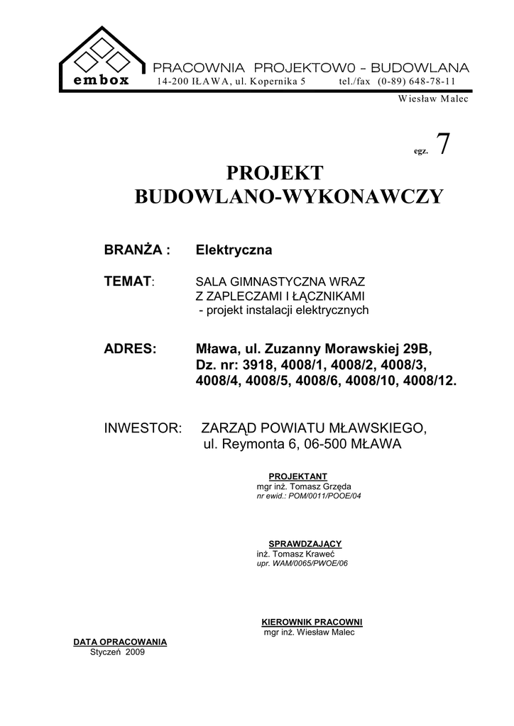 em box 14-200 IŁA W A , ul. K opernika 5 tel./fax (0-89) 648-78-11 W iesław M alec egz. 7 PROJEKT BUDOWLANO-WYKONAWCZY BRANśA : Elektryczna TEMAT: SALA GIMNASTYCZNA WRAZ Z ZAPLECZAMI I ŁĄCZNIKAMI - projekt instalacji elektrycznych ADRES: Mława, ul. Zuzanny Morawskiej 29B, Dz. nr: 3918, 4008/1, 4008/2, 4008/3, 4008/4, 4008/5, 4008/6, 4008/10, 4008/12. INWESTOR: ZARZĄD POWIATU MŁAWSKIEGO, ul. Reymonta 6, 06-500 MŁAWA PROJEKTANT mgr inŜ. Tomasz Grzęda nr ewid.: POM/0011/POOE/04 SPRAWDZAJĄCY inŜ. Tomasz Kraweć upr. WAM/0065/PWOE/06 KIEROWNIK PRACOWNI mgr inŜ. Wiesław Malec DATA OPRACOWANIA Styczeń 2009 Zawartość projektu : I Uprawnienia.......................................................................................................................... 3 II Zaświadczenie z Izby........................................................................................................... 5 III Oświadczenie Projektanta .................................................................................................. 7 Normy i przepisy..................................................................................................................... 8 IV Warunki przyłaczenia ...................................................................................................... 11 V Opis techniczny ................................................................................................................. 15 1. Podstawa opracowania ................................................................................................... 15 2. Przedmiot opracowania .................................................................................................. 15 3. Zasilenie obiektu w energię elektryczną ........................................................................ 15 4. Rozdzielnica obiektu RG................................................................................................ 15 5. Instalacje oświetleniowe................................................................................................. 16 6. Instalacje oświetlenia ewakuacyjnego............................................................................ 16 7. Instalacje gniazdowe i siłowe ......................................................................................... 16 8. Instalacja odgromowa..................................................................................................... 17 9. PrzeciwpoŜarowy wyłącznik prądu ................................................................................ 17 10. Środki ochrony przeciwporaŜeniowej......................................................................... 17 11. Połączenia wyrównawcze ........................................................................................... 18 12. Ochrona przeciwprzepięciowa .................................................................................... 18 13. Instalacja nagłośnieniowa ........................................................................................... 18 14. Tablica wyników ......................................................................................................... 18 15. Uwagi ogólne .............................................................................................................. 19 16. Obliczenia.................................................................................................................... 20 VI Spis Rysunków................................................................................................................. 22 E/01 Oświetlenie terenu - rzut............................................................................................... 24 E/02 Schemat zasilania – rozdzielnica TG............................................................................ 25 E/03 Schemat zasilania oświetlenia terenu ........................................................................... 26 E/04 Rzut Przyziemia – oświetlenie...................................................................................... 27 E/05 Rzut Przyziemia – gniazda i siła................................................................................... 28 E/06 Rzut piętra – oświetlenie .............................................................................................. 29 E/07 Rzut piętra – gniazda i siła............................................................................................ 30 E/08 Rzut dachu instalacja uziemienia i odgromowa .......................................................... 31 VII Załączniki ..................................................................................................................32-75 strona 2 I Uprawnienia strona 3 II Zaświadczenie z Izby strona 4 strona 5 strona 6 III Oświadczenie Projektanta Oświadczam, iŜ niniejszy projekt instalacji elektrycznych dotyczący SALI GIMNASTYCZNEJ Z ŁĄCZNIKAMI W MŁAWIE, przy Mława, ul. Zuzanny Morawskiej 29B, jest zgodny z obowiązującymi przepisami oraz zasadami wiedzy technicznej. Tomasz Grzęda Tomasz Kraweć strona 7 Normy i przepisy Podstawą opracowywanego projektu powinny być obowiązujące w Polsce normy i przepisy, a w szczególności: PN-IEC 60364-1:2000 Instalacje elektryczne w obiektach budowlanych. Zakres przedmiot i wymagania podstawowe. PN-IEC 60364-3:2000 Instalacje elektryczne w obiektach budowlanych. Ustalenie ogólnych charakterystyk. PN-IEC 60364-1:2000 Instalacje elektryczne w obiektach budowlanych. Zakres przedmiot i wymagania podstawowe. PN-IEC 60364-4-41:2000 Instalacje elektryczne w obiektach budowlanych. Ochrona dla zapewnienia bezpieczeństwa. Ochrona przeciwporaŜeniowa, PN-IEC 60364-4-42:1999 Instalacje elektryczne w obiektach budowlanych. Ochrona dla zapewnienia bezpieczeństwa. Ochrona przed skutkami oddziaływania cieplnego. PN-IEC 60364-4-43:1999 Instalacje elektryczne w obiektach budowlanych. Ochrona dla zapewnienia bezpieczeństwa. Ochrona p
