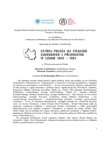 Instytut Historii Sztuki Uniwersytetu Wrocławskiego i Polski Instytut Studiów nad Sztuką Świata w Warszawie we współpracy z Muzeum Architektury oraz Muzeum Narodowym we Wrocławiu zapraszają do udziału w konferencji w 70-lecie powrotu do Polski Muzeum Architektury (architektura, dizajn) Muzeum Narodowe (sztuki plastyczne) w dniach 16-18 listopada 2015 roku we Wrocławiu Nie napisano niestety dotąd historii sztuki polskiej, która zaczynałaby się na Ziemiach Zachodnich i Północnych tzw. Odzyskanych. A przecież to kusząca perspektywa, sięgająca do innych niż stereotypowe cech Polaków – do ich nowoczesności, humoru i pracowitości. Trudno dzisiaj w ogóle pomyśleć o polskiej sztuce współczesnej bez Wrocławia, Gdańska, Szczecina, Elbląga, Olsztyna, Koszalina, Opola czy Gliwic. Bez Kiejstuta Bereźnickiego, Waldemara Cwenarskiego, Jerzego Grotowskiego, Natalii LL, Gerarda „Bluma" Kwiatkowskiego, Barbary Kozłowskiej, Jerzego Rosołowicza… Bez krzesła nr 366 Józefa Chierowskiego, ceramiki Krystyny Cybińskiej, tkanin Barbary Hulanickiej i bez wrocławskiego trzonoliniowca – modernistycznego budynku, zwanego pieszczotliwie wisielcem… To tu, na Ziemiach Odzyskanych, nastąpiło scalanie się środowisk artystów m.in. ze Lwowa i Krakowa, a także Francji (Józef Gielniak). Ziemie Odzyskane stały się miejscem osadnictwa Polaków z utraconych kresów wschodnich, a także przesiedleń ludnościowych, m.in. Bojków, Łemków i Ukraińców, w ramach tzw. akcji „Wisła”. Sam Dolny Śląsk stał się ponadto po wojnie obszarem osadnictwa ocalałych z Zagłady Żydów, nadzieją na odbudowę ich życia w Polsce. A także miejscem, gdzie po 1949 roku osiedlali się Grecy i Macedończycy. Do programu konferencji został włączony Gdańsk. Jako dawne Wolne Miasto nie wchodził w skład Ziem Odzyskanych. Jednak powojenne procesy kulturotwórcze w Gdańsku bliskie są problematyce tych Ziem. 1 Uruchomiona niedawno i wspaniale funkcjonująca, dzięki najlepszym polskim artystom Akademia Sztuki w Szczecinie, jest spadkobierczynią twórczej mobilizacji miasta, jaka była związana z organizacją tam od 1962 roku Festiwali Polskiego Malarstwa Współczesnego. Państwowa Wyższa Szkoła Sztuk Plastycznych, dziś Akademia Sztuk Pięknych w Gdańsku, założona znacznie wcześniej, bo od razu po wojnie, w 1945 roku, wraz z powołanymi trzy lata później Festiwalem Sztuk Plastycznych w Sopocie, osiągnęła szybko poziom rozpoznawalnej oryginalności, dzięki postawieniu na „prawdziwe malarstwo.” Instytut Sztuki Uniwersytetu Opolskiego narodził się co prawda dopiero po upadku starego systemu (1990), ale prężnie działające Muzeum Śląska Opolskiego – które zaczynało już w 1945 roku jako Polskie Muzeum Miejskie – ze znakomitą dziś kolekcją obrazów, m.in. Krzysztofa Buckiego i Jana Cybisa, jest ważnym punktem na artystycznej mapie Polski. Wrocław dla artystów lat 70. pozostawał fenomenem porównywalnym wręcz z Nowym Jorkiem i Amsterdamem; był stolicą polskiego konceptualizmu i stolicą teatralną Europy. Tu działał teatr sensybilistów, zadający kłam opiniom historyków sztuki z centralnej Polski, że w Polsce nie było tradycji dadaistycznej oraz Jerzy Grotowski, jeden z najwspanialszych twórców teatru w całej naszej historii, a ponadto także Jerzy Ludwiński, krytyk i twórca autorskiej Galerii pod Moną Lizą. Olsztyńskie środowisko plastyczne początkowo działało co prawda jako delegatura bydgoskiego ZPAP, jednak ukonstytuowanie się olsztyńskiego oddziału związku wymusiło wkrótce powstanie lokalu BWA i zaowocowało szybko ciekawymi wystawami lokalnego środowiska, a w 2009 roku założeniem Wydziału Sztuki Uniwersytetu WarmińskoMazurskiego. Leżący niewiele ponad godzinę jazdy od Olsztyna Elbląg to siedziba słynnej galerii El, a inicjatywa jej szefa Gerarda Kwiatkowskiego - pracującego w zakładach „Zamech” - by powołać Biennale Form Przestrzennych (1965), wywołała brzemienne skutki dla wchodzenia najnowszej plastyki w przestrzeń publiczną. Współpracy z robotnikami nigdy potem nie traktowano zaś chyba z równą powagą. Najciekawsze plenery i sympozja artystyczne doby PRL-u odbywały się zresztą na Ziemiach Odzyskanych, m.in. Sympozja "Złotego Grona" organizowane w Zielonej Górze w latach 1963-1981, Sympozjum Wrocław ’70, plener "Ziemia Zgorzelecka" w Opolnie-Zdroju (1971) czy Sympozjum w Turoszowie (1971) oraz plenery w Osiekach (1963-1981). Utworzenie Wydziałów Architektury na Politechnikach we Wrocławiu, Gdańsku, Szczecinie i Gliwicach umożliwiło wykuwanie kadr dla terenów, które wymagały przede wszystkim szybkiej odbudowy i tworzenia infrastruktury mieszkaniowej i budowli użyteczności publicznej. Równocześnie miejsca te stały się ostoją przede wszystkim dla profesorów i architektów ze środowiska lwowskiego i wileńskiego, którzy do nowych ośrodków przenieśli swoje doświadczenie modernizmu lata trzydziestych. Nurt modernizmu, przygaszony nieco w pierwszej połowie lat pięćdziesiątych, odżył po odwilży 1956 roku i w następnych piętnastu latach przyniósł bardzo interesujące rozwiązania. Jednocześnie jednak mizeria gospodarcza epoki Gomułki, wprowadzenie normatywów i braki materiałów niweczyły, czasem gruntownie, ciekawe pomysły. Stąd “niechciane dziedzictwo architektury okresu PRL-u” ma tak skomplikowane oblicze i budzi tyle kontrowersji. Celem konferencji będzie wydobycie nie tylko blasków, lecz także i cieni dziejów architektury na tych ziemiach. Trudna w ocenie i budzące szczególne emocje jest odbudowa/ zniszczenie miast na Ziemiach Zachodnich i Północnych; ten temat także będzie przedmiotem obrad. Genius loci tzw. Ziem Odzyskanych nie sposób oddzielić od geografii historycznej i krytycznej aplikacji jej metodologii. Z jednej strony refleksji wymaga ukorzenianie się kultury polskiej i jej oswajanie, z drugiej – konstrukcja okreś