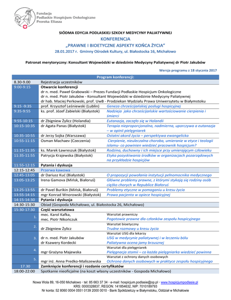 SIÓDMA EDYCJA PODLASKIEJ SZKOŁY MEDYCYNY PALIATYWNEJ Patronat merytoryczny: Konsultant Wojewódzki w dziedzinie Medycyny Paliatywnej dr Piotr Jakubów Wersja programu z 18 stycznia 2017 Program konferencji: 8.30-9.00 9:00-9:15 Rejestracja uczestników Otwarcie konferencji dr n. med. Paweł Grabowski – Prezes Fundacji Podlaskie Hospicjum Onkologiczne dr n. med. Piotr Jakubów - Konsultant Wojewódzki w dziedzinie Medycyny Paliatywnej dr hab. Maciej Perkowski, prof. UwB - Prodziekan Wydziału Prawa Uniwersytetu w Białymstoku 9:15 -9:35 prof. Krzysztof Leśniewski (Lublin) Geneza chrześcijaoskiej posługi hospicyjnej 9:35-9:55 ks. prof. Józef Zabielski (Białystok) Nadzieja jako chrześcijaoskie wartościowanie cierpienia i śmierci 9:55-10:15 dr Zbigniew Żylicz (Holandia) Eutanazja, zaczęło się w Holandii 10:15-10:35 dr Agata Panas (Białystok) Terapia nieproporcjonalna, nadmierna, uporczywa a eutanazja – w opinii pielęgniarek 10:35-10:55 dr Jerzy Sojka (Warszawa) Ostatni akord życia – perspektywa ewangelicka 10:55-11:15 Osman Machaev (Czeczenia) Cierpienie, nieuleczalna choroba, umieranie w etyce i teologii islamu- co powinien wiedzied pracownik hospicjum? 11:15-11:35 ks. Marek Ławreszuk (Białystok) Rodzina, duchowny i ich miejsce przy umierającym człowieku 11:35-11:55 Patrycja Krajewska (Białystok) Etyka pozyskiwania środków w organizacjach pozarządowych na przykładzie hospicjów 11:55-12:15 Pytania i dyskusja 12:15-12:45 Przerwa kawowa 12:45-13:05 dr Dariusz Kud (Białystok) O propozycji powołania instytucji pełnomocnika medycznego 13:05-13:25 Irena Gamova (Miosk, Białoruś) Główne problemy prawne, z którymi stykają się rodziny osób ciężko chorych w Republice Białoruś 13:25-13:55 dr Pavel Burikin (Miosk, Białoruś) Problemy etyczne w pomaganiu u kresu życia 13:55-14:15 mgr Konrad Wnorowski (Białystok) Prawa pacjenta w opiece hospicyjnej 14:15-14:30 Pytania i dyskusja 14:30-15:30 Obiad (Gospoda Michałowo, ul. Białostocka 26, Michałowo) 15:30-17:30 Częśd warsztatowa Warsztat prawniczy mec. Karol Kafka, 1. Pogotowie prawne dla członków zespołu hospicyjnego mec. Piotr Nikooczuk 2. Warsztat bioetyczny dr Zbigniew Żylicz Trudne rozmowy u kresu życia Warsztat USG dla lekarzy 3. 4. 5. 17.30 18:00-22:00 dr n. med. Piotr Jakubów dr Ksawery Kordecki USG w medycynie paliatywnej i w leczeniu bólu Paliatywna ocena jamy brzusznej Warsztat dla pielęgniarek mgr Grażyna Majewska Pielęgnacja stomii – co każda pielęgniarka wiedzied powinna Warsztat z ochrony danych osobowych mgr inż. Anna Predko-Maliszewska Ochrona danych osobowych w praktyce zespołu hospicyjnego Zamknięcie konferencji i rozdanie certyfikatów Spotkanie nieoficjalne (na koszt własny uczestników - Gospoda Michałowo) Nowa Wola 89, 16-050 Michałowo · tel: 85 663 37 34 · e-mail: [email protected] · www.hospicjumpodlasie.pl KRS: 0000328837, REGON: 141854632, NIP: 7010189793 Nr konta: 52 8060 0004 0551 0139 2000 0010 · Bank Spółdzielczy w Białymstoku, Oddział w Michałowie