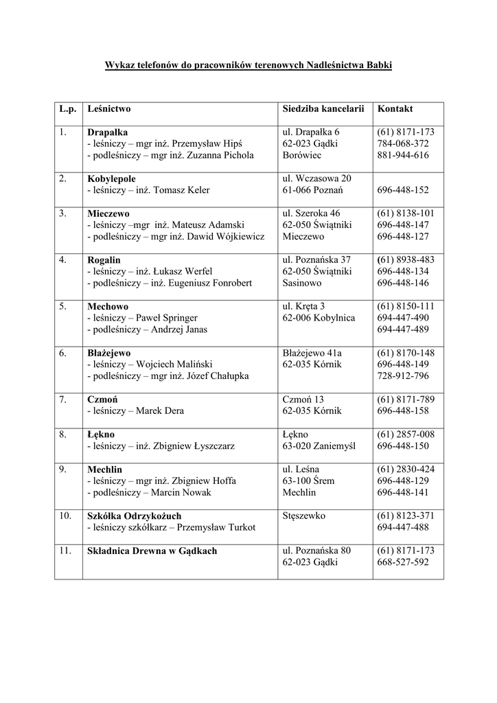 Kontakt do pracownikow terenowych Nadlesnictwa Babki