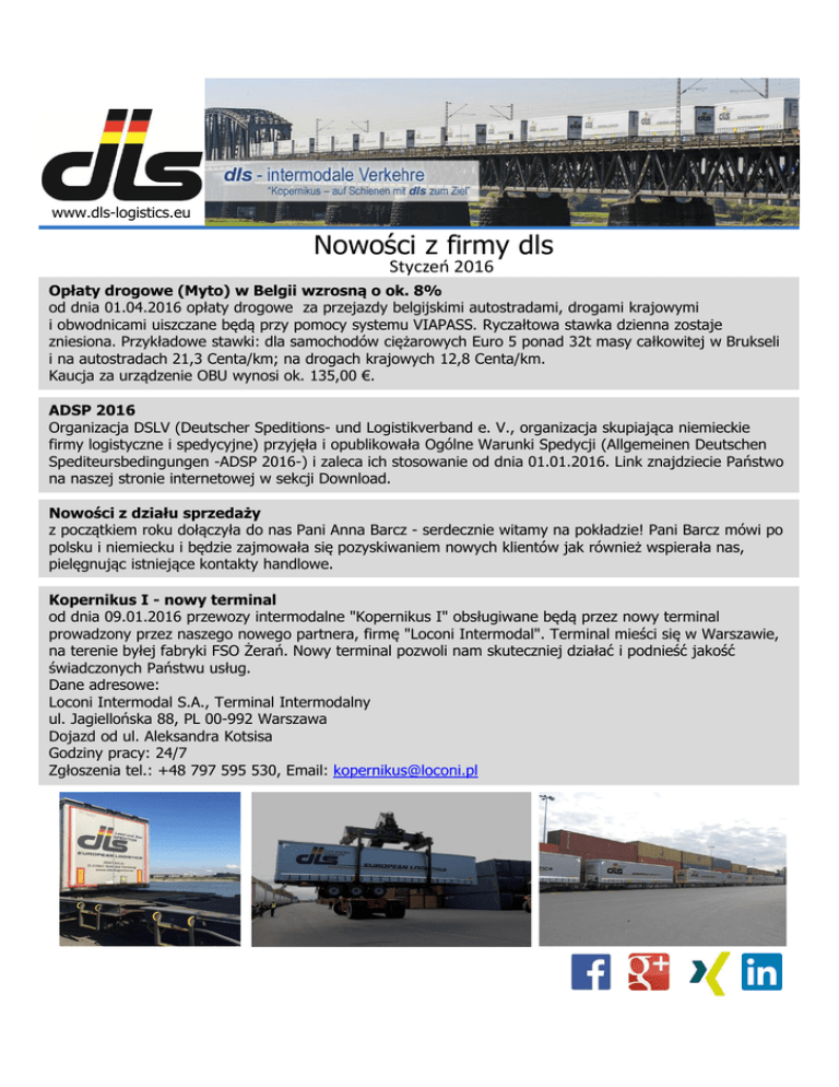 www.dls-logistics.eu Nowości z firmy dls Styczeń 2016 Opłaty drogowe (Myto) w Belgii wzrosną o ok. 8% od dnia 01.04.2016 opłaty drogowe za przejazdy belgijskimi autostradami, drogami krajowymi i obwodnicami uiszczane będą przy pomocy systemu VIAPASS. Ryczałtowa stawka dzienna zostaje zniesiona. Przykładowe stawki: dla samochodów ciężarowych Euro 5 ponad 32t masy całkowitej w Brukseli i na autostradach 21,3 Centa/km; na drogach krajowych 12,8 Centa/km. Kaucja za urządzenie OBU wynosi ok. 135,00 €. ADSP 2016 Organizacja DSLV (Deutscher Speditions- und Logistikverband e. V., organizacja skupiająca niemieckie firmy logistyczne i spedycyjne) przyjęła i opublikowała Ogólne Warunki Spedycji (Allgemeinen Deutschen Spediteursbedingungen -ADSP 2016-) i zaleca ich stosowanie od dnia 01.01.2016. Link znajdziecie Państwo na naszej stronie internetowej w sekcji Download. Nowości z działu sprzedaży z początkiem roku dołączyła do nas Pani Anna Barcz - serdecznie witamy na pokładzie! Pani Barcz mówi po polsku i niemiecku i będzie zajmowała się pozyskiwaniem nowych klientów jak również wspierała nas, pielęgnując istniejące kontakty handlowe. Kopernikus I - nowy terminal od dnia 09.01.2016 przewozy intermodalne "Kopernikus I" obsługiwane będą przez nowy terminal prowadzony przez naszego nowego partnera, firmę "Loconi Intermodal". Terminal mieści się w Warszawie, na terenie byłej fabryki FSO Żerań. Nowy terminal pozwoli nam skuteczniej działać i podnieść jakość świadczonych Państwu usług. Dane adresowe: Loconi Intermodal S.A., Terminal Intermodalny ul. Jagiellońska 88, PL 00-992 Warszawa Dojazd od ul. Aleksandra Kotsisa Godziny pracy: 24/7 Zgłoszenia tel.: +48 797 595 530, Email: [email protected]