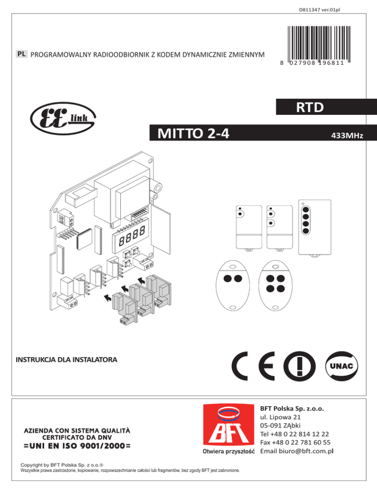D811347 ver.01pl PL PROGRAMOWALNY RADIOODBIORNIK Z KODEM DYNAMICZNIE ZMIENNYM 8 027908 196811 RTD MITTO 2-4 8 88 433MHz 8 INSTRUKCJA DLA INSTALATORA BFT Polska Sp. z.o.o. ul. Lipowa 21 05-091 ZĄbki Tel +48 0 22 814 12 22 Fax +48 0 22 781 60 55 Email [email protected] Copyright by BFT Polska Sp. z o.o.Ò Wszystkie prawa zastrzeżone, kopiowanie, rozpowszechnianie całości lub fragmentów, bez zgody BFT jest zabronione. INSTRUKCJA INSTALACJI POLSKI Dziękujemy Państwu za wybór produktu BFT. Jesteśmy pewni, że będą Państwo więcej niż zadowoleni z użytkowania naszego napędu do bram oraz innych elementów sterowania. Produkt jest dostarczany z instrukcją „użytkowania” i broszurą dotyczącą „Instalacji”. Obydwie części powinny zostać przeczytane uważnie, ponieważ dostarczają ważnych informacji o bezpieczeństwie i prawidłowym uruchomieniu napędu. Oświadczamy, że ten produkt jest zgodny z następującymi europejskimi Dyrektywami: 89/336/EEC, 73/23/EEC oraz 98/37/EWG (z późniejszymi zmianami). 1) ZASADY BEZPIECZEŃSTWA OSTRZEŻENIE! Niepoprawna instalacja albo niewłaściwe użycie produktu może spowodować uszkodzenie osób, zwierząt lub rzeczy. Instalacja musi być wykonana zgodnie z zaleceniami dotyczącymi zabezpieczeń i sterowań wymienionymi w EN 12978. Rozdział „ZASADY BEZPIECZEŃSTWA” oraz cała instrukcja instalacji i użytkownika dostarczone z tym produktem powinny być przeczytane uważnie, ponieważ dostarczają ważnych informacji o bezpieczeństwie, instalacji i użytkowaniu. l Odpady i materiały z opakowania (plastik, tektura, polistyren itd.) wykonane są zgodnie z warunkami określonymi przez aktualne europejskie standardy. Trzymaj torby z nylonu lub polistyrenu poza zasięgiem dzieci. l Przechowuj niniejszą instrukcję razem z opisem technicznym dla przyszłych przeglądów oraz napraw. l Ten produkt był zaprojektowany i wyprodukowany wyłącznie do użycia wyszczególnionego w obecnej dokumentacji. Jakiekolwiek inne użycie nie wyszczególnione w tej dokumentacji mogłoby uszkodzić produkt i może być niebezpieczne. l Spółka nie ponosi żadnej odpowiedzialności za jakiekolwiek konsekwencje wynikające z niewłaściwego użycia produktu, albo użytkowania które nie jest wyszczególnione w obecnej dokumentacji. l Nie instaluj produktu w obszarze zagrożenia wybuchem. l Spółka nie ponosi żadnej odpowiedzialności wynikającej z nieprzestrzegania “Zasad bezpieczeństwa” oraz nie dochowania należytej staranności podczas instalacji urządzeń automatyki do otwierania i zamykania bram, jak również od jakichkolwiek deformacji, które mogłyby zdarzyć się podczas użycia. l Instalacja musi być dostosowana do warunków wymienionych w następujących dyrektywach europejskich: 89/336/CEE, 73/23/EWG, 98/37/EWG z późniejszymi poprawkami. lW krajach poza UE, dobry poziom bezpieczeństwa zapewnić może zachowanie wyżej wymienionych standardów. Należy pamiętać również o aktualnych lokalnych normach i przepisach. l Wyłącz napięcie zasilające przed wykonaniem jakiejkolwiek pracy z instalacją elektryczną. Rozłącz też jakiekolwiek baterie zasilania awaryjnego, jeżeli takich użyto. l W linii zasilającej zastosuj wyłącznik bezpieczeństwa, z odległością styków równą albo większą niż 3,5 mm. l Linia zasilająca powinna być zabezpieczona bezpiecznikiem różnicowo-prądowym z progiem 0,03A l Sprawdź poprawność uziemienia: połącz wszystkie części z metalu (bramę i wszystkie komponenty systemu) do zacisku uziemiającego. l Zamontuj odpowiednie urządzenia zabezpieczające (fotokomórki, listwy krawędziowe i tak dalej), które są potrzebne by ochronić użytkowników mogących znaleźć się w obszarze działania bramy przed niebezpieczeństwem spowodowanym przez zgniecenie, podniesienie i uderzenie krawędzią bramy itp. l Zamocuj przynajmniej jeden ostrzegawczy sygnalizator świetlny w widocznym miejscu. Przyklej znak ostrzegawczy do bramy. l Spółka nie ponosi żadnej odpowiedzialności wynikającej z poprawnego funkcjonowania, gdy wraz z napędem są używane elementy dodatkowe innych producentów. l Używaj wyłącznie oryginalnych części zamiennych i osprzętu. l Nie modyfikuj komponentów automatyzacji, jeżeli nie jesteś upoważniony przez spółkę. l Po uruchomieniu, poinstruuj wszystkich użytkowników o zasadzie działania i obsługi napędu bramy garażowej. Poinformuj o sposobie awaryjnego otwierania w przypadku awarii lub braku zasilania. l Pilot do uruchamiania bramy przechowuj poza zasięgiem dzieci, w taki sposób, aby było wykluczone jego niepożądane użycie. l Utrzymuj dzieci i inne osoby poza zasięgiem pracującej bramy. l Bramę należy otwierać i zamykać tylko kiedy jest widoczny cały zakres działania bramy i nie przebywają w nim ludzie. l Jakiekolwiek przeróbki instalacji lub naprawy zlecaj wyłącznie wykwalifikowanemu personelowi. l Użytkowanie, które nie jest wyraźnie wymienione w niniejszej instrukcji, nie jest dozwolone. l Instalacja musi być wykonana zgodnie z zaleceniami dotyczącymi zabezpieczeń i sterowań wymienionymi w EN 12978. 2) OPIS Programowalny, samouczący się radioodbiornik z kodem dynamicznie zmiennym, posiada następujące cechy: - pamięć radioodbiornika do 2048 kodów - możliwość obsługi do 4 kanałów (1 przekaźnik w standardzie) - przekaźniki można ustawiać w trybach impulsowym, bistabilnym i czasowym - programowanie odbywa się poprzez zintegrowany wyświetlacz LCD - kompatybilny z protokołem EELink - umożliwia grupowe (blokowe) wczytywanie pilotów - posiada możliwość zabezpieczenia pamięci kodem PIN Dzięki zawansowanej elektronice, radioodbiorniki serii RTD posiadają możliwość klonowania pilotów przy zachowaniu bezpieczeństwa jakie daje system z kodem dynamicznie zmiennym. Wczytywanie pilotów według stworzonej wcześniej listy daje możliwość wykasowania pojedynczego, zagubionego pilota i dodanie 