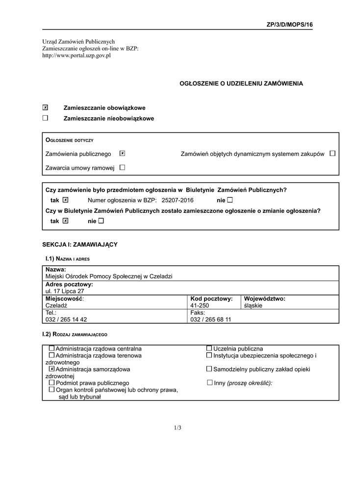 ZP/3/D/MOPS/16 Urząd Zamówień Publicznych Zamieszczanie ogłoszeń on-line w BZP: http://www.portal.uzp.gov.pl OGŁOSZENIE O UDZIELENIU ZAMÓWIENIA Zamieszczanie obowiązkowe ✘ Zamieszczanie nieobowiązkowe OGŁOSZENIE DOTYCZY Zamówienia publicznego Zamówień objętych dynamicznym systemem zakupów ✘ Zawarcia umowy ramowej Czy zamówienie było przedmiotem ogłoszenia w Biuletynie Zamówień Publicznych? tak ✘ Numer ogłoszenia w BZP: 25207-2016 nie Czy w Biuletynie Zamówień Publicznych zostało zamieszczone ogłoszenie o zmianie ogłoszenia? tak ✘ nie SEKCJA I: ZAMAWIAJĄCY I.1) NAZWA I ADRES Nazwa: Miejski Ośrodek Pomocy Społecznej w Czeladzi Adres pocztowy: ul. 17 Lipca 27 Miejscowość: Czeladź Tel.: 032 / 265 14 42 Kod pocztowy: 41-250 Faks: 032 / 265 68 11 Województwo: śląskie I.2) RODZAJ ZAMAWIAJĄCEGO Administracja rządowa centralna Administracja rządowa terenowa zdrowotnego ✘ Administracja samorządowa zdrowotnej Podmiot prawa publicznego Organ kontroli państwowej lub ochrony prawa, sąd lub trybunał 1/3 Uczelnia publiczna Instytucja ubezpieczenia społecznego i Samodzielny publiczny zakład opieki Inny (proszę określić): ZP/3/D/MOPS/16 SEKCJA II: PRZEDMIOT ZAMÓWIENIA II.1) Nazwa nadana zamówieniu przez zamawiającego: Dostawa bonów towarowych dla podopiecznych Miejskiego Ośrodka Pomocy Społecznej w Czeladzi, w okresie od dnia podpisania umowy do 31.12.2016 roku. II.2) Rodzaj zamówienia: Roboty budowlane Dostawy ✘ Usługi II.3) Określenie przedmiotu zamówienia Kod CPV: 30 19 97 50 – 2 - Talony Nominał bonu: 10,00zł; ilość: 23 000 szt; wartość nominalna : 230 000,00zł Przedmiotem zamówienia jest dostawa bonów towarowych dla podopiecznych Miejskiego Ośrodka Pomocy Społecznej w Czeladzi, w okresie od dnia podpisania umowy do 31.12.2016 roku. 1. Podana powyżej ilość i wartość bonów jest maksymalną wartością szacunkową. 2. Zamawiający zastrzega, iż jest możliwe zmniejszenie zamówienia w granicach do 20 % w stosunku do wskazanej wyżej ilości bonów towarowych i z tego tytułu Wykonawcy nie przysługują żadne roszczenia finansowe ani prawne. 3. Bony będą wysyłane przez Wykonawcę przesyłką kurierską sukcesywnie wg zapotrzebowania, najpóźniej do 3 dni roboczych po przekazaniu przez Zamawiającego zamówienia wartościowo – ilościowego. 4. Każdy bon powinien być opatrzony przez Sprzedawcę napisem z którego treści będzie wynikać, że na jego podstawie nie można dokonać zakupu alkoholu i wyrobów tytoniowych lub umożliwi Zamawiającemu opatrzenie bonów pieczęcią o takiej treści. 5. Bony muszą być talonami w formie papierowej, zamawiający nie dopuszcza składania ofert na bony towarowe w formie elektronicznej (np. kart elektronicznych). 6. Realizacja bonów towarowych będzie odbywać się w placówkach handlowych oferujących artykuły : spożywcze, odzież, obuwie, pościel, artykuły gospodarstwa domowego , materialy remontowobudowlane oraz w co najmniej 3 aptekach znajdujących się na terenie miasta Czeladź, 7. Bony winny być ważne co najmniej do 30.06.2017 8. Pod pojęciem bonów towarowych należy rozumieć emitowane i oferowane przez Wykonawcę znaki legitymacyjne na okaziciela podlegające wymianie na towary w rozumieniu przepisów ustawy z dnia 16 kwietnia 1993r. o zwalczaniu nieuczciwej konkurencji (Dz.U. z 2003r. Nr 153, poz. 1503 z późn. zm.). II.4) WSPÓLNY SŁOWNIK ZAMÓWIEŃ (CPV) Słownik główny Główny przedmiot 30 19 97 50 – 2 Dodatkowe przedmioty SEKCJA III: PROCEDURA III.1) TRYB UDZIELENIA ZAMÓWIENIA 2/3 ZP/3/D/MOPS/16 Przetarg nieograniczony Negocjacje bez ogłoszenia ✘ Przetarg ograniczony Zamówienie z wolnej ręki Negocjacje z ogłoszeniem Zapytanie o cenę Dialog konkurencyjny Licytacja elektroniczna III.2) INFORMACJE ADMINISTRACYJNE Zamówienie dotyczy projektu/programu finansowanego ze środków Unii Europejskiej tak wskazać projekt/program: nie ✘ SEKCJA IV: UDZIELENIE ZAMÓWIENIA Część Nr (jeżeli dotyczy):1) Nazwa (jeżeli dotyczy):1) IV.1) DATA UDZIELENIA ZAMÓWIENIA: 06/04/2016 IV.2) LICZBA OTRZYMANYCH OFERT: 2 IV.3) LICZBA ODRZUCONYCH OFERT: 0 IV.4) NAZWA I ADRES WYKONAWCY, KTÓREMU UDZIELONO ZAMÓWIENIA2) Nazwa: Sodexo Benefits and Rewards Services Polska Sp. z o.o. Adres pocztowy: ul. Kłobucka 25 Miejscowość: Kod pocztowy: Warszawa 02-699 Kraj/województwo: mazowieckie IV.5) Szacunkowa wartość zamówienia (bez VAT)3) Wartość: 230 000,00 PLN IV.6) INFORMACJA O CENIE WYBRANEJ OFERTY ORAZ O OFERTACH Z NAJNIŻSZĄ I NAJWYŻSZĄ CENĄ Cena wybranej oferty: 230 000,00 Oferta z najniższą ceną5) 230 000,00 / Oferta z najwyższą ceną5) 230 000,00 Waluta PLN Ogłoszenie o udzieleniu zamówienia zostało opublikowane w Biuletynie Zamówień Publicznych dnia: 26.04.2016r. pod numerem: 104140 - 2016 Dyrektor Miejskiego Ośrodka Pomocy Społecznej w Czeladzi mgr Aneta Jóźwin - Rybska 3/3