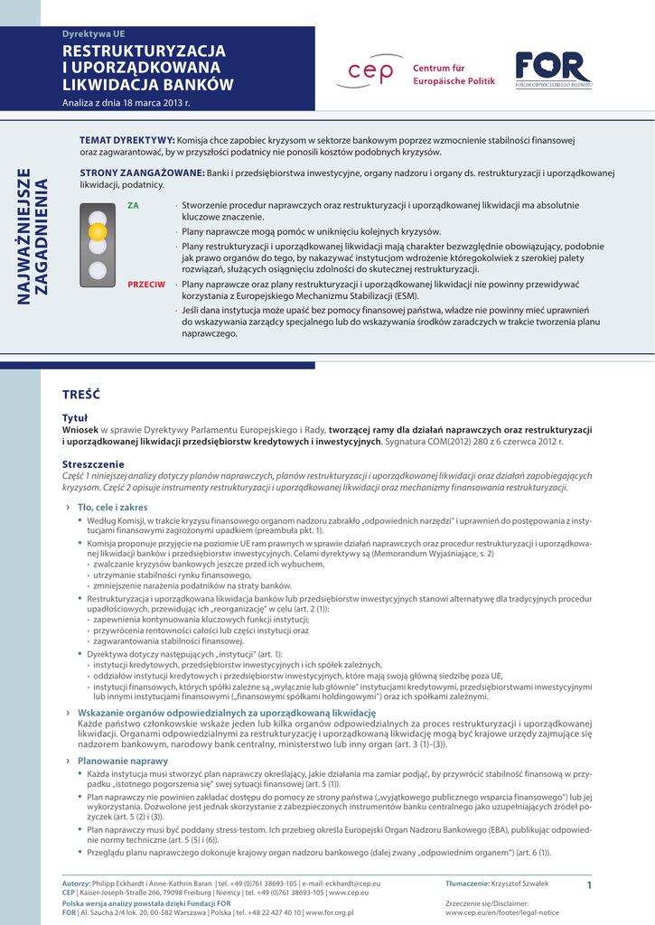 Dyrektywa UE RESTRUKTURYZACJA I UPORZĄDKOWANA LIKWIDACJA BANKÓW Analiza z dnia 18 marca 2013 r. NAJWAŻNIEJSZE ZAGADNIENIA TEMAT DYREKTYWY: Komisja chce zapobiec kryzysom w sektorze bankowym poprzez wzmocnienie stabilności finansowej oraz zagwarantować, by w przyszłości podatnicy nie ponosili kosztów podobnych kryzysów. STRONY ZAANGAŻOWANE: Banki i przedsiębiorstwa inwestycyjne, organy nadzoru i organy ds. restrukturyzacji i uporządkowanej likwidacji, podatnicy. ZA ∙ Stworzenie procedur naprawczych oraz restrukturyzacji i uporządkowanej likwidacji ma absolutnie kluczowe znaczenie. ∙ Plany restrukturyzacji i uporządkowanej likwidacji mają charakter bezwzględnie obowiązujący, podobnie jak prawo organów do tego, by nakazywać instytucjom wdrożenie któregokolwiek z szerokiej palety rozwiązań, służących osiągnięciu zdolności do skutecznej restrukturyzacji. PRZECIW ∙ Plany naprawcze oraz plany restrukturyzacji i uporządkowanej likwidacji nie powinny przewidywać korzystania z Europejskiego Mechanizmu Stabilizacji (ESM). ∙ Plany naprawcze mogą pomóc w uniknięciu kolejnych kryzysów. ∙ Jeśli dana instytucja może upaść bez pomocy finansowej państwa, władze nie powinny mieć uprawnień do wskazywania zarządcy specjalnego lub do wskazywania środków zaradczych w trakcie tworzenia planu naprawczego. TREŚĆ Tytuł Wniosek w sprawie Dyrektywy Parlamentu Europejskiego i Rady, tworzącej ramy dla działań naprawczych oraz restrukturyzacji i uporządkowanej likwidacji przedsiębiorstw kredytowych i inwestycyjnych. Sygnatura COM(2012) 280 z 6 czerwca 2012 r. Streszczenie Część 1 niniejszej analizy dotyczy planów naprawczych, planów restrukturyzacji i uporządkowanej likwidacji oraz działań zapobiegających kryzysom. Część 2 opisuje instrumenty restrukturyzacji i uporządkowanej likwidacji oraz mechanizmy finansowania restrukturyzacji. ›› Tło, cele i zakres • Według Komisji, w trakcie kryzysu finansowego organom nadzoru zabrakło „odpowiednich narzędzi” i uprawnień do postępowania z instytucjami finansowymi zagrożonymi upadkiem (preambuła pkt. 1). • Komisja proponuje przyjęcie na poziomie UE ram prawnych w sprawie działań naprawczych oraz procedur restrukturyzacji i uporządkowa- • • nej likwidacji banków i przedsiębiorstw inwestycyjnych. Celami dyrektywy są (Memorandum Wyjaśniające, s. 2) • zwalczanie kryzysów bankowych jeszcze przed ich wybuchem, • utrzymanie stabilności rynku finansowego, • zmniejszenie narażenia podatników na straty banków. Restrukturyzacja i uporządkowana likwidacja banków lub przedsiębiorstw inwestycyjnych stanowi alternatywę dla tradycyjnych procedur upadłościowych, przewidując ich „reorganizację” w celu (art. 2 (1)): • zapewnienia kontynuowania kluczowych funkcji instytucji; • przywrócenia rentowności całości lub części instytucji oraz • zagwarantowania stabilności finansowej. Dyrektywa dotyczy następujących „instytucji” (art. 1): • instytucji kredytowych, przedsiębiorstw inwestycyjnych i ich spółek zależnych, • oddziałów instytucji kredytowych i przedsiębiorstw inwestycyjnych, które mają swoją główną siedzibę poza UE, • instytucji finansowych, których spółki zależne są „wyłącznie lub głównie” instytucjami kredytowymi, przedsiębiorstwami inwestycyjnymi lub innymi instytucjami finansowymi („finansowymi spółkami holdingowymi”) oraz ich spółkami zależnymi. ›› Wskazanie organów odpowiedzialnych za uporządkowaną likwidację Każde państwo członkowskie wskaże jeden lub kilka organów odpowiedzialnych za proces restrukturyzacji i uporządkowanej likwidacji. Organami odpowiedzialnymi za restrukturyzację i uporządkowaną likwidację mogą być krajowe urzędy zajmujące się nadzorem bankowym, narodowy bank centralny, ministerstwo lub inny organ (art. 3 (1)-(3)). ›› Planowanie naprawy • Każda instytucja musi stworzyć plan naprawczy określający, jakie działania ma zamiar podjąć, by przywrócić stabilność finansową w przypadku „istotnego pogorszenia się” swej sytuacji finansowej (art. 5 (1)). • Plan naprawczy nie powinien zakładać dostępu do pomocy ze strony państwa („wyjątkowego publicznego wsparcia finansowego”) lub jej • • wykorzystania. Dozwolone jest jednak skorzystanie z zabezpieczonych instrumentów banku centralnego jako uzupełniających źródeł pożyczek (art. 5 (2) i (3)). Plan naprawczy musi być poddany stress-testom. Ich przebieg określa Europejski Organ Nadzoru Bankowego (EBA), publikując odpowiednie normy techniczne (art. 5 (5) i (6)). Przeglądu planu naprawczego dokonuje krajowy organ nadzoru bankowego (dalej zwany „odpowiednim organem”) (art. 6 (1)). Autorzy: Philipp Eckhardt i Anne-Kathrin Baran | tel. +49 (0)761 38693-105 | e-mail: [email protected] CEP | Kaiser-Joseph-Straße 266, 79098 Freiburg | Niemcy | tel. +49 (0)761 38693-105 | www.cep.eu Polska wersja analizy powstała dzięki Fundacji FOR FOR | Al. Szucha 2/4 lok. 20, 00-582 Warszawa | Polska | tel. +48 22 427 40 10 | www.for.org.pl Tłumaczenie: Krzysztof Szwałek Zrzeczenie się/Disclaimer: www.cep.eu/en/footer/legal-notice 1 Dyrektywa UE RESTRUKTURYZACJA I UPORZĄDKOWANA LIKWIDACJA BANKÓW Analiza z dnia 18 marca 2013 r. • Jeśli odpowiedni organ uzna, że plan naprawczy jest niepełny, dana instytucja musi go poprawić w ciągu trzech miesięcy (art. 6 (3)). Jeśli po tym terminie odpowiedni organ wciąż będzie uważał, że plan jest niepełny, może wezwać daną instytucję do podjęcia następujących działań (art. 6 (4)): • dostosowania się do wyższych wymogów w zakresie kapitałów, • obniżenia profilu ryzyka, • wprowadzenia zmian w strategii przedsiębiorstwa. ›› Planowanie restrukturyzacji i uporządkowanej likwidacji • Organ ds. restrukturyzacji i uporządkowanej likwidacji powinien, w porozumieniu z odpowiednim organem opracować plan restruktu•