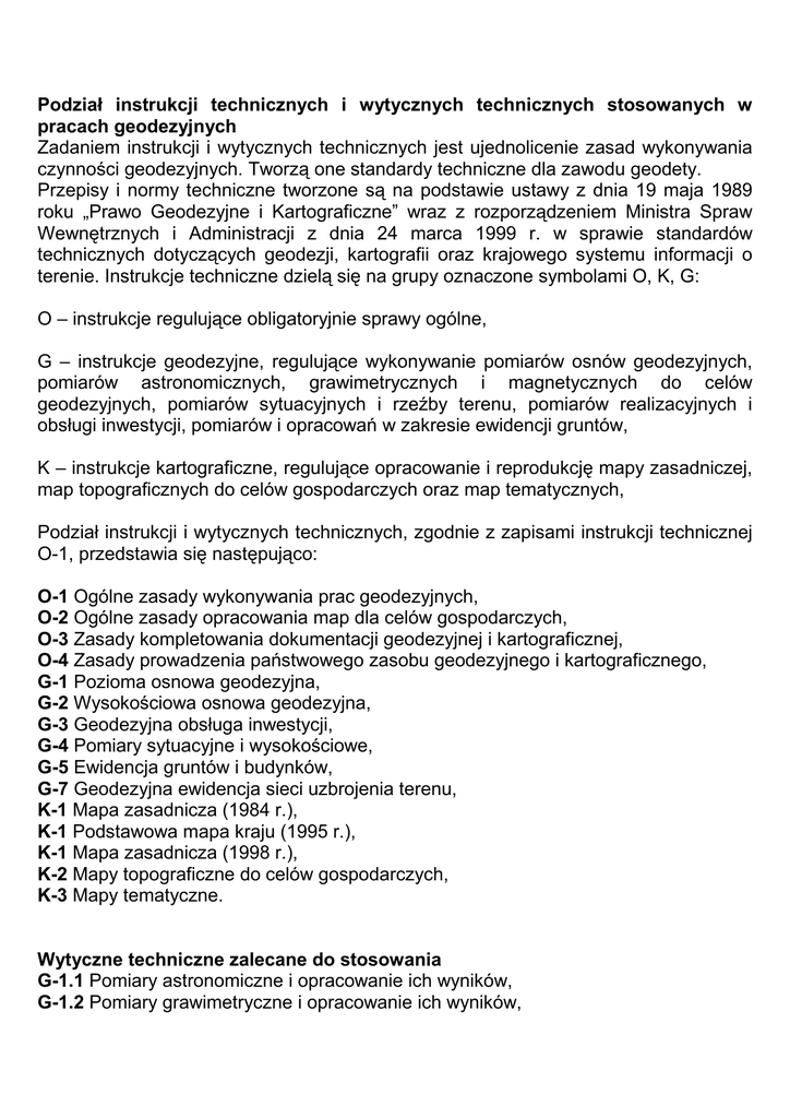 Podział instrukcji technicznych i wytycznych technicznych stosowanych w pracach geodezyjnych Zadaniem instrukcji i wytycznych technicznych jest ujednolicenie zasad wykonywania czynności geodezyjnych. Tworzą one standardy techniczne dla zawodu geodety. Przepisy i normy techniczne tworzone są na podstawie ustawy z dnia 19 maja 1989 roku „Prawo Geodezyjne i Kartograficzne” wraz z rozporządzeniem Ministra Spraw Wewnętrznych i Administracji z dnia 24 marca 1999 r. w sprawie standardów technicznych dotyczących geodezji, kartografii oraz krajowego systemu informacji o terenie. Instrukcje techniczne dzielą się na grupy oznaczone symbolami O, K, G: O – instrukcje regulujące obligatoryjnie sprawy ogólne, G – instrukcje geodezyjne, regulujące wykonywanie pomiarów osnów geodezyjnych, pomiarów astronomicznych, grawimetrycznych i magnetycznych do celów geodezyjnych, pomiarów sytuacyjnych i rzeźby terenu, pomiarów realizacyjnych i obsługi inwestycji, pomiarów i opracowań w zakresie ewidencji gruntów, K – instrukcje kartograficzne, regulujące opracowanie i reprodukcję mapy zasadniczej, map topograficznych do celów gospodarczych oraz map tematycznych, Podział instrukcji i wytycznych technicznych, zgodnie z zapisami instrukcji technicznej O-1, przedstawia się następująco: O-1 Ogólne zasady wykonywania prac geodezyjnych, O-2 Ogólne zasady opracowania map dla celów gospodarczych, O-3 Zasady kompletowania dokumentacji geodezyjnej i kartograficznej, O-4 Zasady prowadzenia państwowego zasobu geodezyjnego i kartograficznego, G-1 Pozioma osnowa geodezyjna, G-2 Wysokościowa osnowa geodezyjna, G-3 Geodezyjna obsługa inwestycji, G-4 Pomiary sytuacyjne i wysokościowe, G-5 Ewidencja gruntów i budynków, G-7 Geodezyjna ewidencja sieci uzbrojenia terenu, K-1 Mapa zasadnicza (1984 r.), K-1 Podstawowa mapa kraju (1995 r.), K-1 Mapa zasadnicza (1998 r.), K-2 Mapy topograficzne do celów gospodarczych, K-3 Mapy tematyczne. Wytyczne techniczne zalecane do stosowania G-1.1 Pomiary astronomiczne i opracowanie ich wyników, G-1.2 Pomiary grawimetryczne i opracowanie ich wyników, G-1.3 Pomiary pola magnetycznego Ziemi i opracowanie ich wyników, G-1.4 Budowle triangulacyjne, G-1.5 Szczegółowa osnowa pozioma. Projektowanie, pomiar i opracowanie wyników, G-1.6 Przeglądy i konserwacje punktów geodezyjnych, grawimetrycznych i magnetycznych, G-1.7 Centralne banki osnów geodezyjnych, grawimetrycznych i magnetycznych, G-1.8 Aerotriangulacja analityczna, G-1.9 Katalog znaków geodezyjnych oraz zasady stabilizacji punktów, G-1.10 Formuły odwzorowawcze i parametry układów współrzędnych, G-2.1 Podstawowa osnowa wysokościowa. Projektowanie, pomiar i opracowanie wyników, G-2.2 Szczegółowa osnowa wysokościowa. Projektowanie, pomiar i opracowanie wyników, G-3.1 Osnowy realizacyjne, G-3.2 Pomiary realizacyjne, G-3.4 Inwentaryzacja zespołów urbanistycznych, zespołów zieleni i obiektów architektury, G-4.1 Sieci modularne, G-4.2 Uczytelnianie fotogrametrycznych zdjęć lotniczych i pomiary uzupełniające dla mapy zasadniczej, G-4.3 Bezpośrednie pomiary wysokościowe, G-4.4 Prace geodezyjne związane z podziemnym uzbrojeniem terenu, G-5.4 Opracowanie dokumentacji wyjściowej do odnowienia ewidencji gruntów z zastosowaniem technologii fotogrametrycznych, Standard wymiany informacji geodezyjnej – SWING, K-1.1 Metryka mapy zasadniczej, K-1.1 Podział treści podstawowej mapy kraju, K-1.2 Mapa zasadnicza. Aktualizacja i modernizacja, K-1.3 Mapa zasadnicza. Opracowanie pierworysu z pomiarów bezpośrednich, K-1.4 Mapa zasadnicza. Opracowanie pierworysu rzeźby terenu z istniejących materiałów kartograficznych, K-1.5 Mapa zasadnicza. Opracowanie pierworysu autogrametrycznego sytuacji i rzeźby terenu, K-1.6 Mapa zasadnicza. Opracowanie pierworysu na podkładzie fotomapy lub ortofotomapy, K-1.7 Mapa zasadnicza w wersji rozwarstwionej. Metody sporządzania i zasady reprodukcji, K-1.9 Sporządzanie pierworysu mapy. Materiały kartograficzne, sprzęt kreślarski, tusze, technika rysowania, K-1.10 Podział treści podstawowej mapy kraju, K-1/K-3.10 Reprodukcja kartograficzna małonakładowa. Metody i technologie, K-2.1 Mapy topograficzne. Opracowanie pierworysów i aktualizacja map w skalach 1:5000 i 1:10 000, K-2.2 Mapy topograficzne. Opracowanie czystorysów map w skalach 1:5000 i 1:10 000. K-2.3 Sporządzanie map fotograficznych, K-2.4 Metryka mapy topograficznej (1:5000, 1:10 000), K-2.5 Metryka mapy topograficznej (1:25 000, 1:50 000), K-2.6 Metryka mapy topograficznej (1:100 000, 1:200 000, 1:500 000), K-2.7 Zasady wykonywania prac fotolotniczych, K-3.1 Mapy społeczno-gospodarcze w skalach 1:5000, 1:10 000 i 1:25 000, K-3.2 Sporządzanie map inŜynieryjno-gospodarczych zakładów przemysłowych metodą stereofotogrametryczną, K-3.3 Mapa przeglądowa uzbrojenia terenu, K-3.4 System Informacji o Terenie. Mapa Hydrograficzna Polski skala 1:50 000,w formie analogowej i numerycznej, K-3.6 System Informacji o Terenie. Mapa Sozologiczna Polski skala 1:50 000, w formie analogowej i numerycznej.