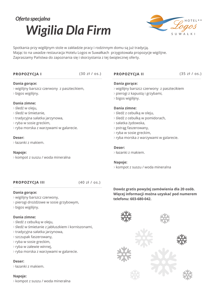 Oferta specjalna HOTEL** Wigilia Dla Firm S U W A Ł K I Spotkania przy wigilijnym stole w zakładzie pracy i rodzinnym domu są już tradycją. Mając to na uwadze restauracja Hotelu Logos w Suwałkach przygotowała propozycje wigilijne. Zapraszamy Państwa do zapoznania się i skorzystania z tej świątecznej oferty. (30 zł / os.) PROPOZYCJA I Dania gorące: ∠ wigilijny barszcz czerwony z pasztecikiem, ∠ bigos wigilijny. Dania zimne: ∠ śledź w oleju, ∠ śledź w śmietanie, ∠ tradycyjna sałatka jarzynowa, ∠ ryba w sosie greckim, ∠ ryba morska z warzywami w galarecie. PROPOZYCJA II (35 zł / os.) Dania gorące: ∠ wigilijny barszcz czerwony z pasztecikiem ∠ pierogi z kapustą i grzybami, ∠ bigos wigilijny. Dania zimne: ∠ śledź z cebulką w oleju, ∠ śledź z cebulką w pomidorach, ∠ sałatka żydowska, ∠ pstrąg faszerowany, ∠ ryba w sosie greckim, ∠ ryba morska z warzywami w galarecie. Deser: ∠ łazanki z makiem. Deser: ∠ łazanki z makiem. Napoje: ∠ kompot z suszu / woda mineralna Napoje: ∠ kompot z suszu / woda mineralna PROPOZYCJA III (40 zł / os.) Dania gorące: ∠ wigilijny barszcz czerwony, ∠ pierogi drożdżowe w sosie grzybowym, ∠ bigos wigilijny. Dania zimne: ∠ śledź z cebulką w oleju, ∠ śledź w śmietanie z jabłuszkiem i korniszonami, ∠ tradycyjna sałatka jarzynowa, ∠ szczupak faszerowany, ∠ ryba w sosie greckim, ∠ ryba w zalewie winnej, ∠ ryba morska z warzywami w galarecie. Deser: ∠ łazanki z makiem. Napoje: ∠ kompot z suszu / woda mineralna Dowóz gratis powyżej zamówienia dla 20 osób. Więcej informacji można uzyskać pod numerem telefonu: 603-680-042.