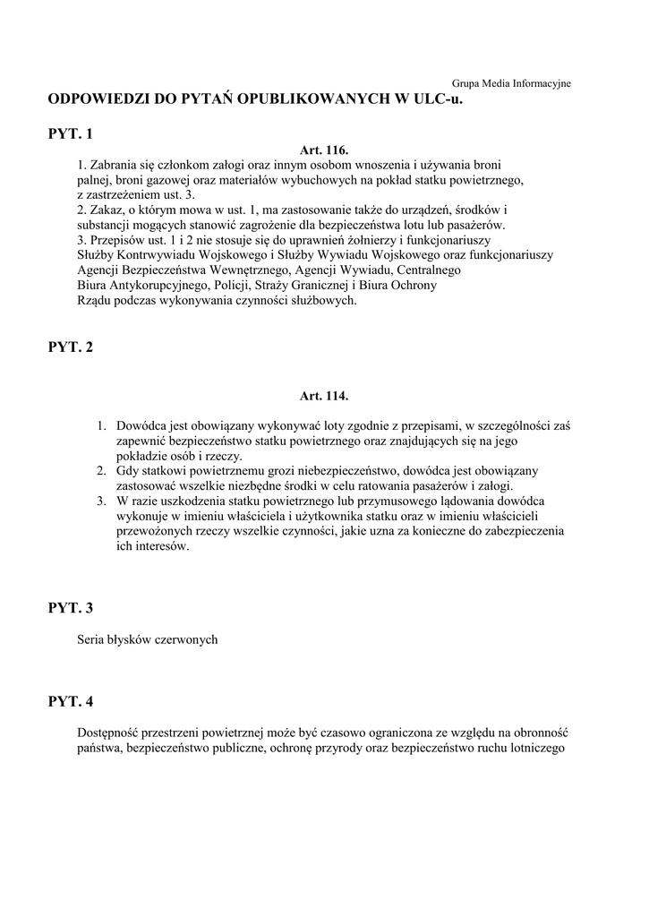 Grupa Media Informacyjne ODPOWIEDZI DO PYTAŃ OPUBLIKOWANYCH W ULC-u. PYT. 1 Art. 116. 1. Zabrania się członkom załogi oraz innym osobom wnoszenia i używania broni palnej, broni gazowej oraz materiałów wybuchowych na pokład statku powietrznego, z zastrzeżeniem ust. 3. 2. Zakaz, o którym mowa w ust. 1, ma zastosowanie także do urządzeń, środków i substancji mogących stanowić zagrożenie dla bezpieczeństwa lotu lub pasażerów. 3. Przepisów ust. 1 i 2 nie stosuje się do uprawnień żołnierzy i funkcjonariuszy Służby Kontrwywiadu Wojskowego i Służby Wywiadu Wojskowego oraz funkcjonariuszy Agencji Bezpieczeństwa Wewnętrznego, Agencji Wywiadu, Centralnego Biura Antykorupcyjnego, Policji, Straży Granicznej i Biura Ochrony Rządu podczas wykonywania czynności służbowych. PYT. 2 Art. 114. 1. Dowódca jest obowiązany wykonywać loty zgodnie z przepisami, w szczególności zaś zapewnić bezpieczeństwo statku powietrznego oraz znajdujących się na jego pokładzie osób i rzeczy. 2. Gdy statkowi powietrznemu grozi niebezpieczeństwo, dowódca jest obowiązany zastosować wszelkie niezbędne środki w celu ratowania pasażerów i załogi. 3. W razie uszkodzenia statku powietrznego lub przymusowego lądowania dowódca wykonuje w imieniu właściciela i użytkownika statku oraz w imieniu właścicieli przewożonych rzeczy wszelkie czynności, jakie uzna za konieczne do zabezpieczenia ich interesów. PYT. 3 Seria błysków czerwonych PYT. 4 Dostępność przestrzeni powietrznej może być czasowo ograniczona ze względu na obronność państwa, bezpieczeństwo publiczne, ochronę przyrody oraz bezpieczeństwo ruchu lotniczego PYT. 5 i 6 Art. 117. 1. Dowódca statku powietrznego, który otrzymał sygnał o niebezpieczeństwie grożącym innemu statkowi powietrznemu lub statkowi morskiemu, spostrzegł statek powietrzny lub morski, który uległ wypadkowi lub znalazł się w niebezpieczeństwie, albo zauważył inną katastrofę lub klęskę żywiołową bądź zauważył osobę znajdującą się na morzu w niebezpieczeństwie utraty życia, obowiązany jest udzielić poszkodowanym lub znajdującym się w niebezpieczeństwie pomocy w zakresie, w jakim może to uczynić bez narażenia na niebezpieczeństwo powierzonego mu statku powietrznego, pasażerów, załogi lub innych osób. 2. Obowiązek pomocy ustaje, gdy dowódca wie, że kto inny udziela pomocy w podobnych lub lepszych warunkach, niż on sam mógłby jej udzielić. PYT. 7 1. Minister właściwy do spraw transportu w porozumieniu z Ministrem Obrony Narodowej, ministrami właściwymi do spraw wewnętrznych oraz środowiska, w drodze rozporządzeń, z zachowaniem postanowień umów międzynarodowych: 1. może wprowadzić zakazy lub ograniczenia lotów nad obszarem całego państwa albo jego części na czas dłuższy niż 3 miesiące, 2. określi zasady wprowadzania przez państwowy organ zarządzania ruchem lotniczym ograniczeń lotów w części przestrzeni powietrznej, których czas trwania nie będzie dłuższy niż 3 miesiące, oraz sposób publikacji tych ograniczeń. 1. W celu zapewnienia bezpieczeństwa lotu oraz bezpieczeństwa i porządku na pokładzie statku powietrznego dowódca jest upoważniony do: 1. zobowiązania, w razie konieczności, innych członków załogi do wykonywania czynności nienależących do ich normalnego zakresu obowiązków, 2. wydawania poleceń wszystkim osobom znajdującym się na pokładzie statku powietrznego. PYT. 8 PYT. 9 ROZPORZĄDZENIE MINISTRA INFRASTRUKTURY1) z dnia 18 grudnia 2003 r. w sprawie zrzutów ze statku powietrznego (Dz. U. z dnia 31 grudnia 2003 r.) Na podstawie art. 123 ust. 3 ustawy z dnia 3 lipca 2002 r. - Prawo lotnicze (Dz. U. Nr 130, poz. 1112 oraz z 2003 r. Nr 210, poz. 2036) zarządza się, co następuje: § 1. Rozporządzenie określa szczegółowe warunki dokonywania zrzutów ze statku powietrznego. § 2. 1. Dopuszcza się dokonywanie następujących zrzutów ze statku powietrznego w czasie jego lotu: 1) balastu w postaci wody lub przesianego piasku; 2) paliwa ze zbiorników statku powietrznego - w ramach przeprowadzanych prób w locie; 3) urządzeń i środków niezbędnych do akcji ratowniczej; 4) urządzeń i środków ratowniczych - w ramach przeprowadzanych prób w locie; 5) wody i innych środków gaśniczych podczas prowadzenia akcji gaśniczej lub patrolowania przeciwpożarowego; 6) holowanych przedmiotów, w szczególności lin holowniczych, transparentów i flag - w strefach wyznaczonych przez organizatora lotów; 7) substancji lub przedmiotów niezbędnych do przeprowadzania prac agrolotniczych, w szczególności środków chemicznych, nawozów i ziarna siewnego; 8) ulotek, przedmiotów podwieszonych na spadochronach i meldunków ciężarkowych; 9) urządzeń, uzbrojenia i ładunków - jeżeli jest to niezbędne dla potrzeb sił zbrojnych; 10) innych substancji i przedmiotów, których zrzut jest uzasadniony potrzebą gospodarczą lub potrzebą uatrakcyjnienia pokazów i imprez masowych; 11) wszelkich substancji i przedmiotów - w sytuacjach awaryjnych, w szczególności dla uniknięcia wypadku lotniczego, wykonania przymusowego lądowania lub w celu utrzymania bezpiecznej wysokości lotu. 2. Zrzuty, o których mowa w ust. 1 pkt 1, 2, 4, 8 i 10, powinny być wykonane zgodnie z warunkami określonymi przez państwowy organ zarządzania ruchem lotniczym. § 3. Zrzuty, o których mowa w § 2 ust. 1, mogą być wykonywane w następujących przypadkach: 1) gdy nie naruszają bezpieczeństwa statku powietrznego, z którego dokonuje się zrzutu, innych statków powietrznych znajdujących się w locie oraz ludzi i mienia na powierzchni ziemi lub wody; 2) powiadomienia, przed rozpoczęciem lotu, państwowego organu zarządzania ruchem lotniczym o zamiarze wykonania zrzutu - w przypadku zrzutów, o których mowa w § 2 ust. 1 pkt 3, 5-7, 9 i 10. § 4. Traci moc zarządzenie Ministra Transportu i Gospodarki Morskiej z dnia 3 kwietnia 1990 r. w sprawie 