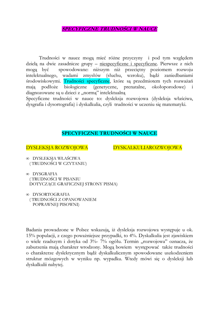SPECYFICZNE TRUDNOŚCI W NAUCE Trudności w nauce mogą mieć różne przyczyny i pod tym względem dzielą na dwie zasadnicze grupy – niespecyficzne i specyficzne. Pierwsze z nich mogą być spowodowane: niższym niż przeciętny poziomem rozwoju intelektualnego, wadami zmysłów (słuchu, wzroku), bądź zaniedbaniami środowiskowymi. Trudności specyficzne, które są przedmiotem tych rozważań mają podłoże biologiczne (genetyczne, prenatalne, okołoporodowe) i diagnozowane są u dzieci z „normą” intelektualną Specyficzne trudności w nauce to: dysleksja rozwojowa (dysleksja właściwa, dysgrafia i dysortografia) i dyskalkulia, czyli trudności w uczeniu się matematyki. SPECYFICZNE TRUDNOŚCI W NAUCE DYSLEKSJA ROZWOJOWA DYSKALKULIAROZWOJOWA • DYSLEKSJA WŁAŚCIWA ( TRUDNOŚCI W CZYTANIU) • DYSGRAFIA ( TRUDNOŚCI W PISANIU DOTYCZĄCE GRAFICZNEJ STRONY PISMA) • DYSORTOGRAFIA ( TRUDNOŚCI Z OPANOWANIEM POPRAWNEJ PISOWNI) Badania prowadzone w Polsce wskazują, iż dysleksja rozwojowa występuje u ok. 15% populacji, z czego poważniejsze przypadki, to 4%. Dyskalkulia jest zjawiskiem o wiele rzadszym i dotyka od 3%- 7% ogółu. Termin „rozwojowa” oznacza, że zaburzenia mają charakter wrodzony. Mogą bowiem występować także trudności o charakterze dyslektycznym bądź dyskalkulicznym spowodowane uszkodzeniem struktur mózgowych w wyniku np. wypadku. Wtedy mówi się o dysleksji lub dyskalkulii nabytej. DYSLEKSJA ROZWOJOWA Bezpośrednią przyczyną trudności o charakterze dyslektycznym jest nieharmonijny rozwój psychomotoryczny dziecka tzn. niektóre funkcje rozwijają się dobrze lub bardzo dobrze, a inne z wyjątkowym opóźnieniem (głównie te, które biorą udział w czytaniu i pisaniu oraz ich współdziałania). Na naukę czytania i pisania mają wpływ funkcje: słuchowo- językowe, wzrokowe, motoryka rąk, lateralizacja, orientacja przestrzenna, koordynacja wzrokoworuchowa. 1. Przejawy zaburzeń funkcji słuchowych: • mylenie głosek podobnych brzmieniowo np. z – s, d-t, p-b, w-f • trudności z dokonywaniem analizy głoskowej i sylabowej, • trudności z przypomnieniem sobie właściwego słowa. 2. Przejawy zaburzeń funkcji wzrokowych • mylenie liter o podobnych kształtach np. b-d, t-l-ł, • opuszczanie liter lub całych wyrazów w czasie przepisywania lub czytania • trudności z utrwaleniem poprawnej pisowni wyrazów z trudnościami ortograficznymi. 3. Przejawy zaburzeń funkcji ruchowych: • wolne tempo pisania, • niski poziom graficzny pisma ( pismo niekształtne, nie mieszczące się w liniaturze, różna wielkość liter, pismo nieczytelne) • męczliwość podczas pisania,. 4. Przejawy zakłóceń lateralizacji • lateralizacja skrzyżowana ( np. praworęczność i lewooczność) • oburęczność. 5. Przejawy zaburzeń orientacji przestrzennej: • trudności z rozpoznawaniem kierunków w przestrzeni i orientacji prawo- lewo, dół – góra, • mylenie liter o podobnych kształtach lecz inaczej położonych w przestrzeni np. b-p, g-d, • pismo lustrzane. Zaburzenia różnych funkcji, które powodują specyficzne trudności o charakterze dysleksji rozwojowej rzutują na naukę wielu przedmiotów. Stwierdzono też, że objawy dysleksji zmieniają się wraz z wiekiem. Problemy młodzieży w wieku gimnazjalnym pojawiające się na poszczególnych przedmiotach. 1. Język polski Dyslektycy zwykle mają wolne tempo czytania oraz trudności ze zrozumieniem czytanego tekstu. Ponieważ czytanie nie sprawia przyjemności pojawia się niechęć do czytania długich tekstów i grubych książek. Czytanie lektur stanowi poważny problem. Pomimo znajomości zasad pisowni dziecko nadal popełnia liczne błędy ortograficzne i gramatyczne. Ma też problemy z korzystaniem ze słownika, bo nie może nauczyć się kolejności liter w alfabecie. Kolejna trudność to organizacja tekstu na stronie, co jest dosyć istotne przy pisaniu wypracowań i robieniu notatek.. Notatki trzeba robić coraz szybciej i w większej ilości, zatem pismo staje się coraz brzydsze i mniej czytelne. 2. Języki obce (j. angielski) W trakcie nauki języka angielskiego dyslektyk może napotkać wiele specyficznych trudności. Kłopot może mu sprawiać różnicowanie głosek zbliżonych fonetycznie, wypowiadanie głosek nieistniejących w języku polskim (the), różnicowanie wyrazów podobnie brzmiących, powtarzanie dłuższych i trudniejszych wyrazów. Czytanie jest jeszcze trudniejsze niż po polsku, ponieważ w j. angielskim istnieje wiele wyrazów, w których takim samym literom odpowiadają różne głoski („ch”: chalk Christmas). Odczytywanie transkrypcji fonetycznej ze słownika jest prawie niemożliwe. Kolejną trudność stanowi prawidłowe stosowanie przyimków. Dziecku, które generalnie ma problemy z orientacją w czasie, bardzo trudno jest zrozumieć różnice między czasami gramatycznymi w j. angielskim, zwłaszcza gdy nie ma jednoznacznego odpowiednika danego czasu w języku polskim (np. Present Perfekt). 3. Matematyka Mogą wystąpić trudności spowodowane myleniem kolejności cyfr, liczb i znaków oraz indeksów górnych i dolnych ( w ułamkach zwykłych). Dyslektycy gubią się w dłuższych działaniach opuszczając całe ich fragmenty, co powoduje uzyskanie innego wyniku. Często pojawiają się problemy ze zrozumieniem treści zadań tekstowych, a także zapisem kolejnych kroków rozwiązania. Bardzo często występują kłopoty z opanowaniem rachunku pamięciowego, w tym tabliczki mnożenia. 4. Geografia. Występują trudności z czytaniem i rysowaniem map, z określeniem stron świata i położenia różnych miejsc geograficznych względem siebie. Problemem jest też obliczanie stref czasowych i obliczanie kąta padania słońca. Dziecku trudno jest zapamiętać nazwy geograficzne, które są dla niego pustymi dźwiękami i z niczym mu się nie kojarzą. 5. Biologia Głównym problemem są trudności z zapamiętaniem długich i skomplik
