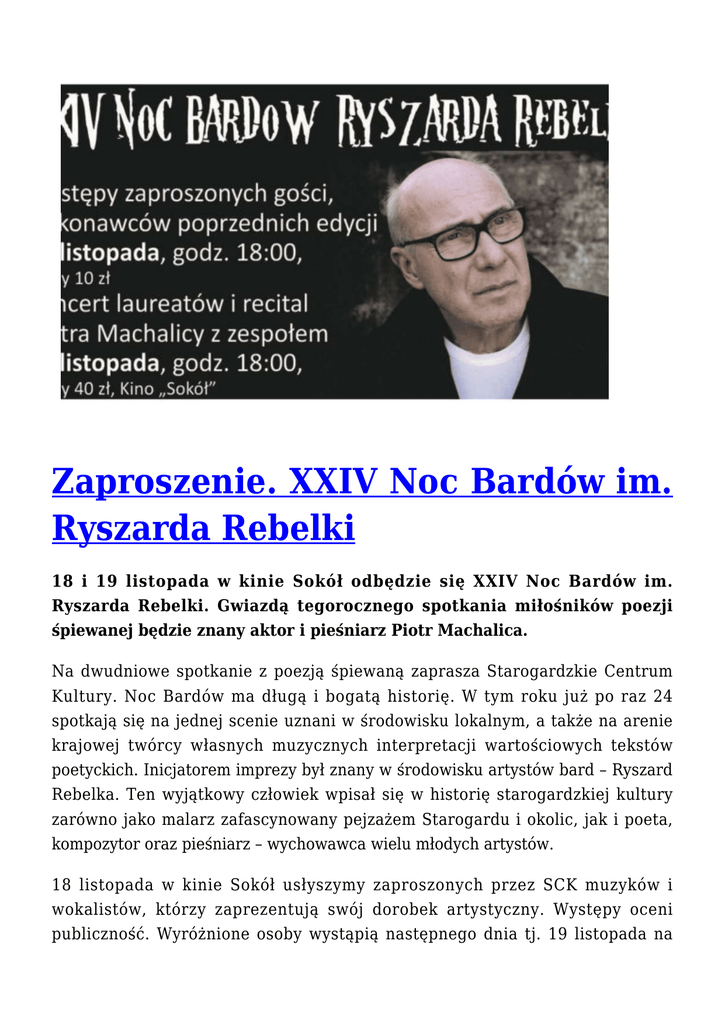 Zaproszenie. XXIV Noc Bardów im. Ryszarda Rebelki 18 i 19 listopada w kinie Sokół odbędzie się XXIV Noc Bardów im. Ryszarda Rebelki. Gwiazdą tegorocznego spotkania miłośników poezji śpiewanej będzie znany aktor i pieśniarz Piotr Machalica. Na dwudniowe spotkanie z poezją śpiewaną zaprasza Starogardzkie Centrum Kultury. Noc Bardów ma długą i bogatą historię. W tym roku już po raz 24 spotkają się na jednej scenie uznani w środowisku lokalnym, a także na arenie krajowej twórcy własnych muzycznych interpretacji wartościowych tekstów poetyckich. Inicjatorem imprezy był znany w środowisku artystów bard – Ryszard Rebelka. Ten wyjątkowy człowiek wpisał się w historię starogardzkiej kultury zarówno jako malarz zafascynowany pejzażem Starogardu i okolic, jak i poeta, kompozytor oraz pieśniarz – wychowawca wielu młodych artystów. 18 listopada w kinie Sokół usłyszymy zaproszonych przez SCK muzyków i wokalistów, którzy zaprezentują swój dorobek artystyczny. Występy oceni publiczność. Wyróżnione osoby wystąpią następnego dnia tj. 19 listopada na koncercie galowym, którego gwiazdą w tym roku będzie popularny i ceniony aktor teatralny oraz filmowy Piotr Machalica. Mówi się o nim „lew sceniczny”. Aktor znany jest szerokiej publiczności nie tylko ze swych wybitnych ról, ale także jako wokalista wykonujący piosenkę poetycką. „Piaskownica” to tytuł najnowszej płyty artysty, na której Machalica swoim porywającym głosem udowadnia, że poezja śpiewana ma się wciąż doskonale. Wszystkie teksty napisał specjalnie dla artysty Jan Wołek – znakomity poeta i satyryk. Na płycie znajdują się kompozycje Jerzego Satanowskiego, Janusza Grzywacza, Janusza Strobla, Wojciecha Borkowskiego, Michała Walczaka, Krzysztofa Niedźwieckiego. Wzorem ubiegłego roku, wszystkie prezentacje pierwszego dnia zostaną zarejestrowane i zapisane na kolejnej pamiątkowej płycie CD. Program imprezy: 18 listopada 2016 r. (piątek), godz. 18:00 – występy zaproszonych gości, wykonawców poprzednich edycji – bilety 10 zł. 19 listopada 2016 r. (sobota), godz. 18:00 – koncert laureatów i recital Piotra Machalicy z zespołem – bilety 40 zł. Bilety do nabycia w recepcji SCK i kasie kina „Sokół”. Serdecznie zapraszamy !