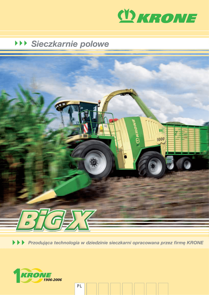 Sieczkarnie polowe Przodująca technologia w dziedzinie sieczkarni opracowana przez firmę KRONE PL Krone – od 100 lat na fali sukcesów Kompetentna 100 Jahre Innovation Nowatorska Już od 100 lat nazwa KRONE ma swoje stałe miejsce w technice rolniczej. Zaczynając od małej kuźni, KRONE rozwinęła się do wielkości czołowego zakładu w dziedzinie zbioru pasz. Właściwa kompozycja nowatorstwa, bliskich kontaktów z Blisko klientów klientami i kompetencji zapewnia utrzymujący się od dawna sukces tego przedsiębiorstwa. Liczne, wyróżniające je cechy potwierdzają w pełni filozofię przedsiębiorstwa, zorientowaną na jakość i klienta. Na początku jest rozmowa. Pracownicy firmy KRONE pozostają w bliskim kontakcie z klientami i partnerami dystrybucyjnymi. Wspólnie analizują rynki, tendencje i wymagania maszyn. 2 Nowe maszyny powstają przy wykorzystaniu najnowocześniejszej techniki komputerowej. Dzięki nowatorskim programom konstrukcyjnym można symulować pracę maszyn na ekranie. Umożliwia to ciągłą optymalizację maszyn już w fazie konstrukcji. Teraz wybija godzina testów prototypów. Doświadczeni fachowcy testują wszystkie maszyny w ścisłej współpracy z konstruktorami firmy KRONE, zanim zostanie wyprodukowana pierwsza seria zerowa. ••• Rozpoznanie w odpowiednim czasie zarysowujących się tendencji, utrzymywanie bliskich kontaktów z klientami i wytyczanie kierunków rozwoju rynku, to cechy charakteryzujące KRONE. Np. sieczkarnie polowe: tutaj KRONE przeanalizowała rynek i następnie w krótkim czasie zdecydowała się wprowadzić na rynek sieczkarnie o całkowicie nowej koncepcji. Dzisiaj BiG X potwierdza w trudnych warunkach eksploatacyjnych, że KRONE nie tylko rozpoznała we właściwym momencie pojawiającą się tendencję, ale także dowiodła, że prawdziwe innowacje wciąż jeszcze rodzą się w przedsiębiorstwach średniej wielkości. Nie można przy tym pominąć licznych, innowacyjnych szczegółów technicznych, jak pierwszy, nie sterowany podbieracz dla maszyn zbierających, 6 hydraulicznie napędzanych walców wstępnego prasowania, „liniowy” przepływ strumienia paszy. Są to nowatorskie rozwiązanie, zawsze opracowywane w aspekcie możliwie największych korzyści dla klienta gdyż w KRONE liczy się ostatecznie tylko jedno: wszystko zależy od dobrych zbiorów! Żadna symulacja komputerowa nie zastąpi w pełni badań eksploatacyjnych. Dlatego Krone testuje dokładnie swoje maszyny na całym świecie, we wszystkich warunkach eksploatacyjnych. Tylko w ten sposób zapewni się, ze liczne protokoły z badań uwzględnią wszystkie warunki pracy maszyn. Ostatnią kontrolę jakości przeprowadza klient! Ale przedtem kontrolę przeprowadza również KRONE, gdzie tylko można. Jakość jest dokumentowana we wszystkich fazach produkcji. I to jeszcze nie wszystko: KRONE zleca badania swoich maszyn niezależnym jednostkom badawczym, które biorą pod lupę dowolnie wybrane maszyny z linii produkcyjnej. Założyciel przedsiębiorstwa, posiadającego dzisiaj roczny obrót prawie 900 mln euro i 3 dziedziny działalności oraz będącego jednym z przodujących przedsiębiorstw rodzinnych średniej wielkości w dziedzinie maszyn rolniczych: Bernhard Krone (1872-1935), dziadek dzisiejszego właściciela firmy. Zadowoleni klienci na całym świcie dowodzą, że taki nakład opłaca się. Ciągły dialog jest tak samo pożyteczny, jak ciągła kontrola jakości. Nie na darmo Krone stała się w międzyczasie na świecie symbolem techniki zbioru pasz – made in Spelle. 3 Sieczkarnie polowe z regulowaną długością sieczki – program BiG X BiG X 500 360 kW/490 KM silnik R6; pojemność skokowa 12,8 l bęben z 20 nożami w układzie V; 11.000 cykli cięcia / min BiG X V8 455 kW / 605 KM silnik V8; pojemność skokowa 16 l bęben z 28 nożami w układzie V; 15.400 cykli cięcia / min BiG X 650 480 kW / 655 KM silnik V8; pojemność skokowa 16 l bęben z 28 nożami w układzie V; 15.400 cykli cięcia / min BiG X V12 574 kW / 780 KM silnik V12; pojemność skokowa 23,5 l bęben z 28 nożami w układzie V; 15.00 cykli ciecia / min BiG X 100 720 kW / 980 KM silnik Twin 2x R6; pojemność skokowa 2 x 12,8 l bęben z 36 nożami w układzie V; 21.600 cykli cięcia / min Historia rozwoju sieczkarni 6 Podbieracze EasyFlow: 8 pierwsze na świecie nie sterowane podbieracze dla maszyn zbierających Zespół tnący bezpośredni X-Disc: rozpoznana tendencja Przyrząd koszący do kukurydzy: EasyCollect: łatwiej być nie może. Czujnik AutoScan: zawsze właściwa długość. Wydajność: ujawnia się w praktyce. Przepływ materiału: bez zmiany kierunku. Walce wstępnego prasowania: duże sprasowanie wstępne zapewniające wysoką jakość sieczki! Bębny sieczkarni: trzy do wszystkich celów. Kondycjoner ziarna: zgniata każde ziarno. Długość sieczki: regulowana bezstopniowa od 2,5 do 31 mm. Koncepcja napędu: KRONE stawia poprzeczkę w zakresie 490 do 980 KM. Moc: dlatego Big X 1000. Zużycie paliwa: im szerzej tym mniej. Stanowisko pracy: komfort obsługi zapewnia najwyższą wydajność. Serwis: Więcej kosić, mniej konserwować. 10 12 14 16 18 20 22 24 26 28 30 32 34 36 To mówią nasi klienci. 38 Dane techniczne 42 Historia rozwoju sieczkarni w firmie KRONE KRONE buduje sieczkarnie już od 1962. roku. Wtedy, również z powodu małej mocy silników, KRONE budowała sieczkarnie przyczepiane albo nabudowywane. Industrializacja rolnictwa poczyniła duży postęp, gospodarstwa rolne rozpoczęły się coraz bardziej specjalizować. KRONE z góry przewidziała pojawienie się wielu tendencji i wprowadziła nowe maszyny wcześniej, zanim większość rolników zaczęła ich poszukiwać. Wprowadzając bezrzędową sieczkarnię kukurydzy MC 16 B, o szerokości roboczej 1,5 m, KRONE poczyniła już na początku 80 lat krok w kierunku zwiększenia wydajności i mocy. Rzut oka wstecz: już w 1962 roku KRONE wyprodukowała na bazie kosiarki bijakowej pierwsz