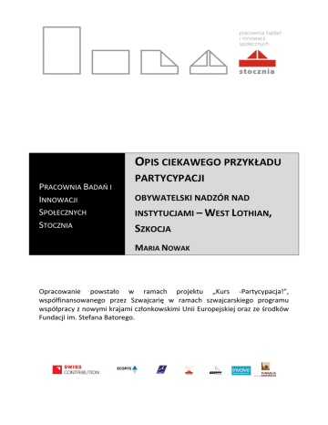 OPIS CIEKAWEGO PRZYKŁADU PRACOWNIA BADAŃ I INNOWACJI SPOŁECZNYCH STOCZNIA PARTYCYPACJI OBYWATELSKI NADZÓR NAD INSTYTUCJAMI – WEST LOTHIAN, SZKOCJA MARIA NOWAK Opracowanie powstało w ramach projektu „Kurs -Partycypacja!”, współfinansowanego przez Szwajcarię w ramach szwajcarskiego programu współpracy z nowymi krajami członkowskimi Unii Europejskiej oraz ze środków Fundacji im. Stefana Batorego. W SKRÓCIE Organizator: Hrabstwo West Lothian, Szkocja Czas trwania: czerwiec-lipiec 2011 Co się działo: W 2011 roku Rada Hrabstwa West Lothian postanowiła wzmocnić zaangażowanie społeczne wobec instytucji oraz włączyć mieszkańców w proces decydowania o kształcie instytucji. W tym celu zdecydowano się wprowadzić obywatelski nadzór nad urzędnikami w postaci inspektorów wybieranych na określony czas. Podczas pilotażowego procesu przygotowano dwóch urzędników na liderów mogących przeprowadzić szkolenie. Następnie, dzięki akcji informacyjnej, wytypowano 4 osoby do dwóch zespołów inspekcyjnych. Podczas wakacji w czerwcu i lipcu 2011 roku przez 6 dni nadzorowali oni prace urzędników nad dwoma zagadnieniami: przygotowaniami do zimy i systemem rekrutacji przedszkolaków do szkół. Inspekcja zakończyła się raportem, którego uwagi i pomysły zostały zaakceptowane przez urzędników i włączone do programów działań. Metoda: obywatelski nadzór nad działaniem instytucji za pomocą metod związanych z badaniem jakości usług: shadowing, mystery shopping, audytów, spotkań grup fokusowych czy ankiet. Przydatna do: edukowania obywateli na temat kształtowania i projektowania instrumentów władzy, wzmacniania kapitału społecznego, integrowania społeczeństwa z instytucjami, poprawy efektywności pracy urzędów Kontakt: Rebecca Kelly, [email protected] 2 HISTORIA Hrabstwo West Lothian, leżące na wschód od Edynburga, zamieszkuje 170 tys mieszkańców. Od dawna władze poszukiwały sposobu na zwiększenie społecznego kapitału i udziału obywateli w podejmowanych decyzjach oraz wzmocnienie integracji będącej produktem zaangażowania. Od 2005 roku zbierane były dane (w formie powtarzanej co pewien czas ankiety) dotyczące jakości i dostępności usług publicznych wykonywanych przez gminę. Jednakże zasięg ankiety okazał się niewystarczający, a przewodniczący Rady hrabstwa zdecydował się na rozwiązanie, które mogłoby doprowadzić do większego społecznego zaangażowania w sprawy publiczne. PRZEBIEG W 2011 roku na mocy wprowadzonej w Hrabstwie Strategii Podnoszenia Jakości (Improvement Strategy) w odniesieniu do usług publicznych, podjęto ze zwiększoną mocą debatę nad włączaniem obywateli w działania samorządowe. Dodatkowo strategicznym celem miało być wprowadzanie innowacyjnych rozwiązań, wzmacniające nowoczesny wizerunek urzędu. Konkretnym rozwiązaniem wpisującym się w nowoprzyjętą strategię było ustanowienie obywatelskiego zespołu, który miał nadzorował działanie miejskich instytucji. Idei przyświecało danie mieszkańcom głosu w kształtowaniu i ustanawianiu priorytetów dla władz, wzmacnianie zaufania do urzędu: jego przejrzystości i otwartości na obywateli, budowanie więzi między urzędnikami a mieszkańcami oraz przekonanie o nadrzędności pluralizmu nad jednostkowym urzędniczym podejściem. Przygotowania do projektu polegały na przeszkoleniu dwóch liderów spośród urzędników. Jedna z osób została dobrana pod kątem znajomości relacji klient-usługodawca i umiejętności współdziałania tych dwóch podmiotów, druga – mogąca ocenić stan zapewniania jakości usług publicznych. Ich praca, polegająca na szkoleniu inspektorów, ukazywaniu mechanizmów pracy i wspieraniu działań pracowników urzędu, trwała 10 dni. Przygotowano wtedy wystandaryzowane narzędzia, czyli stworzono zgodny z wytycznymi EFQM Excellence model1 kwestionariusz oceny pracy instytucji (korzystając z 5-cio stopniowej skali ocen, gdzie 1 oznaczało niezadowalające, a 5 – znakomite). Przyjęto zestaw metod, z których mieli korzystać inspektorzy, a wśród nich shadowing, mystery shopping 2, audyty, spotkania grup fokusowych czy ankiety. 1 http://www.efqm.org/the-efqm-excellence-model Shadowing – bezinwazyjna metoda śledzenia badanej osoby podczas wykonywania przez nią codziennych czynności; Mystery shopping - metoda oceny jakości usług organizacji, w której badacz wciela się w klienta korzystającego z usług i z tej perspektywy ocenia badaną firmę. 2 3 DZIAŁANIE INSPEKTORÓW Po przygotowaniu podłoża teoretycznego rozpoczęto kampanię informacyjną połączoną z rekrutacją przyszłych inspektorów. Stworzono platformę internetową, akcję rozpropagowano poprzez media społecznościowe i klasyczne. Akcja przyniosła rezultaty – zgłosiło się 35 osób. Ostatecznie, z dbałością o reprezentatywność, do programu przyjęto 8 osób. Przeszkolenie zespołu inspektorów trwało 2 dni, podczas których celem miało być dostarczenie wiedzy na temat działania instytucji, umiejętności krytycznego spojrzenia i skutecznej oceny prac urzędników. Inspektorzy nie otrzymywali za swoją prace wynagrodzenia, nie mniej zwracano im koszt dojazdu na miejsce. Z racji pilotażowego charakteru projektu, władze gminy postanowiły objąć inspekcją tylko część działów, jednak przyjęto, ze będą to działy zajmujące się obszarami o największym w danym momencie znaczeniu: naborami do szkół na jesieni oraz następującą po tym, uciążliwą dla Szkotów, zimą. Działanie inspektorów zostało wyznaczone na czerwiec i lipiec 2011 roku. W czasie tych dwóch miesięcy mieli oni możliwość 6-dniowego nadzorowania pracy urzędników wedle wyznaczonego wcześniej planu i technik. Ich działania zakończone zostały raportem, oceniającym prace urzędników i przyjęte przez nich rozwiązania oraz dającym wskazówki co do potencjalnych alternatywnych działań. Część decyzji kwest