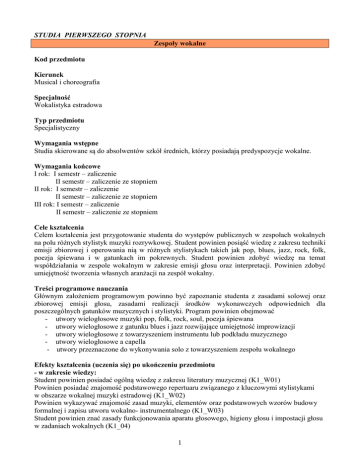 STUDIA PIERWSZEGO STOPNIA Zespoły wokalne Kod przedmiotu Kierunek Musical i choreografia Specjalność Wokalistyka estradowa Typ przedmiotu Specjalistyczny Wymagania wstępne Studia skierowane są do absolwentów szkół średnich, którzy posiadają predyspozycje wokalne. Wymagania końcowe I rok: I semestr – zaliczenie II semestr – zaliczenie ze stopniem II rok: I semestr – zaliczenie II semestr – zaliczenie ze stopniem III rok: I semestr – zaliczenie II semestr – zaliczenie ze stopniem Cele kształcenia Celem kształcenia jest przygotowanie studenta do występów publicznych w zespołach wokalnych na polu różnych stylistyk muzyki rozrywkowej. Student powinien posiąść wiedzę z zakresu techniki emisji zbiorowej i operowania nią w różnych stylistykach takich jak pop, blues, jazz, rock, folk, poezja śpiewana i w gatunkach im pokrewnych. Student powinien zdobyć wiedzę na temat współdziałania w zespole wokalnym w zakresie emisji głosu oraz interpretacji. Powinien zdobyć umiejętność tworzenia własnych aranżacji na zespół wokalny. Treści programowe nauczania Głównym założeniem programowym powinno być zapoznanie studenta z zasadami solowej oraz zbiorowej emisji głosu, zasadami realizacji środków wykonawczych odpowiednich dla poszczególnych gatunków muzycznych i stylistyki. Program powinien obejmować - utwory wielogłosowe muzyki pop, folk, rock, soul, poezja śpiewana - utwory wielogłosowe z gatunku blues i jazz rozwijające umiejętność improwizacji - utwory wielogłosowe z towarzyszeniem instrumentu lub podkładu muzycznego - utwory wielogłosowe a capella - utwory przeznaczone do wykonywania solo z towarzyszeniem zespołu wokalnego Efekty kształcenia (uczenia się) po ukończeniu przedmiotu - w zakresie wiedzy: Student powinien posiadać ogólną wiedzę z zakresu literatury muzycznej (K1_W01) Powinien posiadać znajomość podstawowego repertuaru związanego z kluczowymi stylistykami w obszarze wokalnej muzyki estradowej (K1_W02) Powinien wykazywać znajomość zasad muzyki, elementów oraz podstawowych wzorów budowy formalnej i zapisu utworu wokalno- instrumentalnego (K1_W03) Student powinien znać zasady funkcjonowania aparatu głosowego, higieny głosu i impostacji głosu w zadaniach wokalnych (K1_04) 1 Powinien znać zasady współpracy z prowadzącym zajęcia, akompaniatorem, oraz z sekcją rytmiczną (K1_W05) Student powinien posiadać znajomość stylów w wokalnej muzyce estradowej i związanych z nimi tradycji wykonawczych (K1_W16) Powinien posiadać ogólną wiedzę dotyczącą zagadnień z zakresu muzyki estradowej (K1_W17) Powinien posiadać podstawową wiedzę z zakresu działań interdyscyplinarnych pozwalającą na realizację zadań zespołowych (wokalnych, wokalno-aktorskich) (K1_W19) Powinien posiadać znajomość i ogólną wiedzę dotyczącą wzorców leżących u podstaw sztuki improwizacji wokalnej (K1_W22) - w zakresie umiejętności: Student powinien posiadać umiejętności potrzebne do tworzenia, podstawowego zapisu i realizowania własnych koncepcji artystycznych (K1_U01) Powinien wykazywać umiejętność operowania oddechem i głosem w celu wykonywania repertuaru wokalnego w połączeniu z zadaniem aktorskim (K1_U02) Posiada umiejętność wykorzystywania swej intuicji, emocjonalności i wyobraźni w obszarze ekspresji artystycznej (K1_U03) Student powinien rozróżniać i odpowiednio dobierać środki wykonawcze charakterystyczne dla różnych gatunków muzyki rozrywkowej. (K1_U06) Powinien posiadać ogólną wiedzę i umiejętności dotyczące wykonywania szeroko rozumianej piosenki estradowej (pop, rock, soul, jazz, funk, latin, itp.) aktorskiej oraz musicalowej (K1_U08) Powinien zdobyć umiejętność współpracy z innymi artystami w ramach wspólnych projektów artystycznych (K1_U16) Powinien potrafić czerpać inspiracje z różnych form pracy zespołowej (K1_U17) Powinien posiadać podstawowe umiejętności kształtowania i tworzenia muzyki, które umożliwiają odejście od zapisanego tekstu nutowego (K1_U21) Powinien posiadać umiejętność stosowania improwizacji scatem w zadaniach wokalnych (K1_U22) - w zakresie kompetencji społecznych: Student powinien zdobyć umiejętność organizacji pracy własnej oraz zespołowej w ramach wspólnych projektów artystycznych (K1_K02) Powinien posiadać umiejętność realizacji własnych koncepcji i działań artystycznych opartych na zróżnicowanej stylistyce, wynikającej z wykorzystania wyobraźni, ekspresji i intuicji (K1_K03) Powinien wykazywać umiejętność samooceny i konstruktywnej krytyki w obszarze działań wokalnych oraz muzycznych (K1_K04) Student powinien zdobyć umiejętność współpracy podczas wspólnych działań artystycznych (K1_K07) Powinien wykazywać umiejętność samooceny i konstruktywnej krytyki w obszarze działań wokalnych oraz muzycznych (K1_K12) Powinien potrafić w sposób świadomy kontrolować swoje emocje i zachowania (K1_K13) Metody nauczania Ćwiczenia 2 Nakład pracy studenta potrzebny do osiągnięcia efektów uczenia się 1 pkt ECTS = 30 godzin pracy studenta (zajęcia + praca własna) ROK I II SEMESTR 1 2 3 4 5 Punkty ECTS Ilość godzin w semestrze Rodzaj zaliczenia LEGENDA 3 3 3 3 3 12 12 12 12 12 zal zs zal zs zs III 6 zal –zaliczony; zs – zaliczenie ze stopniem; egz – egzamin; ed –egzamin dyplomowy Kryteria oceny Ocenie podlega: - opanowanie przez studenta podstawowych zasad prawidłowej techniki emisji głosu solowej i zespołowej - dobór przez studenta środków wykonawczych odpowiednich dla poszczególnych stylistyk muzycznych podczas wykonywania wokalnych utworów zespołowych - umiejętność improwizacji wokalnej w zespole - znajomość literatury muzycznej zespołów wokalnych - umiejętność samodzielnego aranżowania wokalnych utworów wielogłosowych Literatura (piśmiennictwo) (dostępne dla studenta) Bregy, W. Elementy techniki wokalnej, Kraków, Polskie Wydawnictwo Muzyczne, 1974 Sad