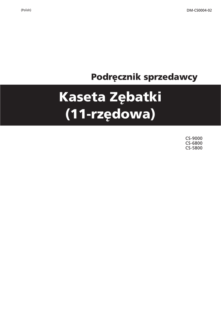 DM-CS0004-02 (Polish) Podręcznik sprzedawcy Kaseta Zębatki (11-rzędowa) CS-9000 CS-6800 CS-5800 WAŻNA INFORMACJA ••Ten podręcznik sprzedawcy jest przeznaczony głównie dla zawodowych mechaników rowerowych. Użytkownicy, którzy nie zostali profesjonalnie przeszkoleni do montażu rowerów, nie powinni samodzielnie zajmować się montażem komponentów, używając tego podręcznika sprzedawcy. Jeśli jakiekolwiek informacje umieszczone w tym podręczniku nie są zrozumiałe, nie należy kontynuować montażu. Aby uzyskać pomoc, należy skontaktować się z punktem sprzedaży lub sprzedawcą roweru. ••Należy przeczytać wszystkie instrukcje obsługi dołączone do produktu. ••Nie wolno demontować ani modyfikować produktu w sposób inny, niż podano w informacjach znajdujących się w tym podręczniku sprzedawcy. ••Wszystkie podręczniki sprzedawcy i instrukcje obsługi można przeglądać w trybie online na naszej stronie internetowej (http://si.shimano.com). ••Należy przestrzegać odpowiednich przepisów i regulacji prawnych danego kraju lub regionu, w którym podmiot prowadzi działalność jako sprzedawca. Ze względów bezpieczeństwa należy dokładnie zapoznać się z niniejszym podręcznikiem sprzedawcy przed użyciem produktu i przestrzegać go podczas jego użytkowania. Poniższe instrukcje muszą być zawsze przestrzegane w celu zapobieżenia obrażeniom oraz uszkodzeniom wyposażenia i otoczenia. Instrukcje zostały sklasyfikowane zgodnie ze stopniem niebezpieczeństwa lub wielkością możliwych szkód, które mogą wynikać z nieprawidłowego użytkowania produktu. NIEBEZPIECZEŃSTWO Niezastosowanie się do podanych instrukcji może skutkować śmiercią albo poważnymi obrażeniami. OSTRZEŻENIE Niezastosowanie się do podanych instrukcji może skutkować śmiercią albo poważnymi obrażeniami. PRZESTROGA Niezastosowanie się do podanych instrukcji może skutkować obrażeniami albo uszkodzeniami wyposażenia i otoczenia. 2 ABY ZAPEWNIĆ BEZPIECZEŃSTWO OSTRZEŻENIE ••Podczas montażu komponentów należy pamiętać, aby przestrzegać procedur podanych w instrukcji obsługi. Zaleca się korzystanie wyłącznie z oryginalnych części Shimano. Jeśli takie części jak śruby i nakrętki poluzują się lub zostaną uszkodzone, może to spowodować nagły upadek z roweru i poważne obrażenia. Ponadto w przypadku nieprawidłowego wykonania regulacji mogą wystąpić problemy, które spowodują nagły upadek z roweru i poważne obrażenia. • • Przed wykonaniem czynności konserwacyjnych, np. wymiany części, należy założyć okulary ochronne, które będą chronić oczy. ••Po uważnym przeczytaniu niniejszego podręcznika sprzedawcy należy zachować go na przyszłość. UWAGA Należy również upewnić się, że użytkownikom przekazano następujące informacje: •• Jeżeli łańcuch w czasie użytkowania nadal spada z tarcz, wymienić tarcze i łańcuch. •• Gwarancja nie obejmuje naturalnego zużycia lub pogorszenia działania wynikającego z normalnego użytkowania. Montaż na rowerze i konserwacja: •• Łańcucha CS-9000/6800/5800 należy używać zawsze w połączeniu z CN-9000/6800/CN-HG600-11. Użycie innych łańcuchów nie jest możliwe z uwagi na niezgodność wymiarów. •• Tarcze należy okresowo myć neutralnym środkiem czyszczącym. Ponadto czyszczenie łańcucha neutralnym środkiem czyszczącym i smarowanie może być skutecznym sposobem zwiększenia trwałości tarcz i łańcucha. •• Należy zawsze korzystać z zalecanych zestawów zębatek. Rzeczywisty produkt może różnić się od pokazanego na rysunku, ponieważ ten podręcznik służy głównie do wyjaśnienia procedur użytkowania tego produktu. 3 MONTAŻ Szeroki wypust W przypadku każdej zębatki, powierzchnia z oznaczeniem grupy powinna być skierowana na zewnątrz i ustawiona tak, aby szerokie występy na każdej zębatce i część A (na której rowek jest szeroki) główki piasty, były w jednej linii. A Rowek jest szeroki tylko wjednym miejscu. < CS-9000: 11–23T, 11–25T, 11–28T, 12–25T, 12–28T > Podkładki dystansowe zębatek Nakrętka kasety 1 2 3 4 5 6 7 8 11-23T Numer 1 2 3 4 5 6 7 8 9 10 11 Liczba zębów 23 21 19 18 17 16 15 14 13 12 11 Oznaczenie 11S 23A 11S 21A 11S 19A 11S 18A 11S 17A 11S 16A 11S 15A 11S 14A 11S 13A 11S 12A 11S 11A Numer 1 2 3 4 5 6 7 8 9 10 11 Oznaczenie 11S 25A 11S 23B 11S 21D 11S 19D 11S 18B 11S 17C 11S 16A 11S 15A 11S 14A 11S 13B 11S 12B 10 11-25T Pająk 11S 11-23 11S 11-23 - Liczba zębów 25 23 21 19 17 16 15 14 13 12 11 Oznaczenie 11S 25A 11S 23B 11S 21B 11S 19B 11S 17A 11S 16A 11S 15A 11S 14A 11S 13A 11S 12A 11S 11A 12-25T Liczba zębów 25 23 21 19 18 17 16 15 14 13 12 9 11-28T Pająk 11S 11-25 11S 11-25 - 12-28T Pająk 11S 12-25 11S 12-25 - Liczba zębów 28 25 23 21 19 17 16 15 14 13 12 Oznaczenie 11S 28A 11S 25B 11S 23C 11S 21C 11S 19C 11S 17C 11S 16A 11S 15A 11S 14A 11S 13B 11S 12B 4 11 Pająk 11S 12-28 11S 12-28 - Liczba zębów 28 25 23 21 19 17 15 14 13 12 11 Oznaczenie 11S 28A 11S 25B 11S 23C 11S 21C 11S 19C 11S 17B 11S 15A 11S 14A 11S 13A 11S 12A 11S 11A Pająk 11S 11-28 11S 11-28 - < CS-6800: 11T–23T, 11–25T, 11–28T, 11–32T, 12–25T > Podkładki dystansowe zębatek Nakrętka kasety 1 2 3 4 5 7 6 8 11-23T 9 10 11 11-25T 11-28T Numer Liczba zębów Oznaczenie Pająk Liczba zębów Oznaczenie Pająk Liczba zębów Oznaczenie Pająk 1 2 3 23 21 19 11S 23A 11S 21A 11S 19A 11S 11-23 25 23 21 11S 25A 11S 23B 11S 21B 11S 11-25 28 25 23 11S 28A 11S 25B 11S 23C 11S 11-28 4 18 11S 18A 5 6 7 8 9 10 11 17 16 15 14 13 12 11 11S 17A 11S 16A 11S 15A 11S 14A 11S 13A 11S 12A 11S 11A Numer Liczba zębów Oznaczenie 1 2 3 4 5 6 7 8 9 10 11 32 28 25 22 20 18 16 14 13 12 11 11S 32A 11S 28B 11S 25C 11S 22A 11S 20A 11S 18C 11S 16B 11S 14A 11S 13A 11S 12A 11S 11A 11S 11-23 – – – – – – 19 11S 19B 17 16 15 14 13 12 11 11S 17A 11S 16A 11S 15A 11S 14A 11S 13A 11S 12A 11S 11A Liczba zębów 