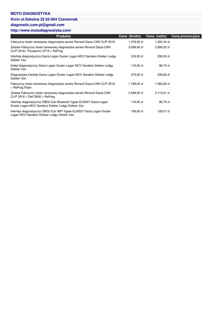 MOTO DIAGNOSTYKA Kicin ul.Szkolna 32 62-004 Czerwonak [email protected] http://www.motodiagnostyka.com/ Produkty Cena (brutto) Cena (netto) Fabryczny tester serwisowy diagnostyka serwis Renault Dacia CAN CLIP 2016 1.479,00 zł 1.202,44 zł Zestaw Fabryczny tester serwisowy diagnostyka serwis Renault Dacia CAN CLIP 2016+ Panasonic CF19 + ReProg 3.599,00 zł 2.926,02 zł Interfejs diagnostyczny Dacia Logan Duster Logan MCV Sandero Dokker Lodgy Dokker Van 319,00 zł 259,35 zł Kabel diagnostyczny Dacia Logan Duster Logan MCV Sandero Dokker Lodgy Dokker Van 119,00 zł 96,75 zł Diagnostyka interfejs Dacia Logan Duster Logan MCV Sandero Dokker Lodgy Dokker Van 279,00 zł 226,83 zł Fabryczny tester serwisowy diagnostyka serwis Renault Dacia CAN CLIP 2016 + ReProg Flash 1.799,00 zł 1.462,60 zł Zestaw Fabryczny tester serwisowy diagnostyka serwis Renault Dacia CAN CLIP 2016 + Dell D630 + ReProg 2.599,00 zł 2.113,01 zł Interfejs diagnostyczny OBD2 iCar Bluetooth Vgate ELM327 Dacia Logan Duster Logan MCV Sandero Dokker Lodgy Dokker Van 119,00 zł 96,75 zł Interfejs diagnostyczny OBD2 iCar WiFi Vgate ELM327 Dacia Logan Duster Logan MCV Sandero Dokker Lodgy Dokker Van 159,00 zł 129,27 zł Cena promocyjna