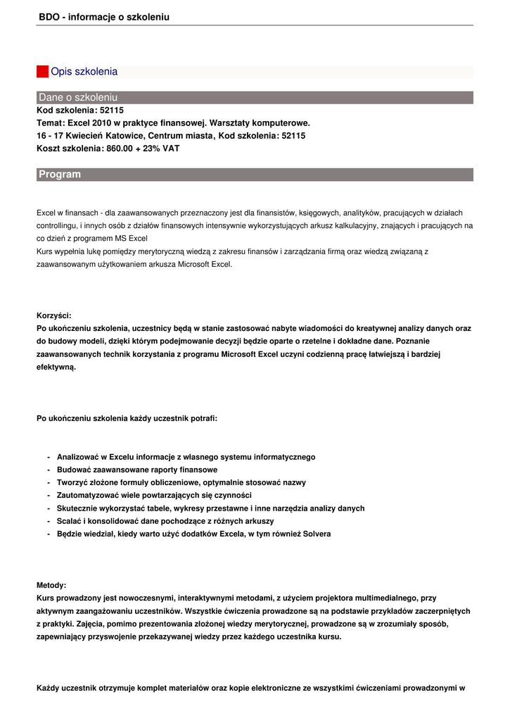 BDO - informacje o szkoleniu Opis szkolenia Dane o szkoleniu Kod szkolenia: 52115 Temat: Excel 2010 w praktyce finansowej. Warsztaty komputerowe. 16 - 17 Kwiecień Katowice, Centrum miasta, Kod szkolenia: 52115 Koszt szkolenia: 860.00 + 23% VAT Program Excel w finansach - dla zaawansowanych przeznaczony jest dla finansistów, księgowych, analityków, pracujących w działach controllingu, i innych osób z działów finansowych intensywnie wykorzystujących arkusz kalkulacyjny, znających i pracujących na co dzień z programem MS Excel Kurs wypełnia lukę pomiędzy merytoryczną wiedzą z zakresu finansów i zarządzania firmą oraz wiedzą związaną z zaawansowanym użytkowaniem arkusza Microsoft Excel. Korzyści: Po ukończeniu szkolenia, uczestnicy będą w stanie zastosować nabyte wiadomości do kreatywnej analizy danych oraz do budowy modeli, dzięki którym podejmowanie decyzji będzie oparte o rzetelne i dokładne dane. Poznanie zaawansowanych technik korzystania z programu Microsoft Excel uczyni codzienną pracę łatwiejszą i bardziej efektywną. Po ukończeniu szkolenia każdy uczestnik potrafi: - Analizować w Excelu informacje z własnego systemu informatycznego - Budować zaawansowane raporty finansowe - Tworzyć złożone formuły obliczeniowe, optymalnie stosować nazwy - Zautomatyzować wiele powtarzających się czynności - Skutecznie wykorzystać tabele, wykresy przestawne i inne narzędzia analizy danych - Scalać i konsolidować dane pochodzące z różnych arkuszy - Będzie wiedział, kiedy warto użyć dodatków Excela, w tym również Solvera Metody: Kurs prowadzony jest nowoczesnymi, interaktywnymi metodami, z użyciem projektora multimedialnego, przy aktywnym zaangażowaniu uczestników. Wszystkie ćwiczenia prowadzone są na podstawie przykładów zaczerpniętych z praktyki. Zajęcia, pomimo prezentowania złożonej wiedzy merytorycznej, prowadzone są w zrozumiały sposób, zapewniający przyswojenie przekazywanej wiedzy przez każdego uczestnika kursu. Każdy uczestnik otrzymuje komplet materiałów oraz kopie elektroniczne ze wszystkimi ćwiczeniami prowadzonymi w BDO - informacje o szkoleniu ramach kursu oraz przykładowymi arkuszami programu Microsoft Excel. Program warsztatu obejmuje między innymi następującą tematykę: - Porównanie wersji Excela 2003, 2007, 2010, 2013 typy plików, rozwój programu, różnice i cechy wspólne, komunikacja pomiędzy różnymi wersjami arkusza, specyfika wykorzystania aplikacji w służbach finansowych firmy - Optymalna "personalizacja" programu do pracy, zaawansowane opcje ustawień Excela - Wykorzystanie nazw lokalnych i globalnych ważnych na jednym arkuszu, deklarowanie nazw dynamicznych, zastosowanie nazw w formułach - Formatowanie warunkowe, warianty zastosowań, edycja formatów warunkowych - Wielokrotne zagnieżdżanie funkcji, formuły tablicowe, stałe liczbowe - Wykorzystanie funkcji Excela z kategorii: matematyczne, daty i czasu, wyszukiwania i adresu, baz danych, finansowych, logicznych, tekstowych, informacyjnych - Automatyzacja obliczeń za pomocą funkcji budowanych przez użytkownika, korzystanie z nich w innych arkuszach, tworzenie dodatków. - Inspekcja formuł, sprawdzanie błędów - Technologie pobierania danych ze źródeł zewnętrznych (źródła danych Excela, kwerendy baz danych, wykorzystanie modułu MS Query, pobieranie danych z różnych źródeł, wykorzystanie Internetu - dane w formacie XML) - Stosowanie tabel przestawnych jako narzędzia analizy danych biznesowych, zasady tworzenia tabel przestawnych - Tworzenie i modyfikowanie tabel przestawnych w oparciu o różne źródła danych, własne pola obliczeniowe, grupowanie danych, niestandardowe formatowanie danych w tabelach przestawnych, formatowanie warunkowe w tabeli przestawnej - Funkcje bazodanowe, przykłady zastosowań praktycznych, dobór kryteriów, alternatywa i koniunkcja kryteriów - Import danych z plików tekstowych do Excela - analiza danych tekstowych, automatyzacja odświeżania danych. - Ochrona arkusza, ochrona skoroszytu, walidacja danych - Optymalizacja rozwiązań złożonych problemów za pomocą dodatku Solver, prognozowanie - Przyspieszenie pracy dzięki szablonom Excela, szablony z makropoleceniami - Tworzenie formularzy elektronicznych w Excelu, wykorzystywanie w formularzach elementów sterujących (listy, listy rozwijalne, przyciski, pokrętła) - Rejestrowanie, uruchamianie i edycja makr, dzielenie długich makr na procedury, planowanie nagrywania makr dla optymalnego ich odtwarzania, makra z odwołaniem względnym i bezwzględnym - Konsolidacja danych pochodzących z różnych arkuszy, różne sposoby konsolidacji - Organizacja pracy z programem Excel w sieci komputerowej: jednoczesna praca wielu użytkowników na jednym arkuszu, łączenie arkuszy i skoroszytów za pomocą sieci komputerowej, scalanie danych z wielu arkuszy - Graficzna prezentacja danych finansowych za pomocą wykresów (wykresy złożone, wykresy prezentujące wiele serii danych, analiza trendu na wykresie, wykresy niestandardowe, wykresy oparte o dane z tabel przestawnych), - Budowanie modeli wielowariantowych z użyciem scenariuszy, podsumowania scenariuszy Prowadzący Janusz Gach BDO - informacje o szkoleniu doświadczony wykładowca, trener. Specjalizuje się między innymi w tematyce zastosowania arkuszy kalkulacyjnych w analizach związanych z potrzebami biznesu. Autor wielu programów szkoleniowych z dziedziny wykorzystania informatyki we wspomaganiu zarządzania nowoczesnym przedsiębiorstwem. Autor kilku podręczników z zakresu pracy w systemach MS Windows, obsłudze arkusza kalkulacyjnego MS Excel, obsłudze edytora MS Word Informacje organizacyjne Kalendarz zajęć: Informacje i zgłoszenia