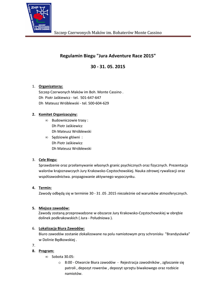 Szczep Czerwonych Maków im. Bohaterów Monte Cassino Regulamin Biegu "Jura Adventure Race 2015" 30 - 31. 05. 2015 1. Organizatorzy: Szczep Czerwonych Maków im Boh. Monte Cassino . Dh Piotr Jaśkiewicz - tel. 501-647-647 Dh Mateusz Wróblewski - tel. 500-604-629 2. Komitet Organizacyjny: • Budowniczowie trasy : Dh Piotr Jaśkiewicz Dh Mateusz Wróblewski • Sędziowie główni : Dh Piotr Jaśkiewicz Dh Mateusz Wróblewski 3. Cele Biegu: Sprawdzenie oraz przełamywanie własnych granic psychicznych oraz fizycznych. Prezentacja walorów krajoznawczych Jury Krakowsko-Częstochowskiej. Nauka zdrowej rywalizacji oraz współzawodnictwa. propagowanie aktywnego wypoczynku. 4. Termin: Zawody odbędą się w terminie 30 - 31 .05 .2015 niezależnie od warunków atmosferycznych. 5. Miejsce zawodów: Zawody zostaną przeprowadzone w obszarze Jury Krakowsko-Częstochowskiej w obrębie dolinek podkrakowskich ( Jura - Południowa ). 6. Lokalizacja Biura Zawodów: Biuro zawodów zostanie zlokalizowane na polu namiotowym przy schronisku "Brandysówka" w Dolinie Będkowskiej . 7. 8. Program: • Sobota 30.05: o 8:00 - Otwarcie Biura zawodów - Rejestracja zawodników , zgłaszanie się patroli , depozyt rowerów , depozyt sprzętu biwakowego oraz rozbicie namiotów. Szczep Czerwonych Maków im. Bohaterów Monte Cassino o o o o o o • 9:00 - Zamknięcie biura zawodów 9:00 - Odprawa zawodników - Obowiązkowa ( Przypomnienie głównych zasad zawodów ,Zasad bezpieczeństwa , oraz zdrowej rywalizacji ). 9:30 - Start zawodów 17:00 - Oczekiwanie pierwszych zawodników na mecie. 20:00 - Zakończenie zawodów 21:00 - Wspólne ognisko harcerskie Niedziela 31.05: o 8:00 - Pobudka o 9:30 - Apel Inauguracyjny - Rozdanie nagród o 10:30 - Zakończenie zawodów , złożenie obozu. 9. Trasa: • 25 km - pieszo • 60 km - rowerem Zadania specjalne: • Zadania logiczne • Inne zadania zręcznościowe ( np. Techniki linowe lub obsługa urządzeń typu GPS ) • Tyrolka Na trasie Umieszczony będzie punkt żywnościowy, na którym uczestnicy będą mogli uzupełnić zapasy pożywienia oraz wody a do tego zjeść ciepły posiłek czy wypić ciepły napój. 10. Punkty Kontrolne: Punkty Kontrolne będą umieszczone w charakterystycznych miejscach widoczne z ok 100m w formie świetlnych lampionów. Każdy lampion będzie oznaczony symbolem imprezy oraz numerem punktu kontrolnego. Na punkcie kontrolnym znajdował się będzie perforator, którym należy podbić samodzielnie kartę zawodnika. Na niektórych punktach kontrolnych będą sędziowie którzy będą wpisywać godzinę przybycia na punkt oraz kolejność zgłaszanych drużyn. Pozostałe punkty są punktami samodzielnymi tzn. takimi na których sędziów nie będzie. Na osiągnięcie poszczególnych punktów kontrolnych wyznaczono limity czasowe, w których zawodnicy są zobowiązani przybyć by ukończyć bieg. 11. Uczestnictwo: Bieg jest organizowany dla młodzieży powyżej 16 roku życia ( za zgodą organizatora oraz osoby odpowiedzialnej prawnie) oraz osób dorosłych związanych z działalnością Harcerską a w szczególności działalnością Szczepu Czerwonych Maków im. Boh. Monte Cassino. Uczestnicy niepełnoletni powinni przedstawić stosowne oświadczenie osoby odpowiedzialnej prawnie zezwalającej uczestnikowi niepełnoletniemu na start w biegu. Maksymalna liczba drużyn na zawodach wynosi 20 . Drużyny są dwuosobowe ( męskie, żeńskie , mieszane ). Szczep Czerwonych Maków im. Bohaterów Monte Cassino Podczas zawodów obowiązuje zakaz oddalania się zawodników jednej drużyny od siebie na ponad 100m ( w zasięgu wzroku ). Wpłata wpisowego jest równoznaczna z rezerwacją miejsca startowego oraz z wpisaniem na listę startową. Dopuszcza się zamianę zawodników w drużynach w przypadku zrezygnowania któregoś z członków drużyny. Zgłoszeń należy dokonywać drużynowo . W przypadku chęci uczestnictwa pojedynczej osoby należy zgłosić to organizatorowi , który dobierze takiej osobie druga osobę na zawody. 12. Charakter Biegu: Zawody mają charakter przygodowy łączący w sobie dyscypliny sportowe takie jak bieg na orientację , jazda na rowerze na orientację w terenie. Ponadto na trasie na zawodników czekają zadania specjalne z wykorzystaniem technik linowych, zadania logiczne oraz innego typu niespodzianki :-) . Każdy uczestnik musi dysponować sprawnym rowerem odpowiednio przygotowanym do jazdy po drogach publicznych w ruchu drogowym. a. Odcinek Pieszy: Etap pieszy - Jest pierwszym etapem w formie BnO ( Bieg na Orientację ). Zawodnicy są zobligowani do dysponowania obuwiem biegowym terenowym oraz stosową odzieżą odpowiednią do warunków atmosferycznych. b. Odcinek Rowerowy: Etap Rowerowy - Jest drugim etapem. Zawodnicy są zobligowani do posiadania własnego sprawnego roweru przystosowanego do jazdy po terenie oraz odpowiednio oznakowanego zgodnie z zasadami ruchu drogowego. Ponadto Każdy zawodnik musi posiadać kask rowerowy oraz elementy odblaskowe ( np. w formie opasek, naklejek odblasków rowerowych ). c. Zadania specjalne: Na trasie zostaną ustawione zadania specjalne do wykonania . Ich rozmieszczenie , forma oraz kolejność niezostanie podana. Przed zawodami należy zapoznać się ze znajomością technik linowych oraz z obsługą podstawowych przyrządów asekuracyjnych , zjazdowych oraz zaciskowych takich jak . ( np. Małpa, Rolka, Gri-Gri itp. ) 13. Wyposażenie: Każdy uczestnik jest zobowiązany posiadać przy sobie : • Odzież i obuwie biegowe • Lekki plecak - najlepiej typu "Camel Bag" • Prowiant • Latarkę • Opaski odblaskowe • Folia NRC • Kompas - min 1 szt. na drużynę Szczep Czerwonych Maków im. Bohaterów Monte Cassino • • Telefon komórkowy - 1 na drużynę 2 L wody / osobę 14. Mapa: Organizator zapewnia mapy trasy do BnO 1:10 000 oraz RJnO w skali 1:50 000 oraz mapę szczegółową wybranego odcinka trasy o wyższej skali. 15. Karta Startowa: Każdy uczestnik otrzyma Kartę