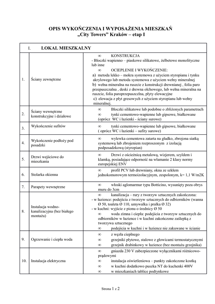 OPIS WYKOŃCZENIA I WYPOSAŻENIA MIESZKAŃ „City Towers” Kraków – etap I I. LOKAL MIESZKALNY 1. Ściany zewnętrzne 2. Ściany wewnętrzne konstrukcyjne i działowe 3. Wykończenie sufitów 4. Wykończenie podłoży pod posadzki 5. Drzwi wejściowe do mieszkania 6. Stolarka okienna 7. Parapety wewnętrzne 8. Instalacja wodnokanalizacyjna (bez białego montażu) 9. Ogrzewanie i ciepła woda 10. Instalacja elektryczna • KONSTRUKCJA - Bloczki wapienno – piaskowe silikatowe, żelbetowe monolityczne lub inne • OCIEPLENIE I WYKOŃCZENIE: a) metoda lekko – mokra systemowa z użyciem styropianu i tynku akrylowego lub metoda systemowa z użyciem wełny mineralnej b) wełna mineralna na ruszcie z konstrukcji drewnianej , folia paro przepuszczalna , deski z drewna olchowego, lub wełna mineralna na ruszcie, folia paroprzepuszczlna, płyty elewacyjne c) elewacja z płyt gresowych z użyciem styropianu lub wełny mineralnej. • Bloczki silikatowe lub podobne o zbliżonych parametrach • tynki cementowo-wapienne lub gipsowe, białkowane (oprócz WC i łazienki - ściany surowe) • tynki cementowo-wapienne lub gipsowe, białkowane ( oprócz WC i łazienki – sufity surowe) • wylewka cementowa zatarta na gładko, zbrojona siatką systemową lub zbrojeniem rozproszonym z izolacją podposadzkową (styropian) • Drzwi z ościeżnicą metalową, wizjerem, szyldem i klamką, posiadające odporność na włamanie 2 klasy normy europejskiej ENV • profil PCV lub drewniany, okna ze szkłem jednokomorowym termoizolacyjnym, zespolonym, k= 1,1 W/m2K • włoski aglomarmur typu Botticino, wysunięty poza obrys muru do 3cm • kanalizacja – rury z tworzyw sztucznych zakończona: - w łazience: podejścia z tworzyw sztucznych do odbiorników (wanna Ø 50, toaleta Ø 110, umywalka i pralka Ø 32) - w kuchni: wyjście z pionu o średnicy Ø 50 • woda zimna i ciepła: podejścia z tworzyw sztucznych do odbiorników w łazience i w kuchni zakończone zaślepką z tworzywa sztucznego • podejścia w kuchni i w łazience nie zakuwane w ścianie • • • • z węzła cieplnego grzejniki płytowe, stalowe z głowicami termostatycznymi grzejnik drabinkowy w łazience (bez montażu grzejnika) gniazda 230 V zabezpieczone wyłącznikami różnicowoprądowymi • instalacja oświetleniowa – punkty zakończone kostką • w kuchni dodatkowo puszka NT do kuchenki 400V • w mieszkaniach tablice podtynkowe Strona 1 z 2 • 11. Instalacja telefoniczna 12. Instalacja telewizyjna 1 gniazdo telefoniczne umożliwiające podłączenie telefonii cyfrowej lub Internetu • 1 gniazdo TV 13. Instalacja domofonowa • aparat naścienny 14. Tarasy nad garażami • posadzka z kostki betonowej lub taras zielony 15. Tarasy nad lokalami usługowymi • 16. posadzka z kostki betonowej lub listew impregnowanych lub taras zielony • • posadzka z listew impregnowanych balustrady stalowe malowane proszkowo lub balustrady stalowe malowane proszkowo z wypełnieniem szkłem bezpiecznym Balkony II. GARAŻ/ KOMÓRKI LOKATORSKIE 1. Ściany zewnętrzne • żelbetowe monolityczne, malowane 2. Ściany wewnętrzne • żelbetowe monolityczne lub silikatowe, malowane 3. Płyta posadzkowa • posadzka betonowa przemysłowa utwardzona powierzchniowo lub posadzka z kostki betonowej na podsypce cementowo-piaskowej 4. Strop nad parterem • żelbetowy monolityczny, docieplony w obrębie pomieszczeń nieogrzewanych parteru Pomieszczenia techniczne • posadzka betonowa przemysłowa lub płytki gresowe mrozoodporne drzwi do pomieszczeń technicznych systemowe wydzielone ściankami działowymi, z drzwiami, i oświetleniem, nietynkowane posadzka betonowa przemysłowa instalacja oświetlenia podstawowego, awaryjnego i ewakuacyjnego wentylacja mechaniczna 5. 6. Komórki lokatorskie 7 Instalacje • • • • • • III. KOMUNIKACJA WEWNĘTRZNA - KLATKI SCHODOWE 1. Ściany wewnętrzne i sufity • • tynk cementowo-wapienny lub tynk gipsowy malowanie farbą akrylową 2. Spoczniki, schody • płytki gresowe 3. Ogrzewanie c.o. • grzejnikowe, wodne 4. Instalacja oświetleniowa • oświetlenie i osprzęt dostosowany do wymogów oświetlenia schodowego W przypadku trudności w nabyciu danego rodzaju materiału, może być zastosowany materiał zastępczy o porównywalnej jakości. Strona 2 z 2