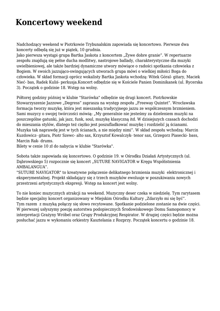 Koncertowy weekend Nadchodzący weekend w Piotrkowie Trybunalskim zapowiada się koncertowo. Pierwsze dwa koncerty odbędą się już w piątek, 10 grudnia. Jako pierwsza wystąpi grupa Bartka Jaskota z koncertem „Żywe dobre granie”. W repertuarze zespołu znajdują się pełne ducha modlitwy, nastrojowe ballady, charakterystyczne dla muzyki uwielbieniowej, ale także bardziej dynamiczne utwory mówiące o radości spotkania człowieka z Bogiem. W swoich jazzująco-swingujących utworach grupa mówi o wielkiej miłości Boga do człowieka. W skład formacji oprócz wokalisty Bartka Jaskota wchodzą: Witek Góral- gitary, Maciek Nieć- bas, Radek Kuliś- perkusja.Koncert odbędzie się w Kościele Panien Dominikanek (ul. Rycerska 3). Początek o godzinie 18. Wstęp na wolny. Półtorej godziny później w klubie "Starówka" odbędzie się drugi koncert. Piotrkowskie Stowarzyszenie Jazzowe „Degress” zaprasza na występ zespołu „Freeway Quintet”. Wrocławska formacja tworzy muzykę, która jest mieszanką tradycyjnego jazzu ze współczesnym brzmieniem. Sami muzycy o swojej twórczości mówią: „My generalnie nie jesteśmy za dzieleniem muzyki na poszczególne gatunki, jak jazz, funk, soul, muzykę klasyczną itd. W dzisiejszych czasach dochodzi do mieszania stylów, dlatego też ciężko jest poszufladkować muzykę i rozdzielić ją ścianami. Muzyka tak naprawdę jest w tych ścianach, a nie między nimi”. W skład zespołu wchodzą: Marcin Kuzdowicz- gitara, Piotr Szewc- alto sax, Krzysztof Kowalczyk- tenor sax, Grzegorz Piasecki- bass, Marcin Rak- drums. Bilety w cenie 10 zł do nabycia w klubie "Starówka". Sobota także zapowiada się koncertowo. O godzinie 19. w Ośrodku Działań Artystycznych (ul. Dąbrowskiego 5) rozpocznie się koncert „SUTURE NAVIGATOR w Kręgu Współistnienia AMBALANGUA”. "SUTURE NAVIGATOR" to kreatywne połączenie delikatnego brzmienia muzyki elektronicznej i eksperymentalnej. Projekt składający się z trzech muzyków ewoluuje w poszukiwaniu nowych przestrzeni artystycznych ekspresji. Wstęp na koncert jest wolny. To nie koniec muzycznych atrakcji na weekend. Muzyczny deser czeka w niedzielę. Tym rarytasem będzie specjalny koncert organizowany w Miejskim Ośrodku Kultury „Zdarzyło mi się być”. Tym razem z muzyką połączy się słowo recytowane. Spotkanie podzielone zostanie na dwie części. W pierwszej usłyszymy poezję autorstwa podopiecznych Środowiskowego Domu Samopomocy w interpretacji Grażyny Wróbel oraz Grupy Produkcyjnej Respirator. W drugiej części będzie można posłuchać jazzu w wykonaniu orkiestry Kasztelania z Rozprzy. Początek koncertu o godzinie 18.