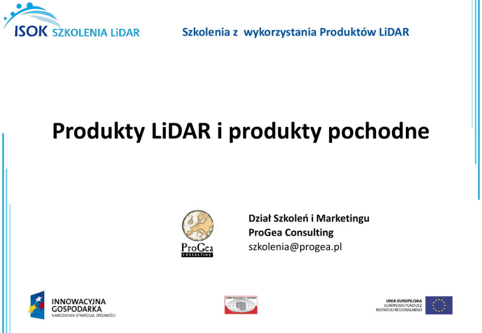 Szkolenia z wykorzystania Produktów LiDAR Produkty LiDAR i produkty pochodne Dział Szkoleń i Marketingu ProGea Consulting [email protected] Numeryczne modele wysokościowe Definicja Źródło: Wężyk, 2013 2014-12-01 Produkty LiDAR i produkty pochodne 2 Numeryczny model terenu (1) Definicja Definicja: Numeryczny model terenu (NMT) - to numeryczna reprezentacja powierzchni terenowej, utworzona zazwyczaj przez zbiór odpowiednio wybranych punktów (XYZ) tej powierzchni oraz algorytmy interpolacyjne umożliwiające odtworzenie jej kształtu na określonym obszarze (Gaździcki 2001). Źródło: Wężyk, 2013 2014-12-01 Produkty LiDAR i produkty pochodne 3 Numeryczny model terenu (2) Typ: GRID Definicja: Model GRID - bazuje na siatce regularnych kwadratów, przy czym każdemu węzłowi tej siatki przypisana jest wysokość (H). SRTM, Polska 2014-12-01 SRTM, Puszcza Niepołomicka Produkty LiDAR i produkty pochodne Źródło: ProGea Consulting 4 Numeryczny model terenu (3) Typ: TIN Definicja: Model TIN oparty jest na nieregularnej siatce trójkątów (ang. Triangulated Irregular Network), która generowana jest na podstawie oryginalnych danych ALS (chmurze punktów reprezentujących grunt) bez jakiejkolwiek ich interpolacji. Wierzchołki trójkątów tworzone są na punktach klasy grunt (ang. Ground; nr = 2; ASPRS). Każdy z wierzchołków trójkąta opisany jest przez współrzędne X, Y i Z. Dwie pierwsze współrzędne określają położenie w układzie płaskim (2-D), a trzecia wysokość danego punktu (3D). Model TIN zawiera informacje o topologii trójkątów. Spadek i ekspozycja są stałe dla każdego trójkąta, wysokość jest interpolowana. Źródło: ProGea Consulting 2014-12-01 Produkty LiDAR i produkty pochodne 5 Numeryczny model terenu (4) Typ hybrydowy Definicja: Model hybrydowy ma strukturę warstwową, gdzie warstwę podstawową stanowi siatka kwadratów z wysokościami (GRID). GRID LPIS TIN Źródło: Borkowski, 2014 2014-12-01 Produkty LiDAR i produkty pochodne 6 Numeryczny model terenu (5) Bezpośrednie pomiary geodezyjne Charakterystyka: • sposób bardzo dokładny, ale tylko punktów pomiarowych, • zagęszczenie punktów stosunkowo niewielkie, geomorfologią terenu, • metoda stosowana do budowy lokalnych i precyzyjnych NMT. • metoda czasochłonna. pomiarowych uwarunkowane Źródło: Wężyk, 2013 Źródło: www.leica.com 2014-12-01 Produkty LiDAR i produkty pochodne 7 Numeryczny model terenu (6) Wektoryzacja map Digitalizacja istniejących materiałów kartograficznych • digitalizacji (manualnej lub półautomatycznej) podlegają linie warstwicowe oraz inne elementy rzeźby terenu (np. punkty wysokościowe) zobrazowane na mapach topograficznych, • metoda stosunkowo tania ale mało dokładna. Półautomatyczna wektoryzacja rysunku warstwicowego w programie R2V 2014-12-01 Produkty LiDAR i produkty pochodne Mapa topograficzna Źródło: www.rowerempogorach.pl 8 Numeryczny model terenu (7) Fotogrametria Opracowania fotogrametryczne stereogramów zdjęć lotniczych lub satelitarnych • możliwe jest bardzo duże zagęszczenie powierzchni terenu punktami pomiarowymi (pikiety wysokościowe), • pomiarowi podlegają punkty rozproszone regularnie lub nieregularnie oraz wszelkie punkty charakterystyczne, • pomiar może być realizowany w trybie obserwacji wzrokowej lub automatycznie z wykorzystaniem korelacji obrazu (steromatching). Źródło: www.geoforum.pl Wyznaczanie położenia punktu na podstawie dwóch zdjęć 2014-12-01 Produkty LiDAR i produkty pochodne 9 Numeryczny model terenu (8) Dopasowanie zdjęć • automatyczne znalezienie wzajemnej odpowiedniości fragmentów dwóch obrazów cyfrowych; • w przypadku obszarów wynikiem jest NMPT; • ang. Stereomatching; • algorytm SGM (Semi Global Matching). 2014-12-01 leśnych Źródło: Wężyk 2014 NMPT masywu Kudłonia (Gorce) wygenerowany na podstawie stereomatchingu zdjęć lotniczych LPIS Produkty LiDAR i produkty pochodne 10 Numeryczny model terenu (9) Lotnicze skanowanie laserowe Podstawą generowania NMT jest sklasyfikowana chmura punktów, z której wykorzystuje się zazwyczaj tylko klasę punktów reprezentujących grunt. Źródło: ProGea Consulting Chmura punktów ALS NMT wygenerowany z chmury punktów ALS Źródło: ProGea Consulting 2014-12-01 Produkty LiDAR i produkty pochodne 11 Numeryczny model terenu (10) Interferometria radarowa • metoda polega na obrazowaniu powierzchni terenu z wykorzystaniem radaru (zakres mikrofalowy) z pułapu lotniczego, a najczęściej satelitarnego; • wyniku odpowiedniego przetwarzania danych, na podstawie przesunięcia fazowego wyznaczane są wysokości punktów; • technologia stosowana do budowy modeli globalnych obejmujących bardzo duże obszary Ziemi (np. misja TanDEM-X. Źródło: www.dlr.de 2014-12-01 Produkty LiDAR i produkty pochodne 12 Numeryczny model terenu (11) Modelowanie linii krawędziowych (1) Metody bazujące na cyfrowym przetwarzaniu obrazów Wynik wykrywania krawędzi na NMT filtrem Laplace'a • chmura punktów klasy „grunt” interpolowana jest na regularny raster, • poszczególnym wysokościom przypisywane są stopnie szarości obrazu, • powstały obraz poddawany jest detekcji krawędzi z wykorzystaniem standardowych narzędzi (np. filtr Laplace’a) przetwarzania obrazów, • otrzymuje się krawędziowej, położenie planarne linii • trzecią współrzędną oblicza się na podstawie interpolacji NMT lub bezpośrednio z chmury punktów (Borkowski 2014). Źródło: ProGea Consulting 2014-12-01 Produkty LiDAR i produkty pochodne 13 Numeryczny model terenu (12) Modelowanie linii krawędziowych (2) Modelowanie na podstawie oryginalnych danych ALS • przedstawiony obok model traktuje krawędź określoną metodami cyfrowego przetwarzania obrazów, jako pierwsze przybliżenie; • przybliżenie to pozwala podzielić zbiór punktów ze skanowania laserowego na dwa podzbiory: punkty leżące po lewej i punkty leżące po prawej st