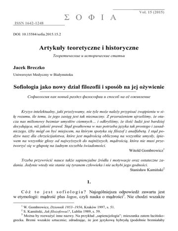 Σ Ο Φ Ι Α ISSN 1642-1248 Vol.NR 157/2007 (2015) ISSN 1642-1248 DOI: 10.15584/sofia.2015.15.2 Artykuły teoretyczne i historyczne Теоретические и исторические статьи Jacek Breczko Uniwersytet Medyczny w Białymstoku Sofiologia jako nowy dział filozofii i sposób na jej ożywienie Софиология как новый раздел философии и способ на её оживление Kryzys intelektualny, jaki przeżywamy, nie tyle może należy przypisać zwątpieniu w siłę rozumu, ile temu, że jego zasięg jest tak nieznaczny. Z przerażeniem ujrzeliśmy, że otacza nas milionowy bezmiar umysłów ciemnych… i odkryliśmy, że ilość ludzi jest bardziej decydująca, niż jakość prawd. Stąd gwałtowna w nas potrzeba języka tak prostego i zasadniczego, iżby mógł on być miejscem, na którym spotyka się filozof z analfabetą. I stąd podziw nasz dla chrześcijaństwa, które jest mądrością obliczoną na wszystkie umysły, śpiewem na wszystkie głosy od najwyższych do najniższych, mądrością, która nie musi przetworzyć się w głupotę na żadnym szczeblu świadomości. Witold Gombrowicz1 Trzeba przywrócić nauce także sapiencjalne źródła i motywacje oraz ostateczne zadania. Jedynie wtedy nie stanie się tyranem człowieka i nie uchybi jego godności. Stanisław Kamiński2 1. C ó ż t o j e s t s o f i o l o g i a ? Najogólniejsza odpowiedź zawarta jest w etymologii: mądrość plus logos, czyli nauka o mądrości3. Nie chodzi wszakże 1 W. Gombrowicz, Dziennik 1953–1956, Kraków 1997, s. 51. S. Kamiński, Jak filozofować?, Lublin 1989, s. 59. 3 Można by rozważyć inne nazwy. Na przykład „sapiencjologia”; mieszanka zatem łacińskogrecka. Brzmi wszakże sztucznie; zdradzając, że jest językową hybrydą (podobnie brzmiałaby 2 36 Jacek Breczko o philein-sophiję (o miłość do mądrości, kult mądrości), ale o coś, w czym przewodnikiem ma być rozum (logos), chłodny namysł. Sofiologia ma to być zatem systematyczny i analityczny – pod patronatem „szkiełka i oka” – namysł nad mądrością (jeśli z tego jakaś synteza wyjdzie, to dobrze; ale na wstępie badań przesądzić o tym nie sposób). Nie należy też mylić sofiologii z identycznie brzmiącą nazwą działu teologii (zwłaszcza prawosławnej), próbującej poznać mądrość bożą. Otóż – ujmując rzecz w wielkim skrócie – rosyjscy myśliciele religijni, tacy jak Sołowiow i Bułgakow, opierając się na schemacie neoplatońskim, próbowali pojąć dlaczego Bóg-absolut, będący wszak samowystarczalnym, stworzył świat (czy też wyemanował z siebie świat) i jak idee Boga, czyli mądrość boża, w tym świecie się realizują. Jest to zagadnienie fascynujące i fundamentalne, ale – gdy się patrzy na całość filozoficzno-teologicznej mapy – dosyć wąskie; szkoda by więc było, aby tak piękny termin do tego został ograniczony. Proponuję więc sofiologię „sprowadzić na ziemię” i uczynić z niej dział filozofii i nauki badający nie mądrość bożą, ale mądrość ludzką. Nie ma tu zresztą sprzeczności; można odróżnić sofiologię teologiczną (badającą mądrość Boga) od sofiologii filozoficznej (badającej mądrość ludzką). Już na wstępie pragnę jednak podzielić się wątpliwościami. Propozycja stworzenia nowej dziedziny badawczej, projektowanie nowego działu filozofii (i nauki) – a taki jest mój cel – przypomina porywanie się z motyką na słońce, a zatem wskazuje na brak umiaru, brak realizmu i zapoznanie swojego miejsca w szeregu; wydaje się więc to być pomysł wielce ryzykowny (prawdopodobieństwo powodzenia niewielkie, prawdopodobieństwo ośmieszenia wielkie). Pomysł zatem – krótko mówiąc – wręcz szalony. Szalony, czyli bardzo niemądry. Wyglądałoby więc na to, że stworzenie nauki o mądrości jest pomysłem skrajnie niemądrym. Ta ostatnia myśl nie wydaje się przekonująca; wygląda wręcz na redukcję do absurdu. Można sformułować inny jeszcze zarzut: „Po cóż mianowicie dzielić coś, co jest już i tak bardzo podzielone, rozdrobnione?”. Filozofia bowiem – ulegając ogólnonaukowej tendencji do specjalizacji, do tworzenia coraz bardziej szczegółowych dyscyplin i pól badawczych – coraz bardziej się różnicuje (wolno podejrzewać, że brak wielkich doktryn, brak wielkich nowych syntez jest rekompensowany pojawieniem się coraz to nowych działów filozofii). Po cóż zatem do owych przeróżnych „filozofii czegoś” dodawać kolejną? Po cóż do owego zgiełku dołą„mądrościologia”). Można by się też posłużyć terminem anglojęzycznym, który zdobywa pewną popularność w świecie anglosaskim, mianowicie wisdom reasearch. Wydaje się jednak, że polszczyznę bronić obecnie należy (ze szczególną mocą) przed anglicyzmami. Co więcej, mogłoby to sugerować – jako że głównym nurtem filozofii amerykańskiej jest pragmatyzm – łączenie mądrości ze skutecznością, ewentualnie z – docześnie i przyziemnie pojętym – pożytkiem (angielski utylitaryzm). Przełożenie zaś terminu wisdom reasearch na polski – jako na przykład, „dociekania mądrościowe” – również brzmi sztucznie. Sofiologia jako nowy dział filozofii i sposób na jej ożywienie 37 czać własny głos? To ważki argument; zważyć jednak należy, że sofiologia, jeśli powstanie i się wyodrębni, będzie miała cechy „sklejające”, scalające, syntetyzujące; będzie zatem niczym klej i łącznik. Istotną jej bowiem cechą jest – o czym będzie jeszcze mowa – pograniczność, interdyscyplinarność. Myślę więc, że warto spróbować. Pożytki, korzyści, a nawet rozliczne dobra, jeśli się uda – jeśli sofiologia, niczym piękna roślina, wyrośnie i zakwitnie – przeważą straty, gdyby się nie udało. Bo i jakież to straty? Odrobina papieru i atramentu oraz ośmieszenie jakiegoś prowincjonalnego filozofa; 