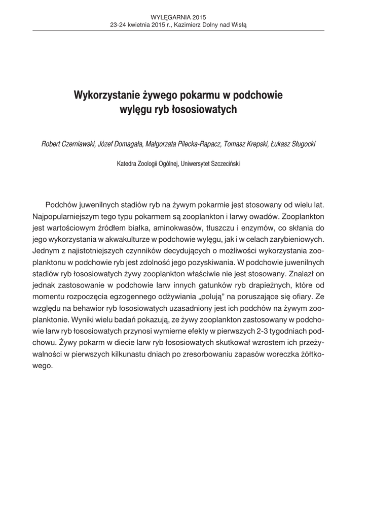 WYLÊGARNIA 2015 23-24 kwietnia 2015 r., Kazimierz Dolny nad Wis³¹ Wykorzystanie ¿ywego pokarmu w podchowie wylêgu ryb ³ososiowatych Robert Czerniawski, Józef Domaga³a, Ma³gorzata Pilecka-Rapacz, Tomasz Krepski, £ukasz S³ugocki Katedra Zoologii Ogólnej, Uniwersytet Szczeciñski Podchów juwenilnych stadiów ryb na ¿ywym pokarmie jest stosowany od wielu lat. Najpopularniejszym tego typu pokarmem s¹ zooplankton i larwy owadów. Zooplankton jest wartoœciowym Ÿród³em bia³ka, aminokwasów, t³uszczu i enzymów, co sk³ania do jego wykorzystania w akwakulturze w podchowie wylêgu, jak i w celach zarybieniowych. Jednym z najistotniejszych czynników decyduj¹cych o mo¿liwoœci wykorzystania zooplanktonu w podchowie ryb jest zdolnoœæ jego pozyskiwania. W podchowie juwenilnych stadiów ryb ³ososiowatych ¿ywy zooplankton w³aœciwie nie jest stosowany. Znalaz³ on jednak zastosowanie w podchowie larw innych gatunków ryb drapie¿nych, które od momentu rozpoczêcia egzogennego od¿ywiania „poluj¹” na poruszaj¹ce siê ofiary. Ze wzglêdu na behawior ryb ³ososiowatych uzasadniony jest ich podchów na ¿ywym zooplanktonie. Wyniki wielu badañ pokazuj¹, ze ¿ywy zooplankton zastosowany w podchowie larw ryb ³ososiowatych przynosi wymierne efekty w pierwszych 2-3 tygodniach podchowu. ¯ywy pokarm w diecie larw ryb ³ososiowatych skutkowa³ wzrostem ich prze¿ywalnoœci w pierwszych kilkunastu dniach po zresorbowaniu zapasów woreczka ¿ó³tkowego.