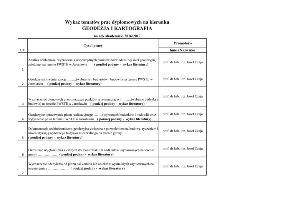 Wykaz tematów prac dyplomowych na kierunku GEODEZJA I KARTOGRAFIA na rok akademicki 2016/2017 Tytuł pracy Promotor Imię i Nazwisko L.P. Analiza dokładności wyznaczania współrzędnych punktów doświadczalnej sieci geodezyjnej założonej na terenie PWSTE w Jarosławiu ( poniżej podany - wykaz literatury) prof. dr hab. inż. Józef Czaja 1 2 Geodezyjna inwentaryzacja ……..(wybranych budynków i budowli) na terenie PWSTE w Jarosławiu ( poniżej podany - wykaz literatury) 3 Wyznaczenie pionowych przemieszczeń punktów reprezentujących ……..(wybrane budynki i budowle) na terenie PWSTE w Jarosławiu ( poniżej podany - wykaz literatury) 4 Geodezyjne opracowanie planu realizacyjnego ……..(wybranych budynków i budowli) oraz wytyczenie go na terenie PWSTE w Jarosławiu ( poniżej podany - wykaz literatury) 5 Dokumentacja architektoniczno-geodezyjna związana z pozwoleniem na budowę, tyczeniem i inwentaryzacją wybranego budynku mieszkalnego na terenie gminy …………………………. ( poniżej podany - wykaz literatury) 6 Określenie objętości mas ziemnych dla zwałowisk lub nadkładów usytuowanych na terenie gminy ……………… ( poniżej podany - wykaz literatury) Wyznaczenie odchylenia od pionu osi komina lub obiektów wysmukłych usytuowanych na terenie gminy ……………… ( poniżej podany - wykaz literatury) 7 prof. dr hab. inż. Józef Czaja prof. dr hab. inż. Józef Czaja prof. dr hab. inż. Józef Czaja prof. dr hab. inż. Józef Czaja prof. dr hab. inż. Józef Czaja prof. dr hab. inż. Józef Czaja Rozgraniczenie nieruchomości usytuowanej na terenie gminy …………………………. ( poniżej podany - wykaz literatury) prof. dr hab. inż. Józef Czaja Wznowienie granic nieruchomości usytuowanej na terenie gminy ……………………………… ( poniżej podany - wykaz literatury) prof. dr hab. inż. Józef Czaja Podział nieruchomości usytuowanej na terenie gminy …………………………… ( poniżej podany - wykaz literatury) prof. dr hab. inż. Józef Czaja 8 9 10 Każdy temat może być realizowany wielokrotnie dla różnych budowli i obiektów lub różnych nieruchomości. Jeśli w temacie występują pomiary geodezyjne to praca powinna być realizowana przez dwie osoby. Literatura od 1 do 7 tematu 1. J. Czaja: Wybrane zagadnienia z geodezji inżynieryjno. Kraków 1993 r. 2. W. Prószyński: Podstawy geodezyjnego wyznaczania przemieszczeń. Warszawa 2006 r. 3. J. Czaja: Modele statystyczne w informacji o terenie. Kraków 1997 r. od 1 4. J. Czaja i inni: Podstawy geomatyki. Kraków 2011 r. do Literatura od 8 - 10 tematu 10 1. Hycner R., Zagadnienia geodezyjno-prawne gospodarki nieruchomościami. Wydawnictwa GALL, Katowice 2006 r. 2. Durzyńska M., Rozgraniczenie i podział nieruchomości. LexisNexis. Warszawa 2009 r. 3. Śmiałowska - Uberman Z., Kompendium wiedzy prawnej dla geodetów. Wydawnictwa GALL, Katowice 2003 r. 4. Źróbek S iR, oraz Kuryj J. – Gospodarka nieruchomościami. Wydawnictwa GALL, Katowice 2011 r. Geodezyjna inwentaryzacja różnymi metodami wybranych budynków na terenie PWSTE w Jarosławiu - (praca dwu osobowa) prof. dr hab. inż. Józef Czaja dr inż. Malgorzata Szymczyk 11 12 Terenowa atestacja zgodnie z PN-ISO dalmierza elektrooptycznego w dwóch tachimetrach elektronicznych - (praca dwu osobowa) 13 Opracowanie mapy turystycznej ... . (jednoosobowa, x2) (Mapa turystyczna gminy lub większej miejscowości i okolic ) dr inż. Małgorzata Szymczyk dr inż. Stanislaw Szombara 14 Opracowanie dla celów inżynierskich danych z naziemnego skaningu lidarowego budynków ... . (dwuosobowa, x1 - budynki kampusu PWSTE) dr inż. Stanislaw Szombara Opracowanie mapy do Biegów na Orientację z terenu (1x, dwuosobowa) dr inż. Stanislaw Szombara Kartograficzne opracowanie danych dotyczących miejscowości (gmin) pochodzenia studentów PWSTE w Jarosławiu. (1x, jednoosobowa) dr inż. Stanislaw Szombara Redakcja mapy do biegów na orientację z terenu … (1x, dwuosobowa) dr inż. Stanislaw Szombara Geowizualizacja tras punktowanych Górskiej Odznaki Turystycznej. (kilka, jednoosobowe) dr inż. Stanislaw Szombara Implementacja obliczania Tabular Accuracy Indeks w programie ArcGIS. (1x, jednoosobowa) dr inż. Stanislaw Szombara Implementacja obliczania Boundary Accuracy Indeks w programie ArcGIS. (1x, jednoosobowa) dr inż. Stanislaw Szombara Implementacja obliczania Tabular Accuracy Indeks w programie QGIS. (1x, jednoosobowa) dr inż. Stanislaw Szombara Implementacja obliczania Boundary Accuracy Indeks w programie QGIS. (1x, jednoosobowa) dr inż. Stanislaw Szombara Implementacja algorytmu … w środowisku arcpy ArcGIS (1x, jednoosobowa) dr inż. Stanislaw Szombara 15 16 17 18 19 20 21 22 23 Wykorzystanie BDOT10k w redakcji mapy kropkowej ludności powiatu jarosławskiego (1x, jednoosobowa) dr inż. Stanislaw Szombara Redakcja mapy kodów pocztowych województwa podkarpackiego (1x, jednoosobowa) dr inż. Stanislaw Szombara Redakcja mapy ścieżek turystyki pieszej, rowerowej i konnej powiatu Jarosławskiego (1x, dwuosobowa) dr inż. Stanislaw Szombara Wykonanie modelu Gór Słonnych na podstawie Numerycznego Modelu Terenu. (1x, jednoosobowa) dr inż. Stanislaw Szombara Wykorzystanie narzędzi GIS do wyboru optymalnej lokalizacji … (2x, jednoosobowa) dr inż. Stanislaw Szombara Analiza zmian zabudowy Hrubieszowa na podstawie danych archiwalnych (1x, jednoosobowa, zarezerwowana) dr inż. Stanislaw Szombara 24 25 26 27 28 29 Zastosowanie pakietu Matlab do wyrównania wysokościowej osnowy geodezyjnej dr hab.inż. Edward Preweda prof. wiz. 30 Opracowanie aplikacji komputerowej umożliwiającej aproksymację powierzchni wraz z wizualizacją 31 dr hab.inż. Edward Preweda prof. wiz. Aplikacja komputerowa do wyrównania sieci płaskiej (np. przy zastosowaniu pakietu dr hab.inż. Edward Preweda prof. wiz. Maltab) 32 Projekt i realizacja bazy danych do wyznaczania przemieszczeń poziomych terenu przyległego do kopal