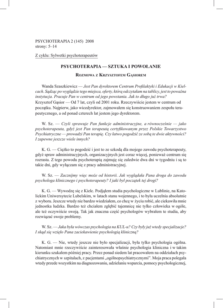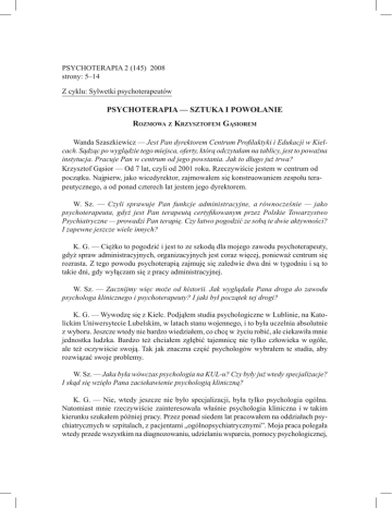 Psychoterapia 2 (145) 2008 strony: 5–14 Z cyklu: Sylwetki psychoterapeutów Psychoterapia — sztuka i powołanie Rozmowa z Krzysztofem Gąsiorem Wanda Szaszkiewicz — Jest Pan dyrektorem Centrum Profilaktyki i Edukacji w Kielcach. Sądząc po wyglądzie tego miejsca, oferty, którą odczytałam na tablicy, jest to poważna instytucja. Pracuje Pan w centrum od jego powstania. Jak to długo już trwa? Krzysztof Gąsior — Od 7 lat, czyli od 2001 roku. Rzeczywiście jestem w centrum od początku. Najpierw, jako wicedyrektor, zajmowałem się konstruowaniem zespołu terapeutycznego, a od ponad czterech lat jestem jego dyrektorem. W. Sz. — Czyli sprawuje Pan funkcje administracyjne, a równocześnie — jako psychoterapeuta, gdyż jest Pan terapeutą certyfikowanym przez Polskie Towarzystwo Psychiatryczne — prowadzi Pan terapię. Czy łatwo pogodzić ze sobą te dwie aktywności? I zapewne jeszcze wiele innych? K. G. — Ciężko to pogodzić i jest to ze szkodą dla mojego zawodu psychoterapeuty, gdyż spraw administracyjnych, organizacyjnych jest coraz więcej, ponieważ centrum się rozrasta. Z tego powodu psychoterapią zajmuję się zaledwie dwa dni w tygodniu i są to takie dni, gdy wyłączam się z pracy administracyjnej. W. Sz. — Zacznijmy więc może od historii. Jak wyglądała Pana droga do zawodu psychologa klinicznego i psychoterapeuty? I jaki był początek tej drogi? K. G. — Wywodzę się z Kielc. Podjąłem studia psychologiczne w Lublinie, na Katolickim Uniwersytecie Lubelskim, w latach stanu wojennego, i to była uczelnia absolutnie z wyboru. Jeszcze wtedy nie bardzo wiedziałem, co chcę w życiu robić, ale ciekawiła mnie jednostka ludzka. Bardzo też chciałem zgłębić tajemnicę nie tylko człowieka w ogóle, ale też oczywiście swoją. Tak jak znaczna część psychologów wybrałem te studia, aby rozwiązać swoje problemy. W. Sz. — Jaka była wówczas psychologia na KUL-u? Czy były już wtedy specjalizacje? I skąd się wzięło Pana zaciekawienie psychologią kliniczną? K. G. — Nie, wtedy jeszcze nie było specjalizacji, była tylko psychologia ogólna. Natomiast mnie rzeczywiście zainteresowała właśnie psychologia kliniczna i w takim kierunku szukałem później pracy. Przez ponad siedem lat pracowałem na oddziałach psychiatrycznych w szpitalach, z pacjentami „ogólnopsychiatrycznymi”. Moja praca polegała wtedy przede wszystkim na diagnozowaniu, udzielaniu wsparcia, pomocy psychologicznej, 6 Psychoterapia – sztuka i powołanie. Rozmowa z Krzysztofem Gąsiorem ale była to jednak głównie diagnostyka za pomocą testów psychologicznych. Pracowałem jako „technik psycholog”. W. Sz. — Gdzie Pan znalazł pierwszą pracę? Czy w Kielcach? K. G. — Nie, najpierw pracowałem dwa lata w Gdyni, w poradni zdrowia psychicznego. Trafiłem tam, bo ciekawiła mnie twórczość chorych psychicznie — pisałem pracę magisterską na ten temat. W Gdyni poznałem panią docent Magdalenę Tyszkiewicz, która zajmowała się malarstwem chorych na schizofrenię. Spędziłem tam dwa lata, ale potem koleje życia (małżeństwo, dziecko) pokierowały mną tak, że wróciłem z powrotem do Kielc, gdzie łatwiej mogłem znaleźć mieszkanie. Moja przygoda z psychoterapią zaczęła się tak naprawdę dość późno i trochę przypadkiem, ponieważ, gdy już zrobiłem specjalizację z psychologii klinicznej, zacząłem się zastanawiać nad tym, co jeszcze w życiu zrobić. I wtedy, w 1994 roku, pojawiła się okazja — w postaci trzyletniego kursu systemowej terapii rodzin, prowadzonego przez zespół profesora Bogdana de Barbaro z Zakładu Terapii Rodzin z Krakowa. Zapisałem się na ten kurs i to był znaczący przełom w moim życiu. Było to bardzo solidne szkolenie, na moje szczęście odbywało się w Kielcach, co miało wielki walor praktyczny. Odtąd w mojej pracy terapeutycznej towarzyszy mi myślenie systemowe. W. Sz. — Czyli to był prawdziwy początek drogi do psychoterapii? K. G. — Tak, ten kurs był moim pierwszym poważnym spotkaniem z psychoterapią. Pod jego wpływem — pracując wówczas na oddziale odwykowym dla kobiet — poszedłem szkolić się w Instytucie Psychiatrii i Neurologii w Warszawie już w zakresie psychoterapii ogólnej i równolegle — w zakresie terapii uzależnień w Instytucie Psychologii Zdrowia Towarzystwa Psychologicznego. Myślę teraz, że gdyby nie ten kurs, mógłbym nadal być „psychologiem technikiem”. W. Sz. — Czyli oprócz certyfikatu psychoterapeuty, ma Pan jeszcze jakieś inne? K. G. — Tak, jest to certyfikat psychoterapeuty uzależnień, zdobyty w Instytucie Psychologii Zdrowia Towarzystwa Psychologicznego i w ramach PARPA. Zdobyłem tam również certyfikat superwizora i zajmuję się superwizowaniem pracy z osobami uzależnionymi. W. Sz. — Teraz pomówmy o tym drugim zawodzie — o podjęciu przez Pana roli kierowniczej. Czy był Pan do niej zaproszony z racji swoich cech charakteru, predyspozycji, ambicji? Jakie były początki? K. G. — Moja działalność administracyjna, kierownicza to też trochę przypadek. W 1998 r. została w Kielcach zlikwidowana poradnia uzależnień i powstał pomysł zrekonstruowania i rozwinięcia dużej poradni wojewódzkiej. Ponieważ akurat byłem świeżo po kursach z zakresu terapii uzależnień, zaproponowano mi zorganizowanie placówki Psychoterapia – sztuka i powołanie. Rozmowa z Krzysztofem Gąsiorem 7 leczącej uzależnienia w ramach szpitala neuropsychiatrycznego. Powstała ona przy ul. Grunwaldzkiej. Powierzono mi funkcję kierowniczą i przez trzy lata budowałem tam mój pierwszy zespół. Potem pojawiła się propozycja stworzenia ośrodka profilaktycznego i psychoterapeutycznego. Wtedy Kielce i województwo były pod tym względem białą plamą na terenie Polski, nie było tu żadnego psychoterapeuty z certyfikatem. Właściwie do czasu tego pierwszego kursu z zakresu systemowej terapii rodzin w 1994 r. nie było osób, któr