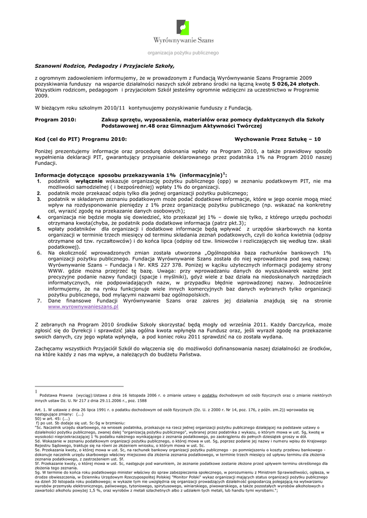organizacja pożytku publicznego Szanowni Rodzice, Pedagodzy i Przyjaciele Szkoły, z ogromnym zadowoleniem informujemy, że w prowadzonym z Fundacją Wyrównywanie Szans Programie 2009 pozyskiwania funduszy na wsparcie działalności naszych szkół zebrano środki na łączną kwotę 5 026,24 złotych. Wszystkim rodzicom, pedagogom i przyjaciołom Szkół jesteśmy ogromnie wdzięczni za uczestnictwo w Programie 2009. W bieżącym roku szkolnym 2010/11 kontynuujemy pozyskiwanie funduszy z Fundacją. Program 2010: Zakup sprzętu, wyposażenia, materiałów oraz pomocy dydaktycznych dla Szkoły Podstawowej nr.48 oraz Gimnazjum Aktywności Twórczej Kod (cel do PIT) Programu 2010: Wychowanie Przez Sztukę – 10 Poniżej prezentujemy informacje oraz procedurę dokonania wpłaty na Program 2010, a także prawidłowy sposób wypełnienia deklaracji PIT, gwarantujący przypisanie deklarowanego przez podatnika 1% na Program 2010 naszej Fundacji. Informacje dotyczące sposobu przekazywania 1% (informacyjnie) 1: 1. podatnik wyłącznie wskazuje organizację pożytku publicznego (opp) w zeznaniu podatkowym PIT, nie ma możliwości samodzielnej ( i bezpośredniej) wpłaty 1% do organizacji. 2. podatnik może przekazać odpis tylko dla jednej organizacji pożytku publicznego; 3. podatnik w składanym zeznaniu podatkowym może podać dodatkowe informacje, które w jego ocenie mogą mieć wpływ na rozdysponowanie pieniędzy z 1% przez organizację pożytku publicznego (np. wskazać na konkretny cel, wyrazić zgodę na przekazanie danych osobowych); 4. organizacja nie będzie mogła się dowiedzieć, kto przekazał jej 1% – dowie się tylko, z którego urzędu pochodzi otrzymana kwota(chyba, że podatnik poda dodatkowe informacja (patrz pkt.3); 5. wpłaty podatników dla organizacji i dodatkowe informacje będą wpływać z urzędów skarbowych na konta organizacji w terminie trzech miesięcy od terminu składania zeznań podatkowych, czyli do końca kwietnia (odpisy otrzymane od tzw. ryczałtowców) i do końca lipca (odpisy od tzw. liniowców i rozliczających się według tzw. skali podatkowej). 6. Na okoliczność wprowadzonych zmian została utworzona „Ogólnopolska baza rachunków bankowych 1% organizacji pożytku publicznego. Fundacja Wyrównywanie Szans została do niej wprowadzona pod swą nazwą: Wyrównywanie Szans – Fundacja i Nr. KRS 227 378. Poniżej w kąciku użytecznych informacji podajemy strony WWW. gdzie można przejrzeć tę bazę. Uwaga: przy wprowadzaniu danych do wyszukiwarek ważne jest precyzyjne podanie nazwy fundacji (spacje i myślniki), gdyż wiele z baz działa na niedoskonałych narzędziach informatycznych, nie podpowiadających nazw, w przypadku błędnie wprowadzonej nazwy. Jednocześnie informujemy, że na rynku funkcjonuje wiele innych komercyjnych baz danych wybranych tylko organizacji pożytku publicznego, bod mylącymi nazwami baz ogólnopolskich. 7. Dane finansowe Fundacji Wyrównywanie Szans oraz zakres jej działania znajdują się na stronie www.wyrownywanieszans.pl Z zebranych na Program 2010 środków Szkoły skorzystać będą mogły od września 2011. Każdy Darczyńca, może zgłosić się do Dyrekcji i sprawdzić jaka ogólna kwota wpłynęła na Fundusz oraz, jeśli wyraził zgodę na przekazanie swoich danych, czy jego wpłata wpłynęła, a pod koniec roku 2011 sprawdzić na co została wydana. Zachęcamy wszystkich Przyjaciół Szkół do włączenia się do możliwości dofinansowania naszej działalności ze środków, na które każdy z nas ma wpływ, a należących do budżetu Państwa. 1 Podstawa Prawna (wyciąg):Ustawa z dnia 16 listopada 2006 r. o zmianie ustawy o podatku dochodowym od osób fizycznych oraz o zmianie niektórych innych ustaw Dz. U. Nr 217 z dnia 29.11.2006 r., poz. 1588 Art. 1. W ustawie z dnia 26 lipca 1991 r. o podatku dochodowym od osób fizycznych (Dz. U. z 2000 r. Nr 14, poz. 176, z późn. zm.2)) wprowadza się następujące zmiany: (...) 50) w art. 45: (...) f) po ust. 5b dodaje się ust. 5c-5g w brzmieniu: "5c. Naczelnik urzędu skarbowego, na wniosek podatnika, przekazuje na rzecz jednej organizacji pożytku publicznego działającej na podstawie ustawy o działalności pożytku publicznego, zwanej dalej "organizacją pożytku publicznego", wybranej przez podatnika z wykazu, o którym mowa w ust. 5g, kwotę w wysokości nieprzekraczającej 1 % podatku należnego wynikającego z zeznania podatkowego, po zaokrągleniu do pełnych dziesiątek groszy w dół. 5d. Wskazanie w zeznaniu podatkowym organizacji pożytku publicznego, o której mowa w ust. 5g, poprzez podanie jej nazwy i numeru wpisu do Krajowego Rejestru Sądowego, traktuje się na równi ze złożeniem wniosku, o którym mowa w ust. 5c. 5e. Przekazania kwoty, o której mowa w ust. 5c, na rachunek bankowy organizacji pożytku publicznego - po pomniejszeniu o koszty przelewu bankowego dokonuje naczelnik urzędu skarbowego właściwy miejscowo dla złożenia zeznania podatkowego, w terminie trzech miesięcy od upływu terminu d la złożenia zeznania podatkowego, z zastrzeżeniem ust. 5f. 5f. Przekazanie kwoty, o której mowa w ust. 5c, następuje pod warunkiem, że zeznanie podatkowe zostanie złożone przed upływem terminu określonego dla złożenia tego zeznania. 5g. W terminie do końca roku podatkowego minister właściwy do spraw zabezpieczenia społecznego, w porozumieniu z Ministrem Sp rawiedliwości, ogłasza, w drodze obwieszczenia, w Dzienniku Urzędowym Rzeczypospolitej Polskiej "Monitor Polski" wykaz organizacji mających status organizacji pożytku publicznego na dzień 30 listopada roku podatkowego; w wykazie tym nie uwzględnia się organizacji prowadzących działalność gospodarczą polegającą na wytwarzaniu wyrobów przemysłu elektronicznego, paliwowego, tytoniowego, spirytusowego, winiarskiego, piwowarskiego, a także pozostałych wyrobów alkoholowych o zawartości alkoholu powyżej 1,5 %, oraz wyrobów z metali szlachetnych a