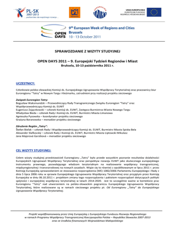 SPRAWOZDANIE Z WIZYTY STUDYJNEJ OPEN DAYS 2011 – 9. Europejski Tydzieo Regionów i Miast Bruksela, 10-13 października 2011 r. UCZESTNICY: Członkowie polsko-słowackiej Komisji ds. Europejskiego Ugrupowania Współpracy Terytorialnej oraz pracownicy biur Euroregionu “Tatry” w Nowym Targu i Kieżmarku, zatrudnieni przy realizacji projektu sieciowego Związek Euroregion Tatry: Bogusław Waksmundzki – Przewodniczący Rady Transgranicznego Związku Euroregion “Tatry” oraz Współprzewodniczący Komisji ds. EUWT Eugeniusz Zajączkowski – członek Komisji ds. EUWT, Zastępca Burmistrza Miasta Nowego Targu Władysław Bieda – członek Rady i Komisji ds. EUWT, Burmistrz Miasta Limanowa Agnieszka Pyzowska – koordynator projektu sieciowego Grażyna Baranowska – menadżer projektu sieciowego Združenie Región „Tatry”: Štefan Bieľak – członek Rady i Współprzewodniczący Komisji ds. EUWT, Burmistrz Miasta Spiska Bela Alexander Slafkovský – członek Rady i Komisji ds. EUWT, Burmistrz Miasta Liptowski Mikulasz Jana Majorová Garstková – menadżer projektu sieciowego CEL WIZYTY STUDYJNEJ: Celem wizyty studyjnej przedstawicieli Euroregionu „Tatry” było przede wszystkim poznanie rezultatów działalności Europejskich Ugrupowao Współpracy Terytorialnej oraz perspektyw rozwoju EUWT jako skutecznego europejskiego instrumentu prawnego, pozwalającego władzom terytorialnym na realizowanie współpracy transgranicznej, międzyregionalnej i transnarodowej na nowych zasadach. Wiąże się to również z opublikowanym w lipcu 2011 r. przez Komisję Europejską sprawozdaniem ze stosowania rozporządzenia (WE) 1082/2006 Parlamentu Europejskiego i Rady z dnia 5 lipca 2006 roku w sprawie Europejskiego Ugrupowania Współpracy Terytorialnej oraz przyjętym przez Komisję Europejska w dniu 06.10.2011 r. projektem zmiany tego rozporządzenia i pakietem rozporządzeo dotyczących polityki spójności i europejskiej współpracy terytorialnej w latach 2014-2020. Jest to szczególnie ważne w kontekście prac Euroregionu “Tatry” nad utworzeniem na polsko-słowackim pograniczu Europejskiego Ugrupowania Współpracy Terytorialnej, które realizowane są w ramach sieciowego projektu pt. Od Euroregionu „Tatry” do Europejskiego Ugrupowania Współpracy Terytorialnej. Projekt współfinansowany przez Unię Europejską z Europejskiego Funduszu Rozwoju Regionalnego w ramach Programu Współpracy Transgranicznej Rzeczpospolita Polska – Republika Słowacka 2007-2013 oraz ze środków finansowych Województwa Małopolskiego KRÓTKI OPIS WIZYTY STUDYJNEJ: W dniach 10-13 października 2011r. członkowie polsko-słowackiej Komisji ds. Europejskiego Ugrupowania Współpracy Terytorialnej przebywali w Brukseli, gdzie uczestniczyli w dziewiątej edycji Europejskiego Tygodnia Regionów i Miast OPEN DAYS. Wydarzenie, które zorganizowane zostało przez Komitet Regionów oraz Dyrekcję Generalną Komisji Europejskiej ds. Polityki Regionalnej, stanowiło forum spotkania dla reprezentantów najważniejszych instytucji Unii Europejskiej, posłów do Parlamentu Europejskiego, ekspertów z zakresu polityki regionalnej oraz licznie przybyłych przedstawicieli europejskich regionów, miast i organizacji społecznych. Dla blisko 6000 uczestników przygotowano ponad 100 seminariów, warsztatów, debat, wystaw i wydarzeo towarzyszących. Hasłem przewodnim tegorocznych OPEN DAYS było: „Inwestowanie w przyszłośd Europy: regiony i miasta tworzą inteligentny, zrównoważony i sprzyjający włączeniu społecznemu wzrost”, a kluczowe tematy koncentrowały się wokół następujących kwestii: - Europa 2020: w jaki sposób polityka spójności i fundusze strukturalne przyczyniają się do inteligentnego i zrównoważonego wzrostu gospodarczego sprzyjającego włączeniu społecznemu? - Lepsza realizacja: w jaki sposób UE może poprawid realizację polityki spójności teraz i po 2013 roku? - Znaczenie aspektu geograficznego: jaka jest przyszłośd współpracy terytorialnej i czego możemy nauczyd się od paostw trzecich? Spośród ponad 100 różnych debat i seminariów delegacja Euroregionu „Tatry” skoncentrowała swoją uwagę na tych, które dotyczyły zagadnieo związanych z tworzeniem i funkcjonowaniem Europejskich Ugrupowao Współpracy Terytorialnej, a także możliwości rozwoju współpracy transgranicznej w przyszłej polityce spójności Unii Europejskiej. Podczas seminariów bardzo istotna była możliwośd bezpośredniego kontaktu i rozmowy z przedstawicielami Komisji Europejskiej i Komitetu Regionów, instytucji wspierających Europejską Współpracę Terytorialną, takich jak INTERACT oraz działających i powstających EUWT. OPEN DAYS zbiegły się w czasie z rewizją dotychczasowych wyników stosowania rozporządzenia ws. EUWT oraz ogłoszeniem projektu jego zmian, dlatego wiele miejsca poświecono omówieniu tej problematyki. Europejski Tydzieo Regionów i Miast zdominowały również dyskusje o założeniach i celach Strategii Europa 2020 oraz opracowywanym przez Komisję Europejską pakiecie projektów rozporządzeo dotyczących Polityki Spójności w latach 2014-2020. Uczestnictwo w warsztatach i debatach pozwoliło wyjaśnid wiele wątpliwości, bezpośrednio skonfrontowad przepisy rozporządzenia z przykładami ich faktycznego stosowania, zebrad doświadczenia i wymienid poglądy z podmiotami, które planują utworzenie EUWT oraz już istniejącymi EUWT. Wizyta studyjna w Brukseli stała się również okazją do spotkania z przedstawicielami europejskich instytucji i organów doradczych. Na zaproszenie poseł do Parlamentu Europejskiego pani Róży Thun delegacja Euroregionu odwiedziła Parlament Europejski. Podczas rozmowy z panią poseł zaprezentowano Euroregion „Tatry” i jego działalnośd, przedstawiono perspektywy rozwoju i plany utworzenia EUWT. Dyskutowano również o rezultatach wykorzystania funduszy europejskich na obszarze pogranicza polsko-słowa